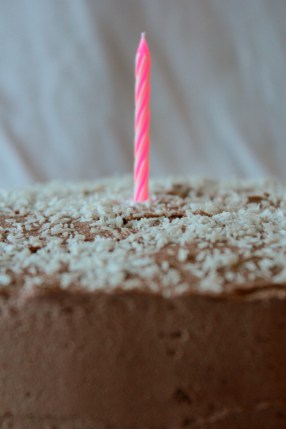 Heimasætan verður eins árs í dag og af því tilefni var að sjálfsögðu bökuð afmæliskakan góða sem systir mín var búin að gefa uppskriftina að í annarri færslu. Þegar skaparinn var að útdeila hæfileikum fékk ég eitthvað aðeins minna af nennu og dundhæfileikum en hún, ég fæ mig aldrei í að gera flottar afmæliskökur og gríp alltaf í hina hefðbundnu „tveggja hæða súkkulaðiköku með kremi á milli“.
