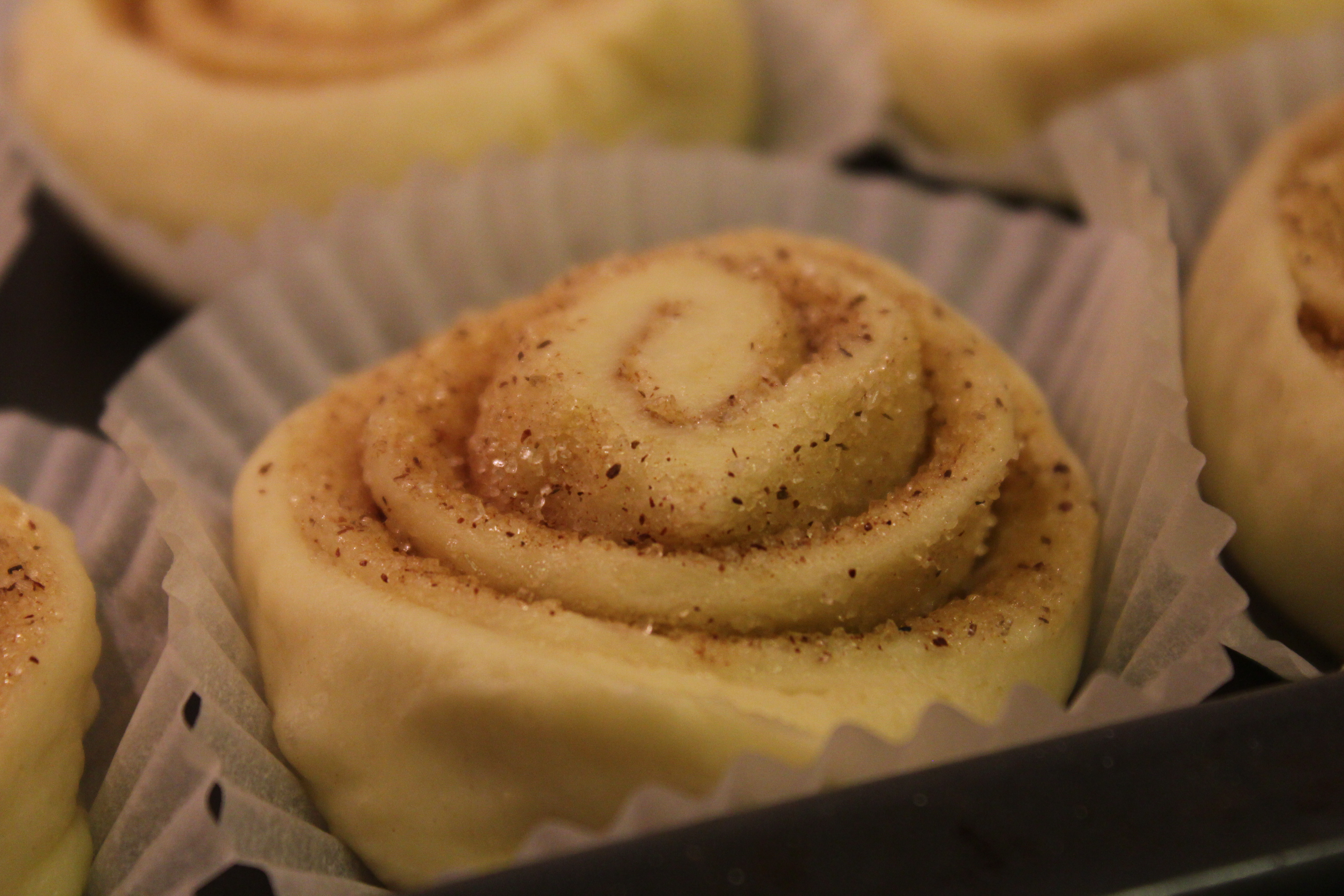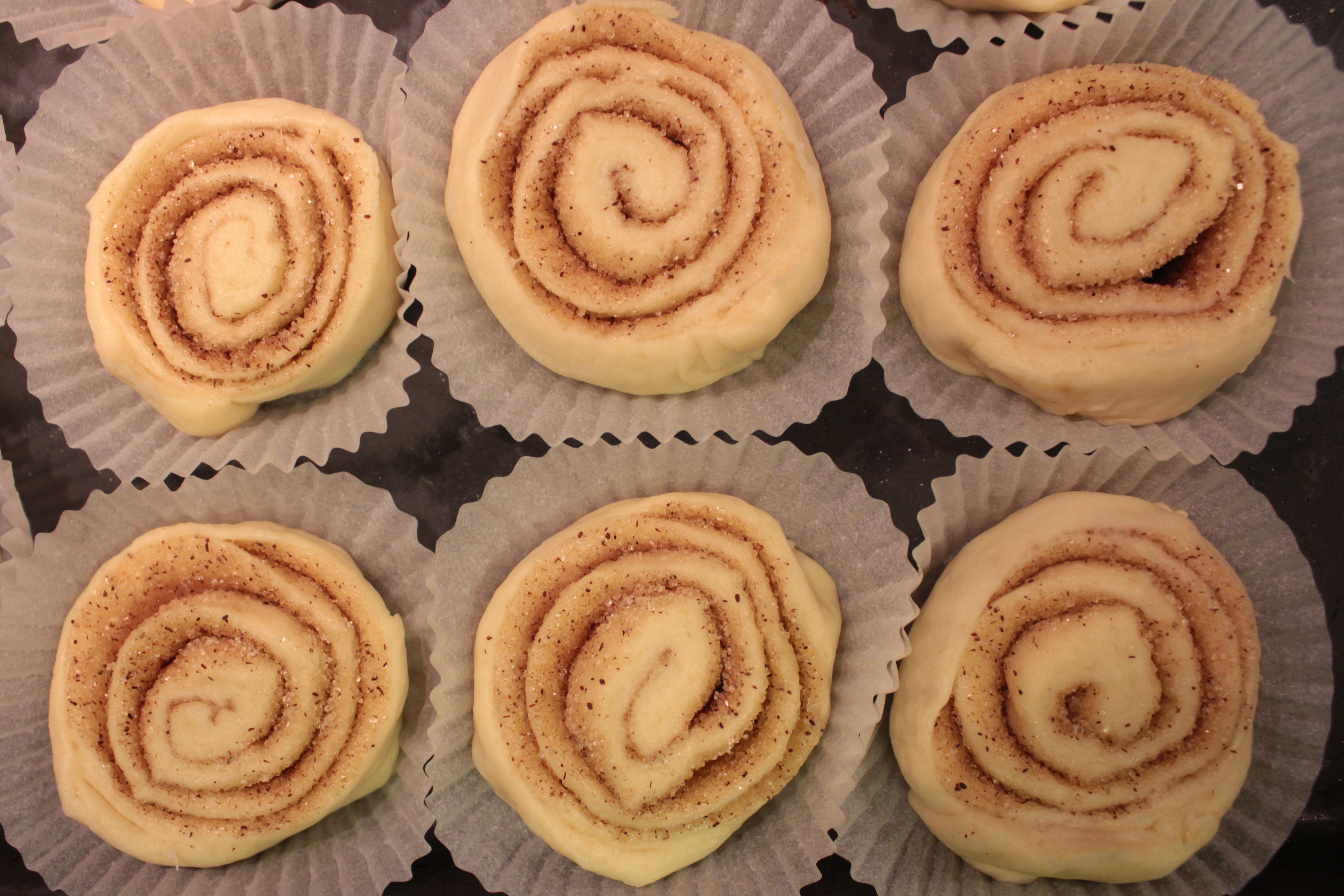 Skerið rúlluna í 2 cm breiða bita og setjið í pappírsform (ath þó að í Svíþjóð fást sérstök snúðaform, ég er ekki viss um að þau fáist á Íslandi. Þá sleppir maður þeim bara 🙂 ). Látið snúðana hefa sig undir viskustykki í 20 – 30 mínútur og stillið ofninn á 200 gr.