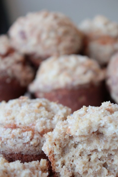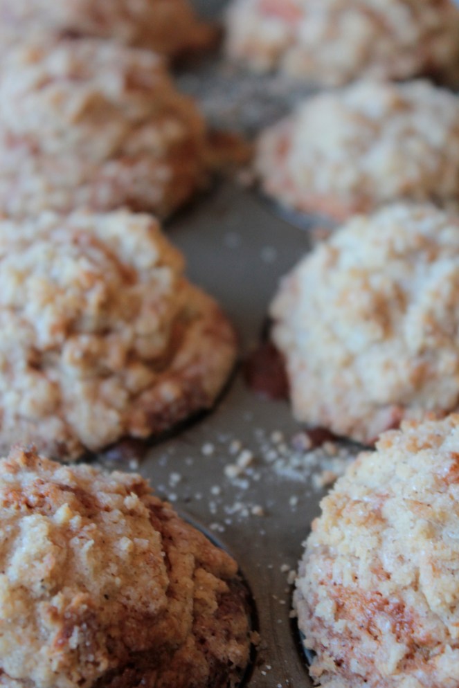 Þurrefnunum í mylsnunni blandað saman, smjörinu bætt við og mulið út í þannig að þetta verði að mylsnu. Dreift jafnt yfir óbökuð möffinsin.
