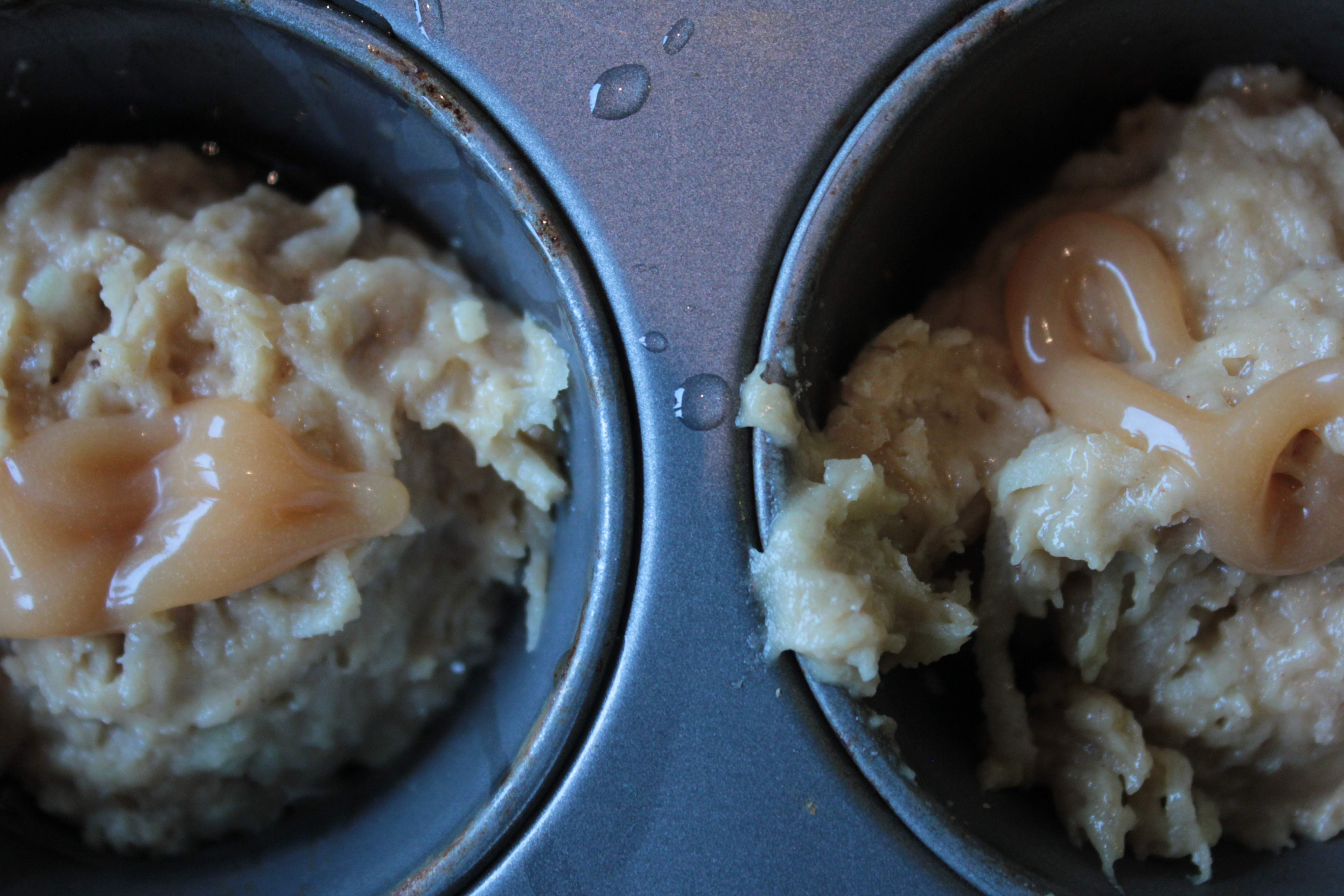 Muffins: setjið 1,5 msk af deigi í hvert form, setjið ca. tsk af karamellu ofan á deigið. Setjið aðra 1,5 msk af deigi ofan á. Mylsnu dreift yfir ef vill. Bakið í 15 – 18 mínútur eða þar til þau eru orðingullinbrún. Smá karamellusósa sett ofan á og hnetur ef vill.