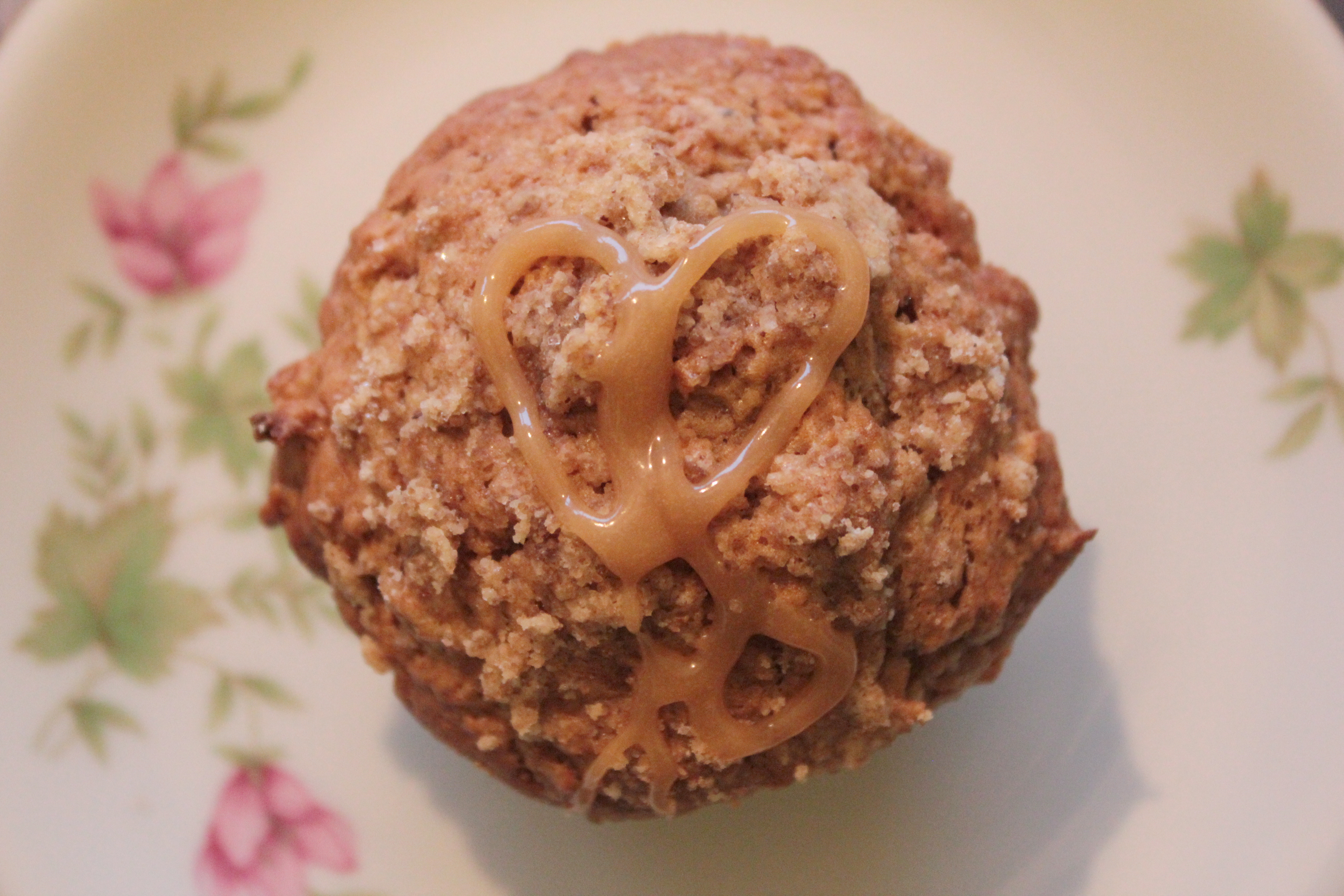 Ég ætlaði heldur upphaflega ekki að setja mylsnu ofan á brauðið en ég var að fá gest með mjólkuróþol og af því að hún mátti ekki fá karamellunna fannst mér ég þurfa að reyna fiffa aðeins hennar hluta af muffinsunum. Þegar ég var svo búin að búa til mylsnuna fannst mér upplagt að setja hana bara ofan á alla uppskriftina og karamelluna líka – bara bæði betra 😛