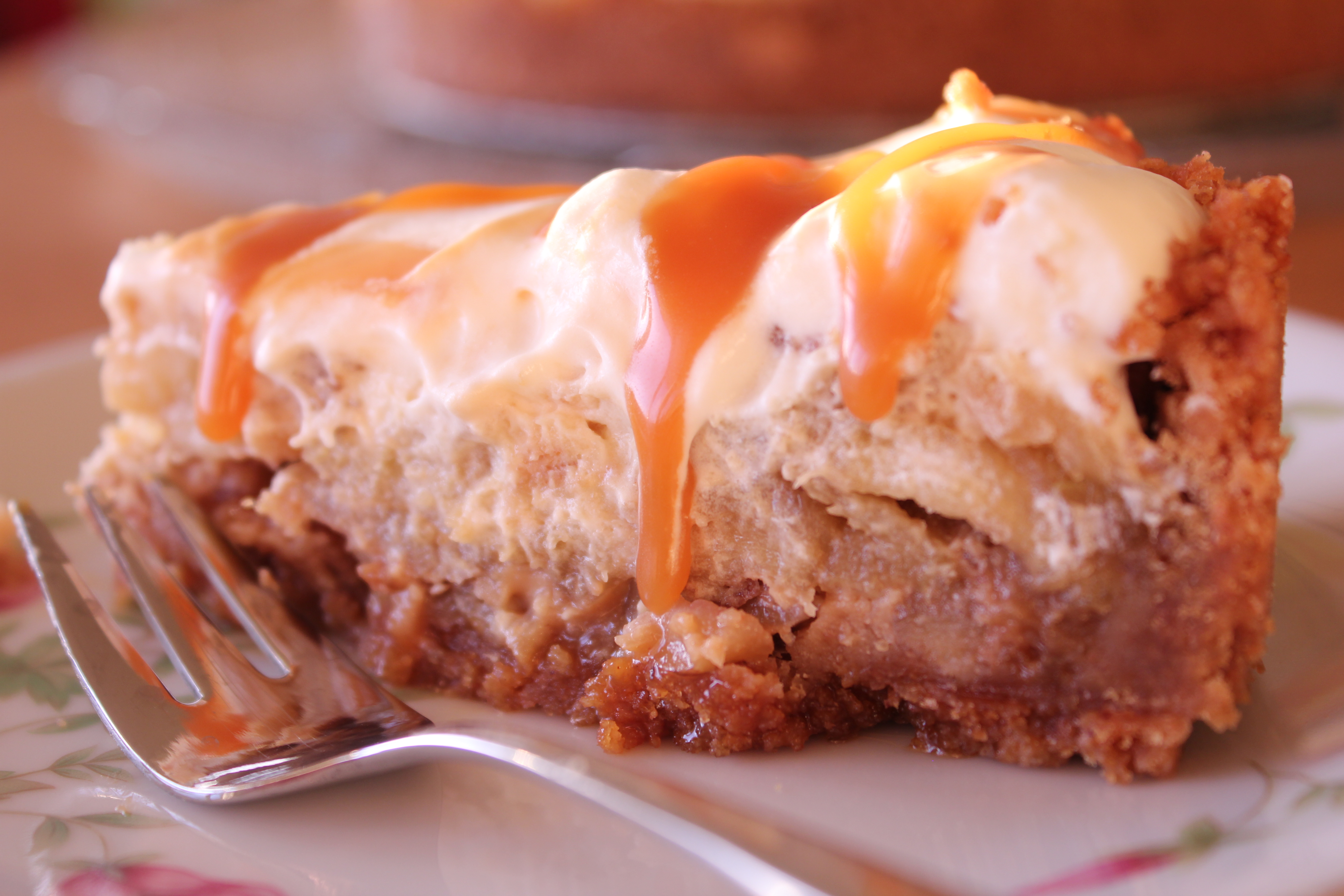 Ofninn er lækkaður í 175 gr. c. Ostakakan er búin til þannig að rjómaosturinn og sykurinn er þeytt saman í hrærvél þar til slétt. Vanillunni, egginu og sítrónusafanum er bætt við og hrært þar til alveg slétt, ca. 2 mínútur. Ostakökunni er dreift yfir eplin og bakað í u.þ.b. 30 mínútur eða þar til hnífur kemur hreinn úr miðjunni á kökunni. Látið kólna og svo sett í kæli í minnst 4 klst eða yfir nótt.
