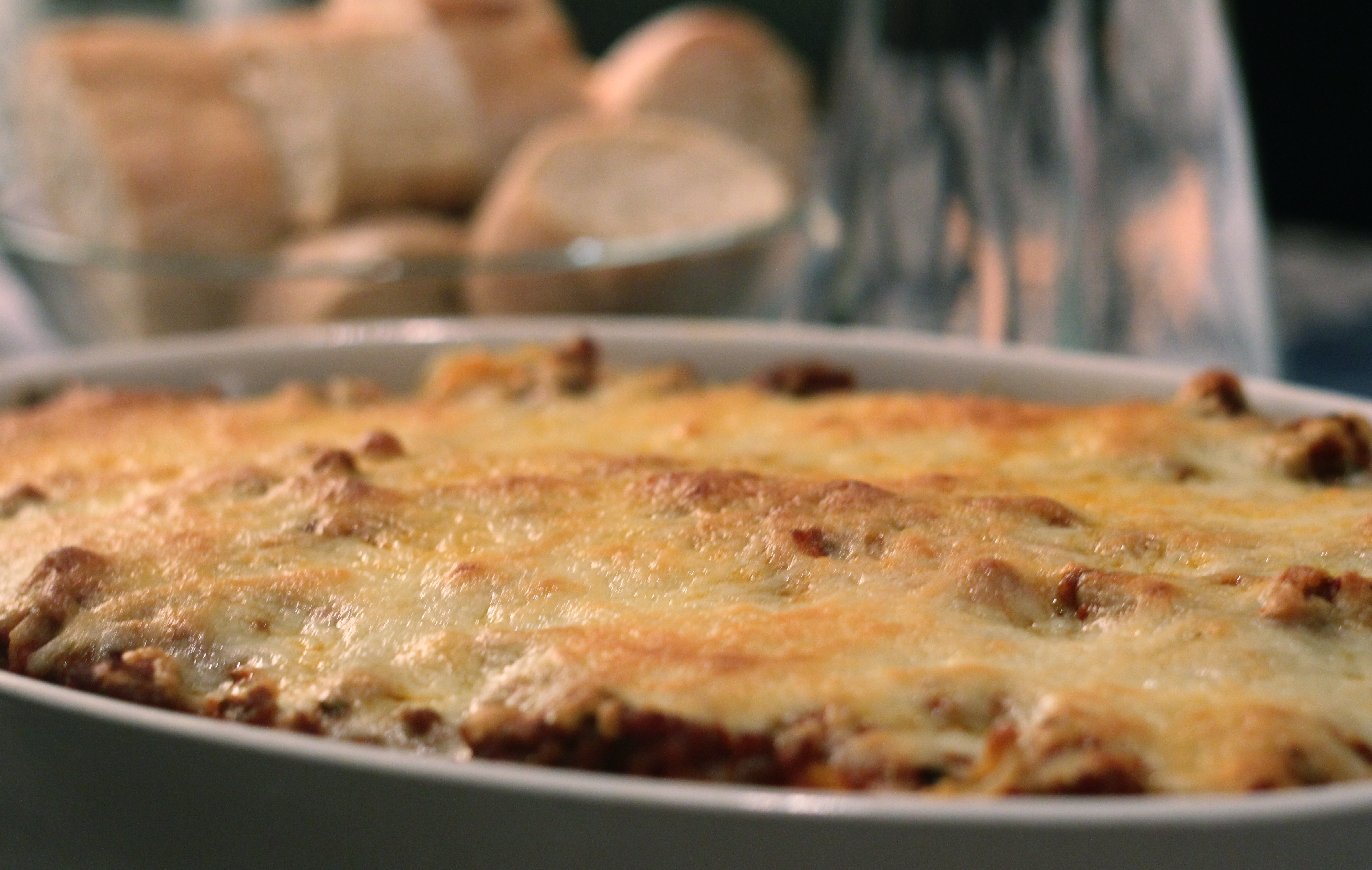 Smá kjötsósa sett í botninn á eldföstu móti, spaghettíinu hellt yfir og svo restinni af kjötsósunni. Að lokum er osturinn settur yfir.
