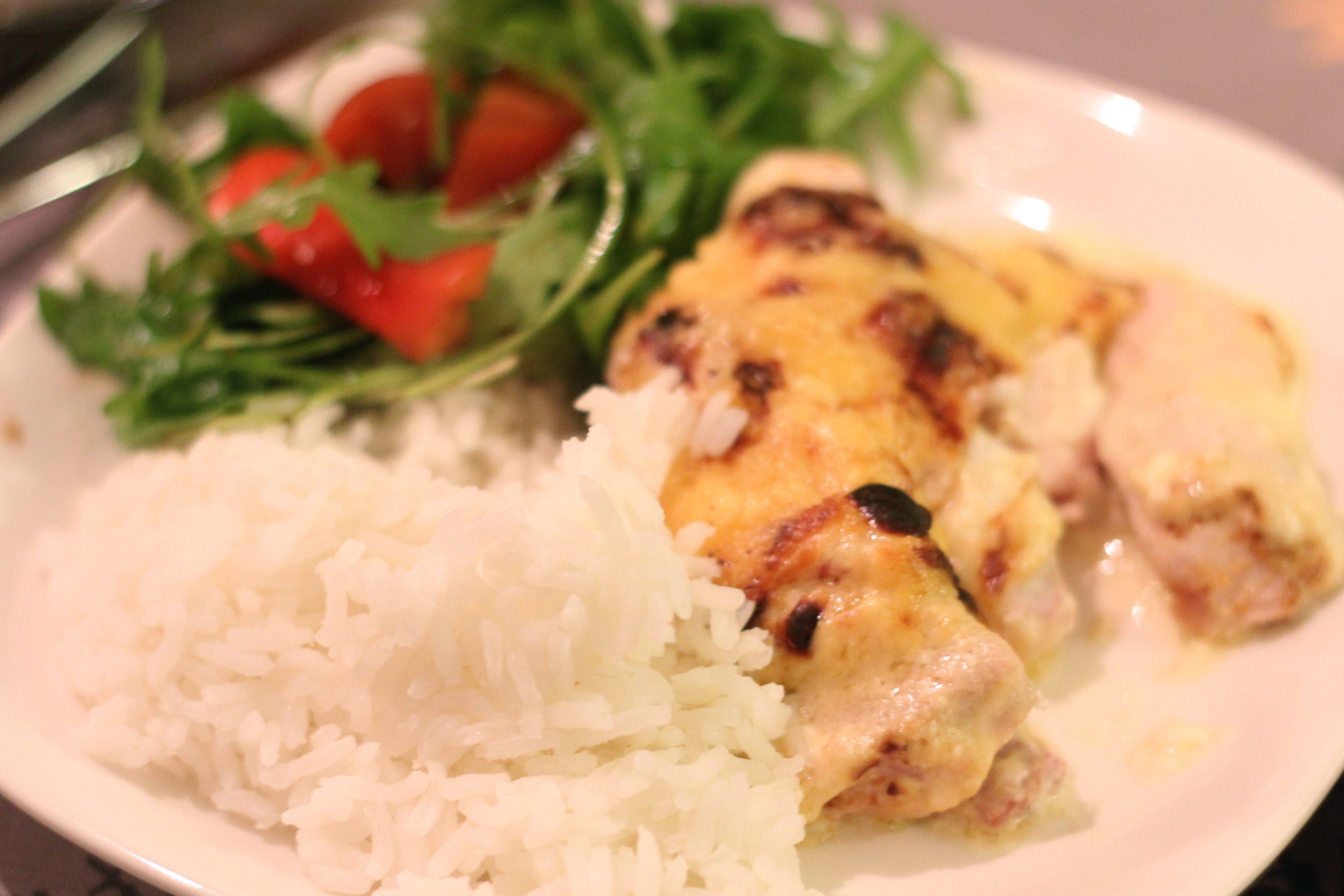 Þessi uppskrift, sem ég fann á matklubben.se, er alger djúsí-lúsi, svo ekki sé meira sagt. Aftur á móti var hún líka alveg rosalega bragðgóð (æji, er þetta ekki alltaf svona?). Strákarnir okkar geta verið svolítið miklir gikkir og beikonið var þeim engan vegin að skapi (það var nefnilega ekki svona stökkt eins og þegar maður steikir það á pönnu) en sósan fannst þeim æðisleg. Við bárum þetta fram með hrísgrjónum og salati.