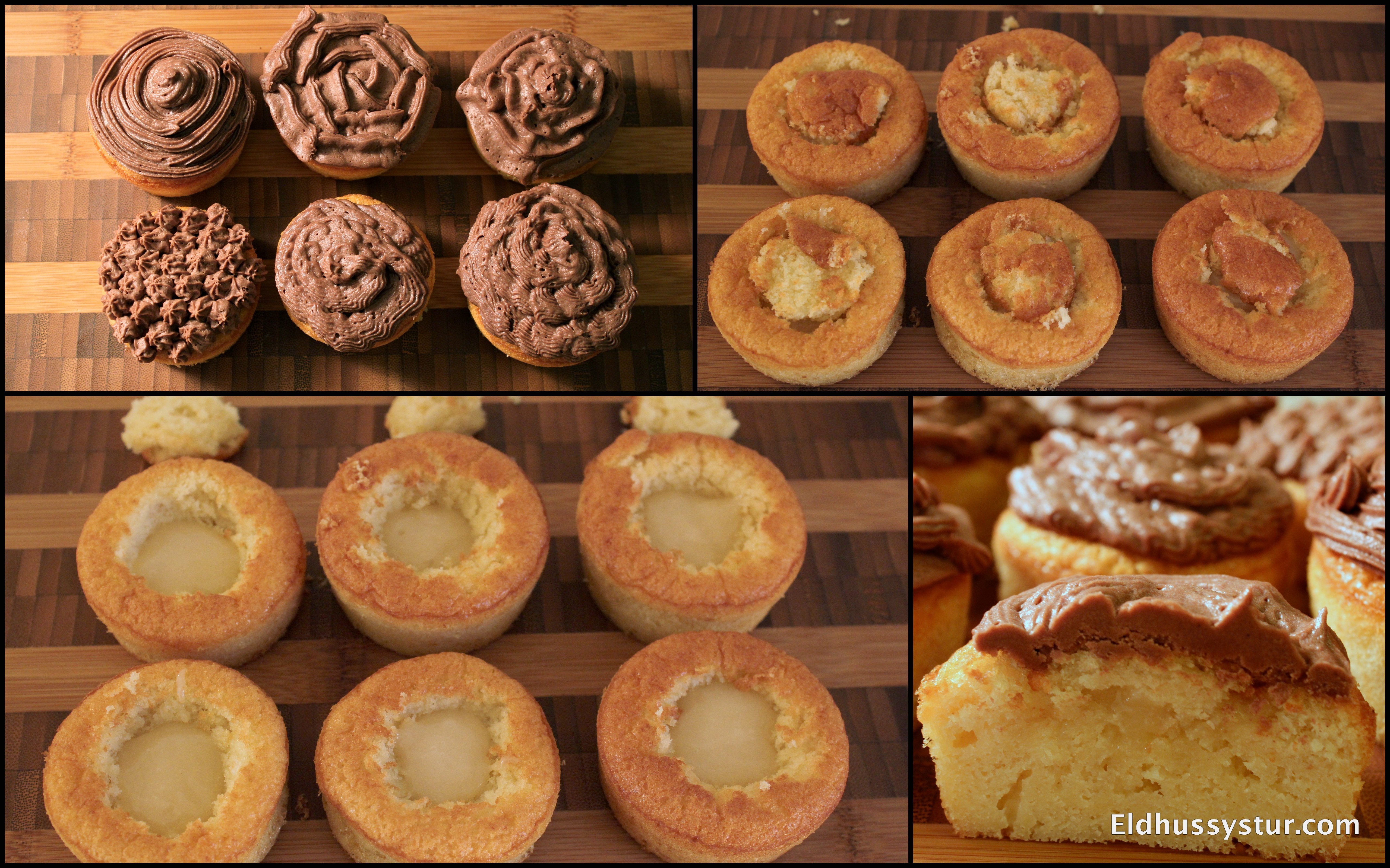 Þegar kökurnar eru alveg kaldar er skorinn hringur í kökuna ofanfrá og búin til hola, EKKI henda toppnum sem er skóflað uppúr. Setjið 1 tsk Lime curdið ofan í eða hvaða sultu sem ykkur finnst góð og setjið toppin aftur ofan á. Sprautið/smyrjið kreminu ofan á 🙂
