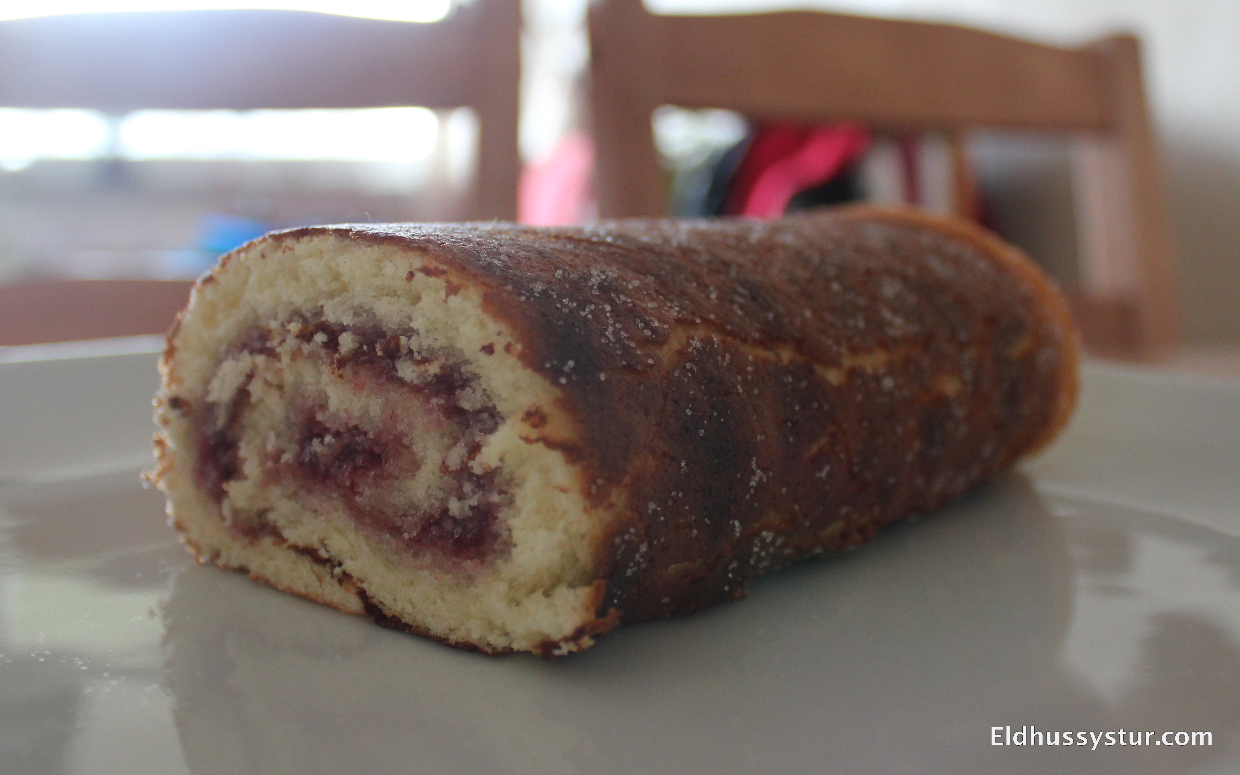 Ég bauð kunningjakonu minni í kaffi núna í morgun. Ég hugsaði með mér að það væri nú sniðugt að skella í rúllutertuna sem ég sá í bók á bókasafninu í gær. Tók mig ekki nema 20 min frá því að ég byrjaði og þangað til hún var tilbúin til átu 🙂