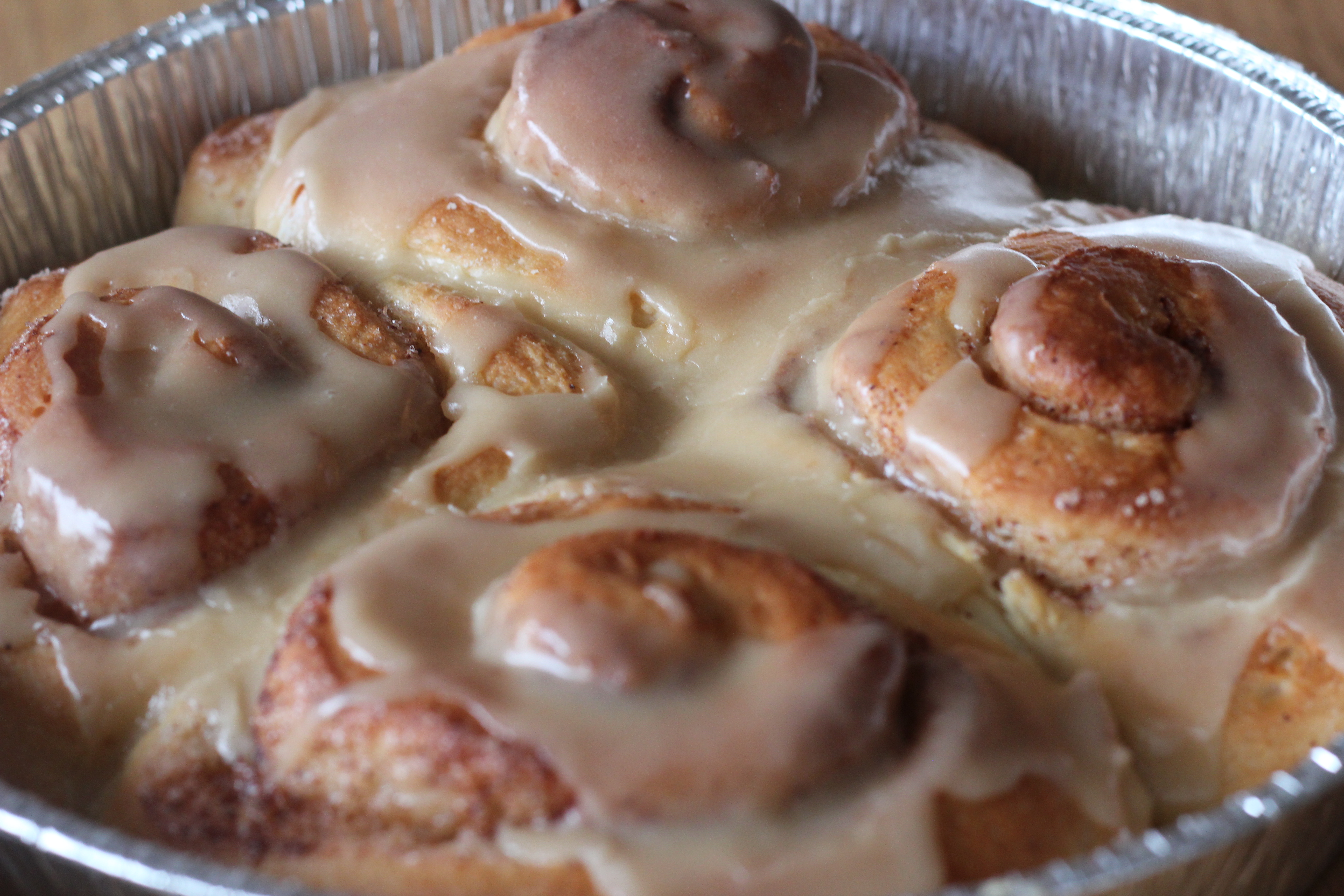 Á meðan snúðarnir bakast búið þá til fyllinguna með því að blanda öllum hráefnum saman. Á Íslandi er ekki til hlynsírópsbragðefni eins og pioneer woman notar þannig að ég hef yfirleitt helt ca. 3 msk hlynsírópi í kremið og minnkað magnið af mjólk á móti. Hellt yfir snúðana meðan þeir eru heitir (mér finnst það aaafar mikilvægt því þá fer kremið betur inn í þá 😉 )