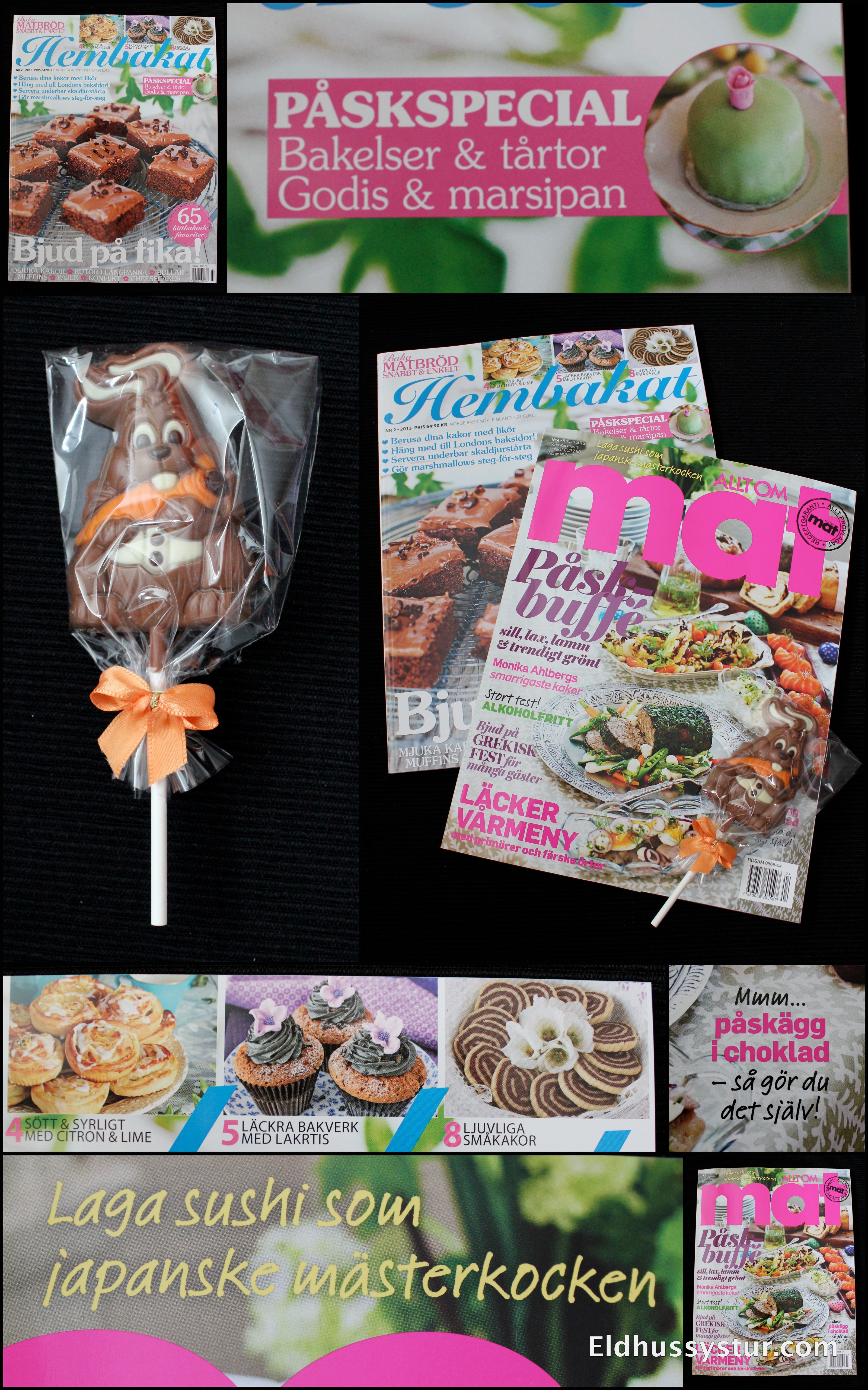 Verðlaunin, sem voru leynileg, voru sænsk sem eru í miklum metum hjá okkur. Annað heitir Hembakat, og fjallar eins og nafnið gefur til kynna mest um bakstur og sætindi, en hitt heitir Allt om Mat og fókuserar mest á matseld. Svo í tilefni páskanna fylgdi ein krúttleg, lítil súkkulaðipáskakanína með í kaupunum.