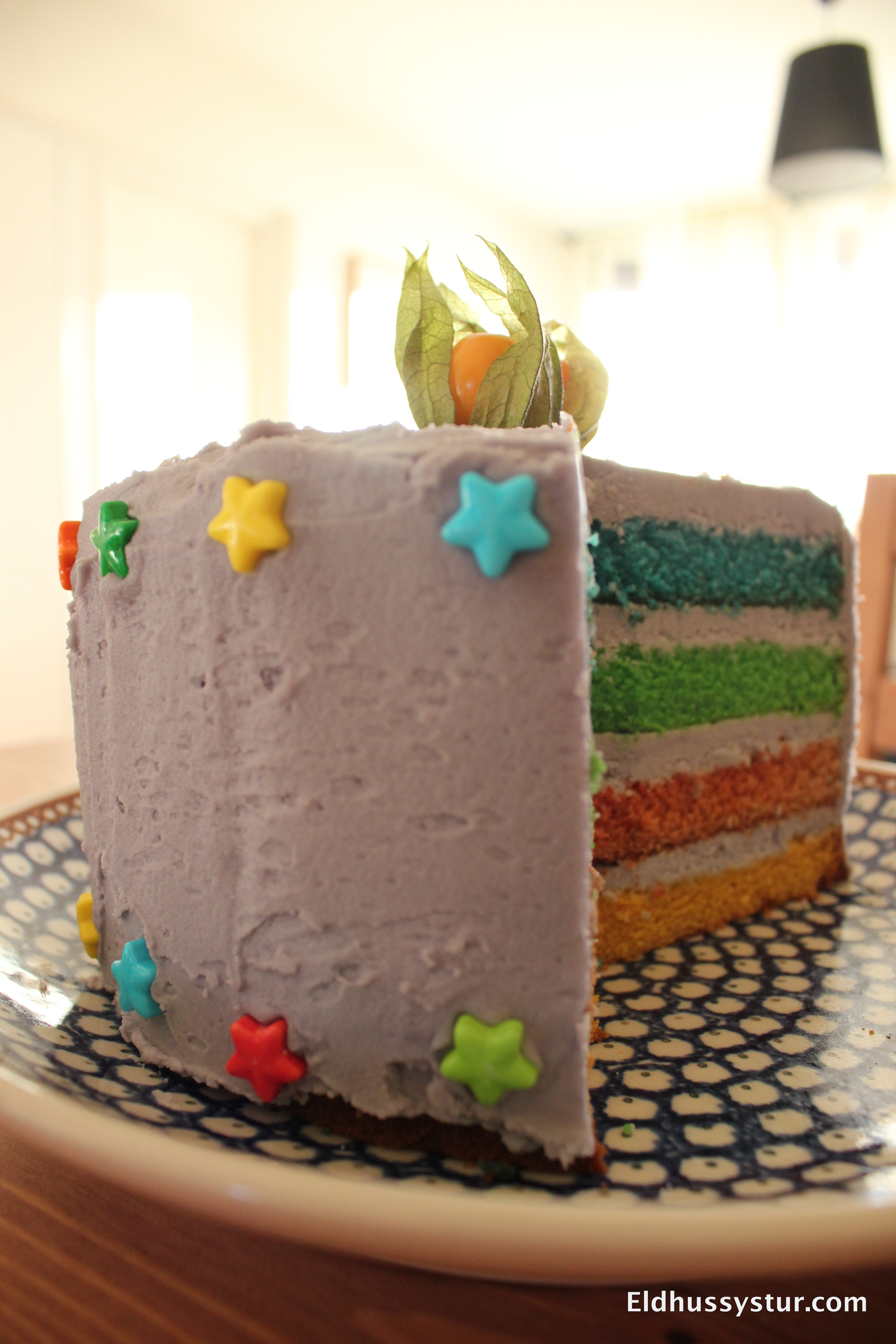 Þrátt fyrir smá panik þegar ég var að gera kremið þá kom þetta allt vel út og ég var mjög sátt við útkomuna. Þar sem kakan er mjög litskrúðug þá þarf ekki að skreita hana mikið og notaði ég sykur stjörnur og blæjuber til að setja punktinn yfir i-ið.