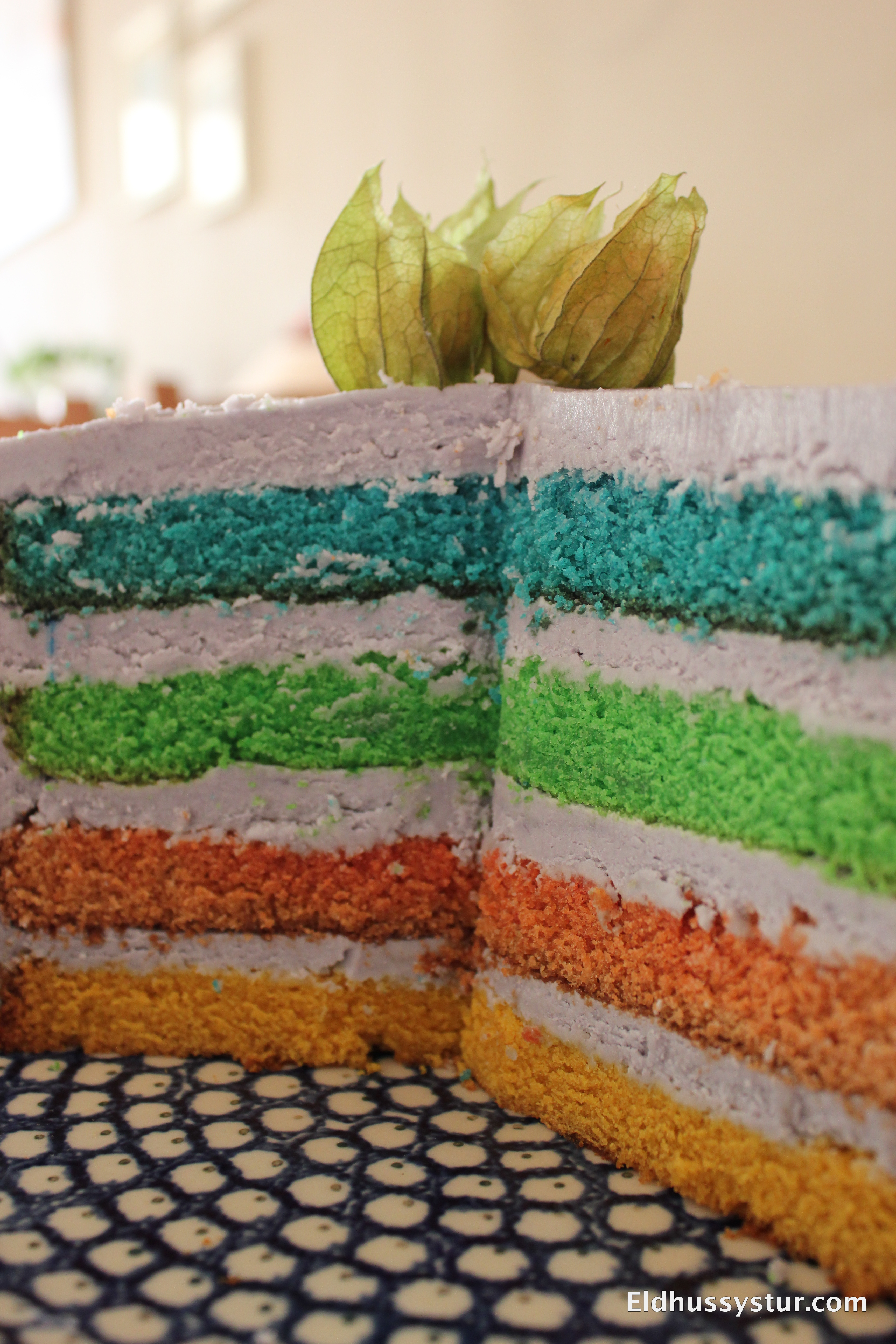 Betri helmingurinn varð þrítugur núna um helgina, fullkomið tækifæri til að gera fjögurra hæða regnbokaköku 😉 Ég nota alltaf sömu uppskriftina þegar kemur að því að baka afmæliskökur.