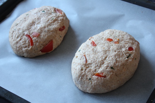 Eins og mér finnst gaman að gerbakstri þá er ég ekkert rosalega dugleg við að prófa nýja brauðuppskriftir. Ég er samt alltaf að reyna að horfa í kringum mig og finna eitthvað spennandi og um daginn sá ég uppskrift að tómat- og mozzarellabrauði í sænska tímaritinu Bakat. Ég ákvað að það hlyti að vera gott með ítölsku grænmetissúpunni sem ég geri oft þegar við fáum gesti í hádegismat og það reyndist vera rétt því brauðið var ofsalega gott. Uppskriftin er stór, fjögur ágætlega stór brauð en það kom ekki að sök því ég frysti þá bara restina af brauðinu. Ég mæli alveg með að prófa þessa uppskrift ef ykkur langar að brydda upp á einhverri nýjung í brauðbakstrinum 🙂