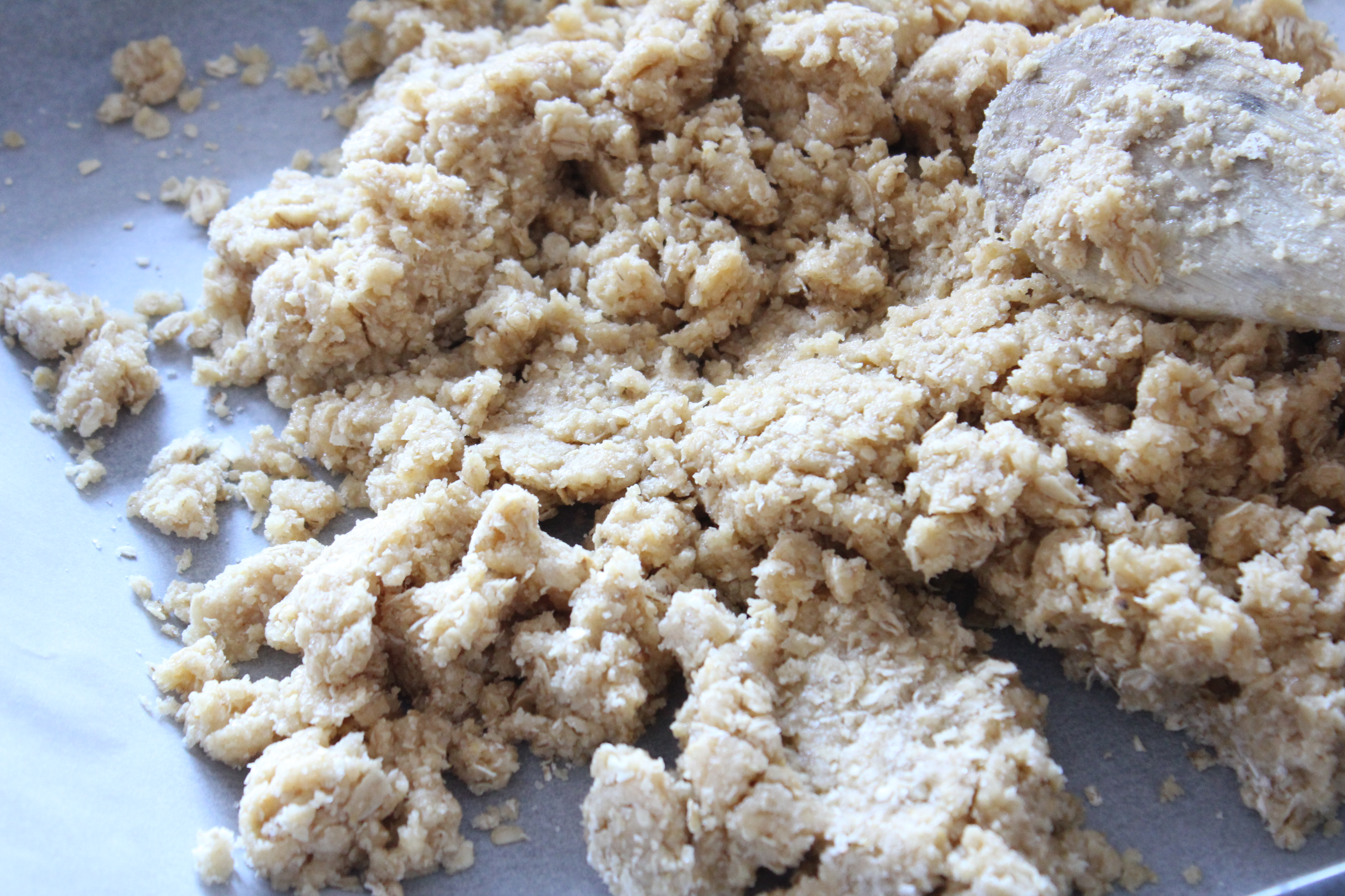 Blandið saman hveiti, sykri, haframjöli og lyftidufti.