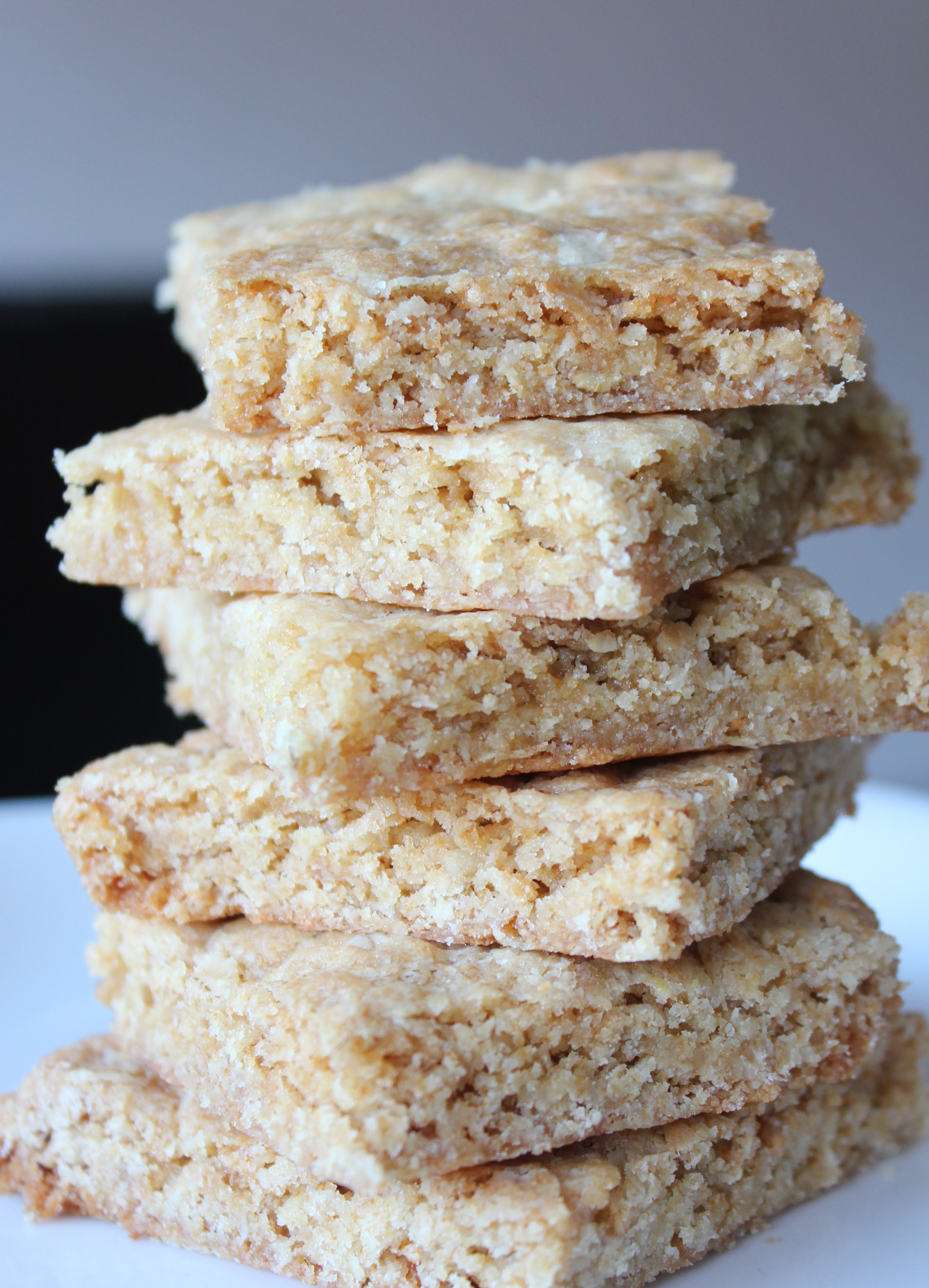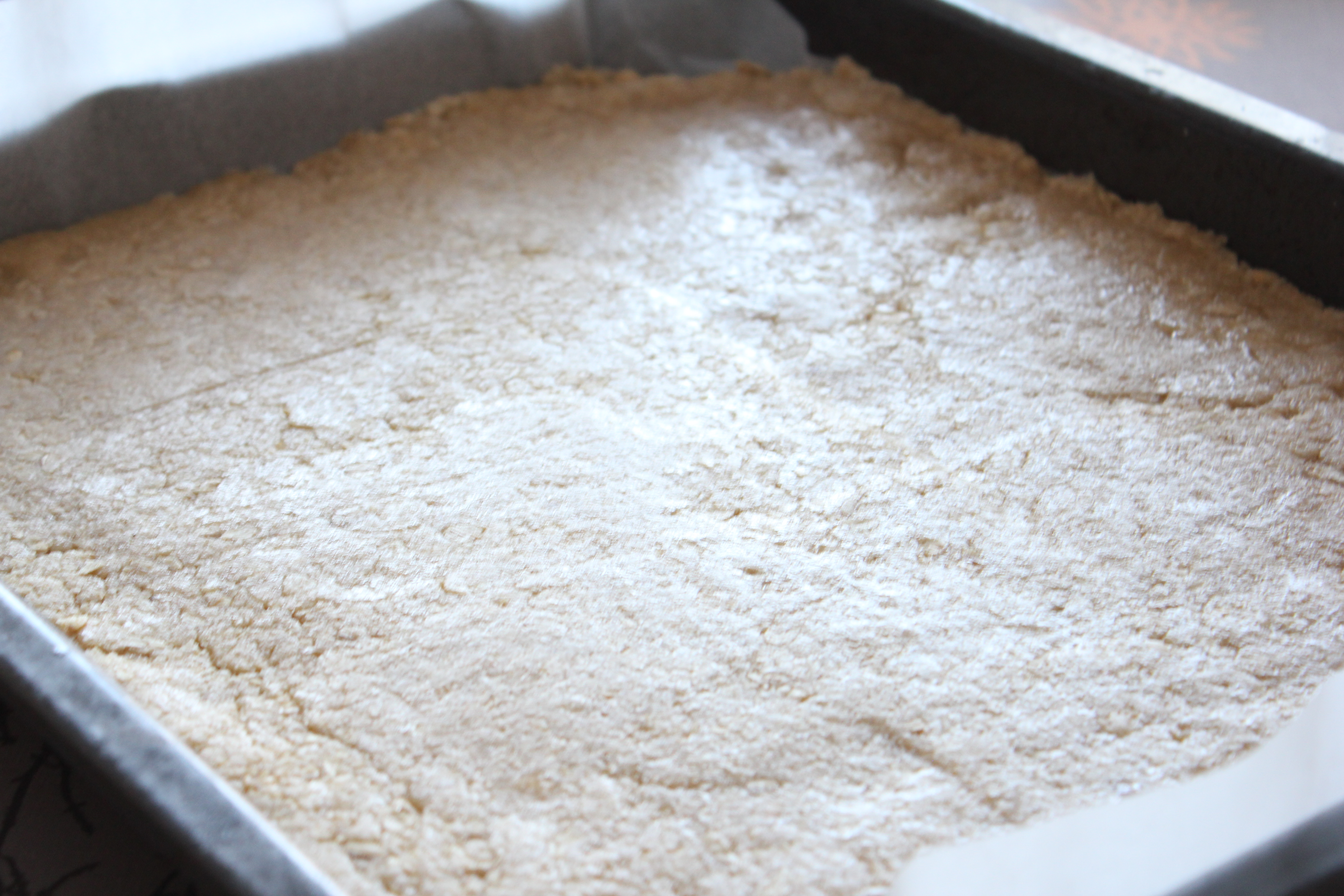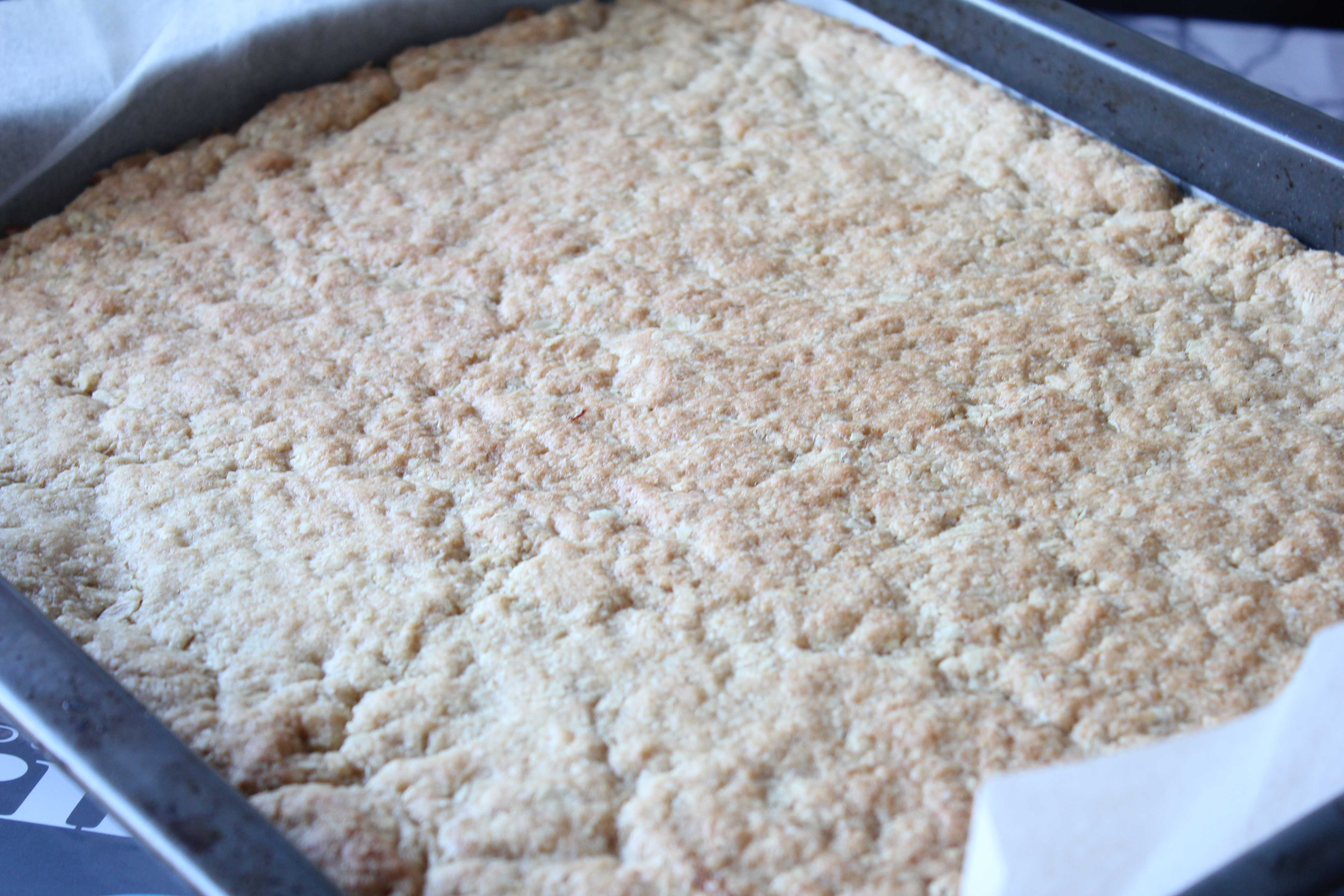 Klæðið bökunarplötu með bökunarpappír. Setjið deigið á plötuna og dreifið vel úr því og þjappið aðeins ofan í plötuna (ég notaði fyrst puttana og svo lítil kökukefli). Bakið í 15 – 18 mínútur. Ekki baka of lengi, kakan mun líta út fyrir að vera aðeins of lítið bökuð en hún á að sökkva aðeins saman eftir að hún kemur úr ofninum , annars verður hún þurr og hörð. Látið kólna og skerið svo í bita.