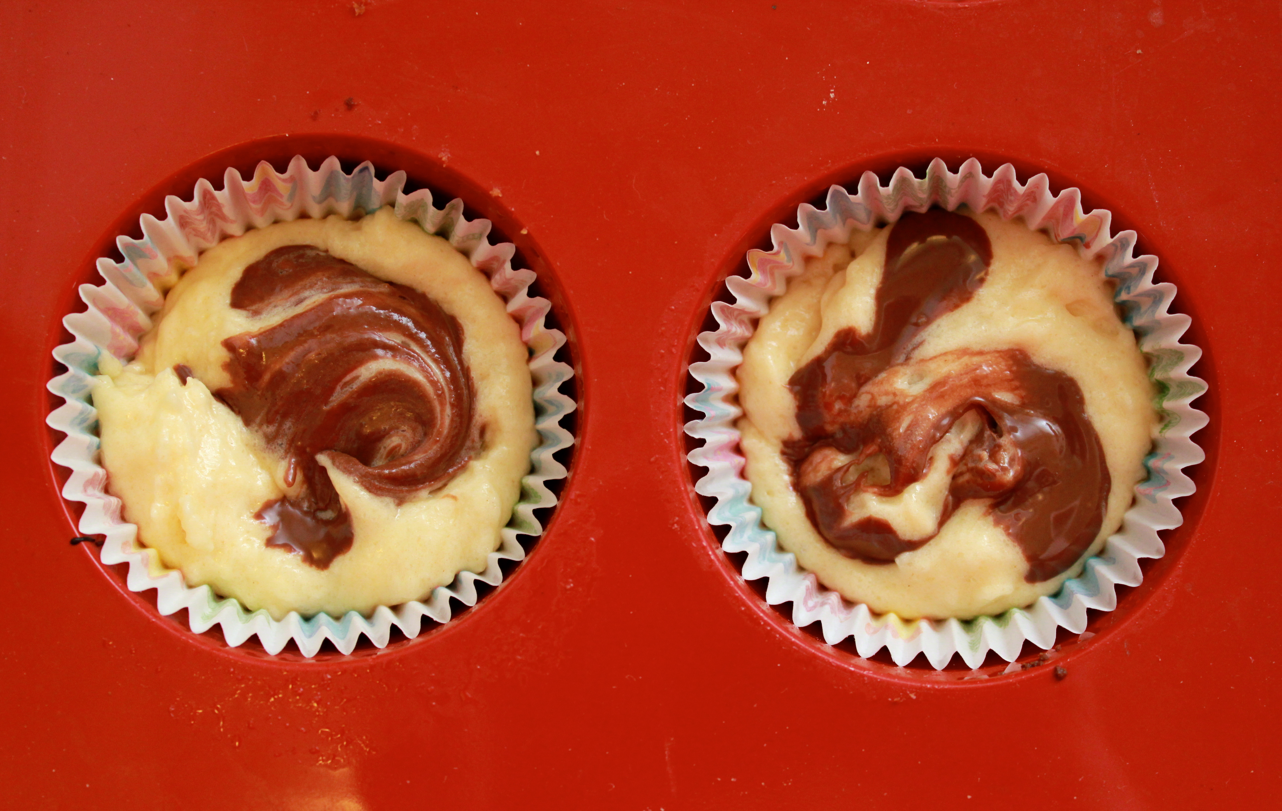 Setjið deigið í muffins form og eina teskeið af nutella ofaná. Notið prjón til að hræra 1-2 hringi í deiginu eftir að nutella er komið ofaná til að sameina það eilítið við deigið.