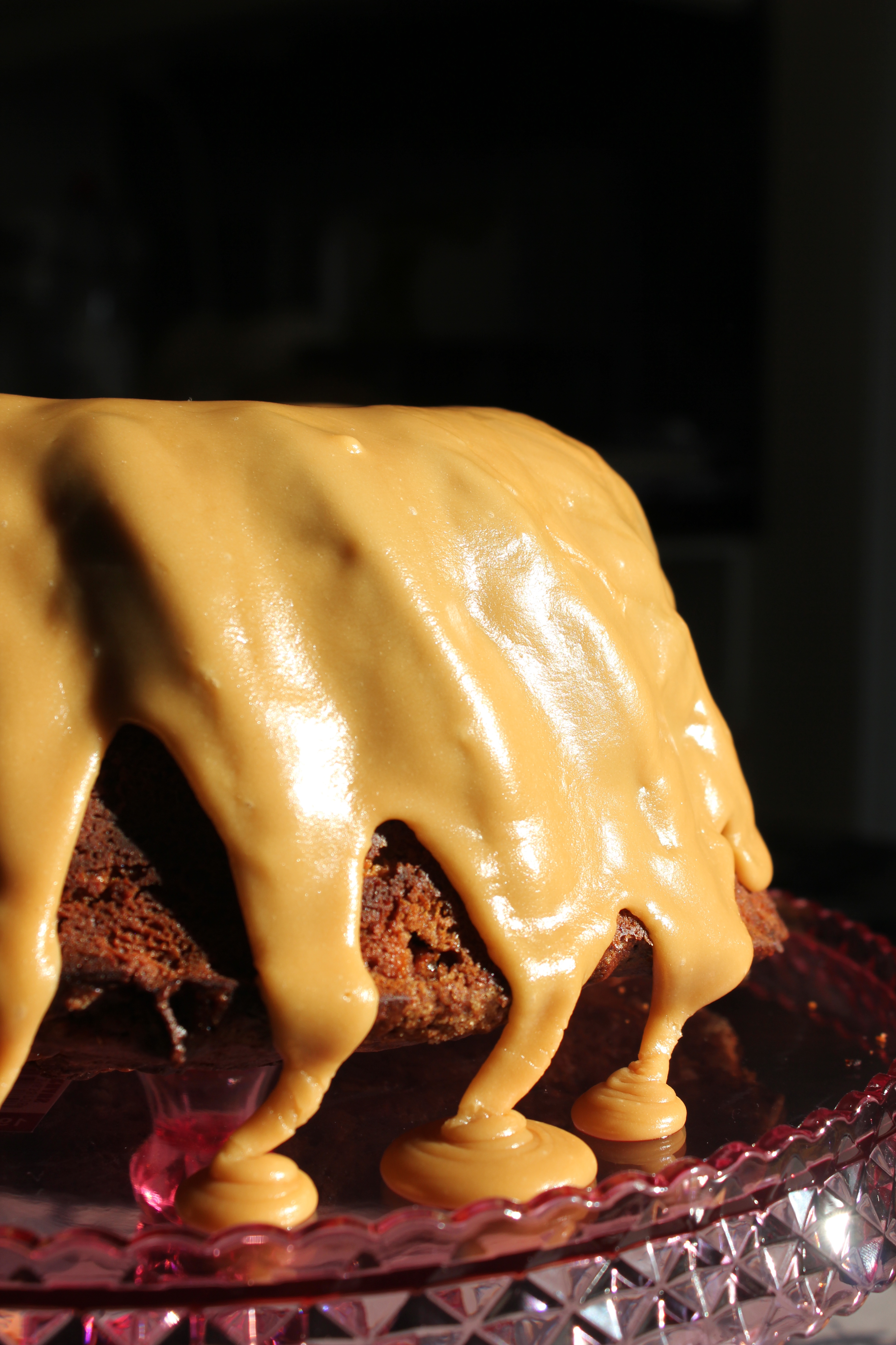 Setjið púðurusykurinn, smjörið og mjólkina í lítinn pott og bræðið yfir lágum hitta, hrærið stöðugt í. Látið suðuna koma upp og sjóðið í 1 mínútu. Fjarlægið af hitanum og setjið vanilludropana út í. Setjið flórsykurinn út í í nokkrum skömmtum og hrærið vel í á milli í ca. 3 mínútur eða þar til blandan er farin að kólna og þykkna aðeins. Hellið strax yfir kökuna (annars verður kremið of þykkt og erfitt að hella því á). Skreytið með pekanhnetum.