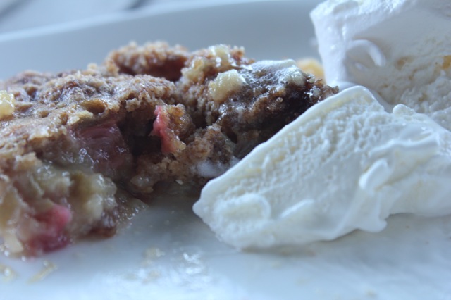 Tengdapabbi býr fyrir vestan, nánar til tekið í Hnífsdal. Þegar við fjölskyldan höfum farið að heimsækja hann og fjölskylduna hans þá hefur þessi rabarbarabaka oft verið borin á borð. Ég á ekki til nógu góð lýsingarorð til að lýsa þessari sælu 🙂 Því er kannski best lýst með því að segja frá því að oftar en ekki sit ég og borða nánast uppúr forminu þegar allir hinir eru búnir að fá nóg, ég get bara ekki hamið mig. Þessi uppskrift kemur frá tengdamömmu hans tengdapabba (en hún býr líka í Hnífsdal) og verður hún því hér með nefnd Rabarbarabaka úr Hnífsdal.