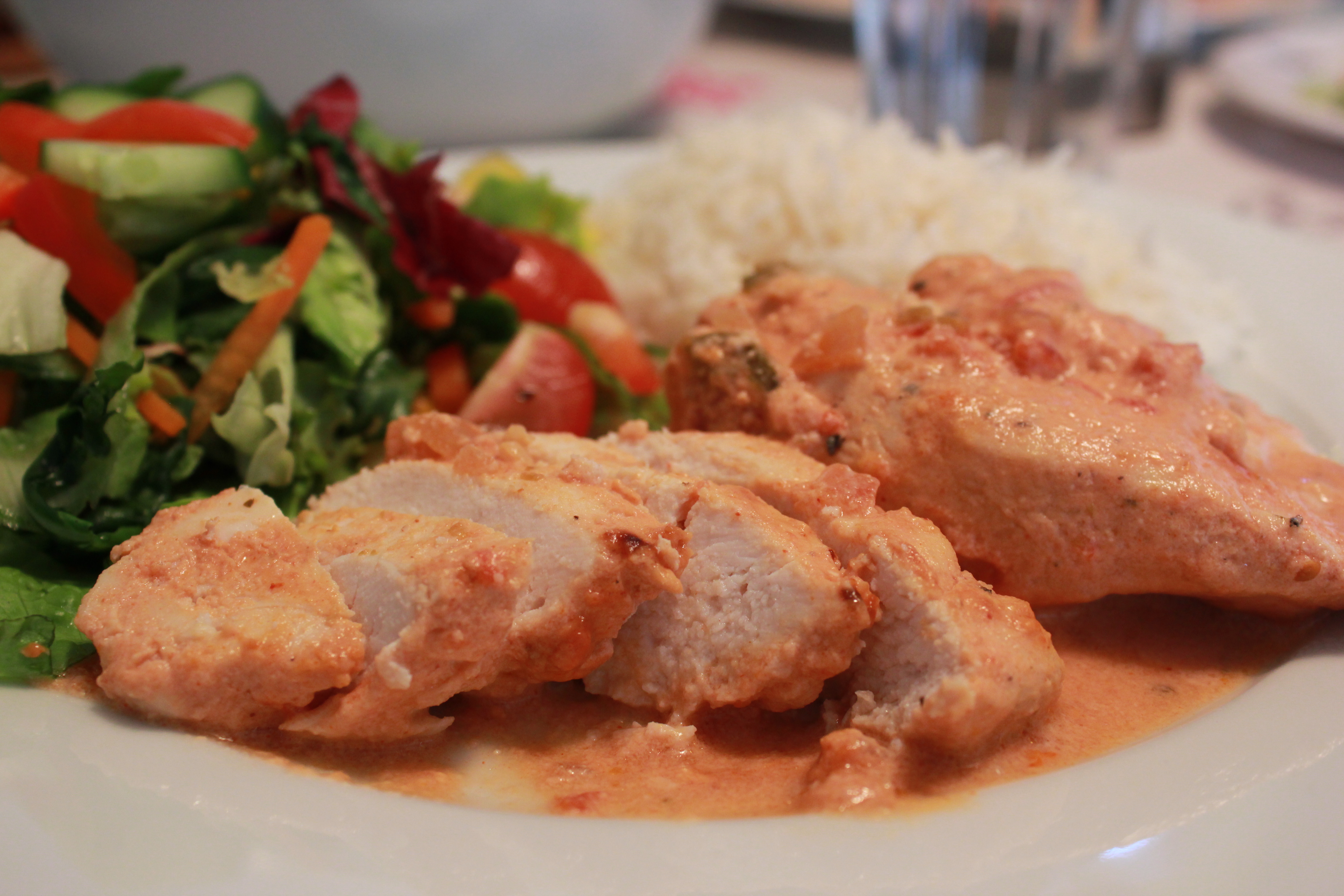 Það er ekki oft að ég elda heima hjá mér þessa dagana. Þegar það gerist reyni ég að komast upp með að gera eitthvað kjánalega einfalt og fljótlegt 😉 Þennan súper einfalda og fljótlega kjúklingarétt fann ég á sænsku uppskriftasíðunni Matklubben. Ég breytti uppskriftinni aðeins og get ég alveg lofað því að þessi réttur verður eldaður aftur á þessu heimili. Ég notaði sterka salsa sósu en við erum hrifin af sterkum mat. Einnig kryddaði ég kjúklingin smá með salt og pipar. Það eina sem ég hugsa að ég geri öðruvísi næst er að steikja kjúklingin smá áður en hann fer í ofninn.