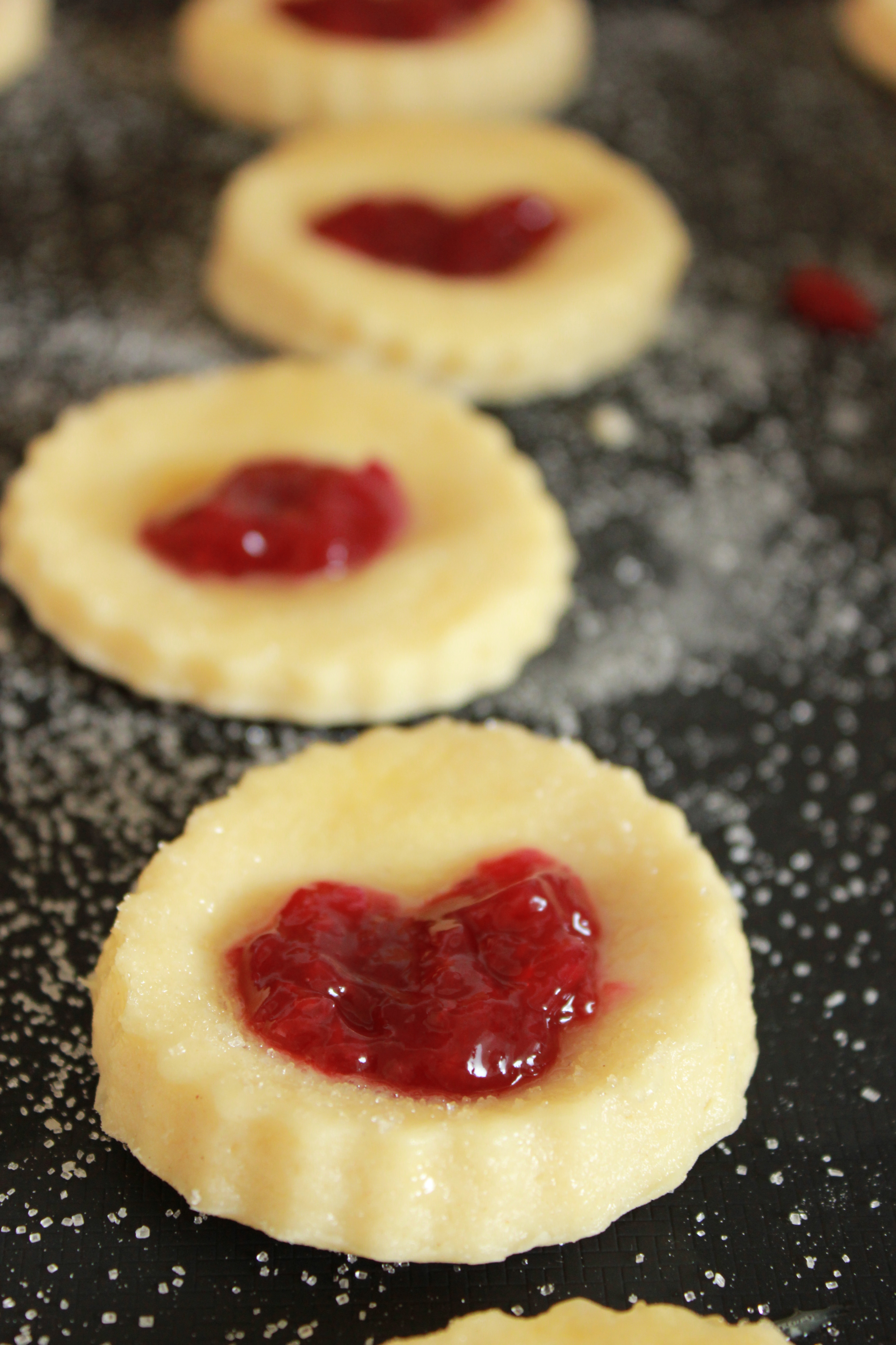 Rúllið út degið þannig að það sé vel þykkt (ca 3 cm). Skerið út smákökur og leggið á bökunarpappírinn. Þrýstið niður með þumlinum í miðjuna á hverja köku til að útbúa dæld fyrir sultuna. Sniðugt getur verið að þrýsta þumlinum tvisvar þannig að hjarta myndist.
