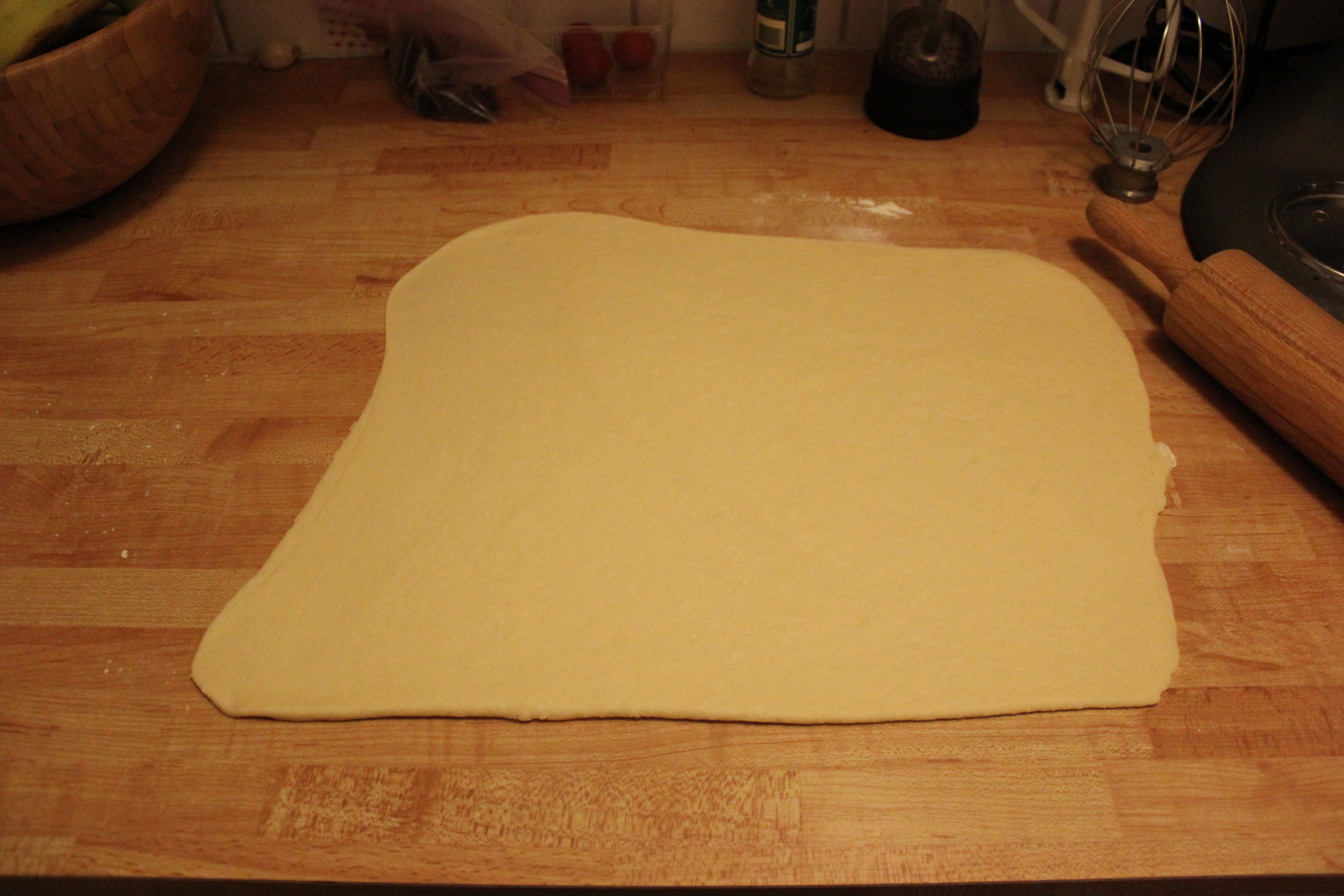 Hnoðið deigið og fletjið það út í 45 x 23 cm rétthyrning. Burstið deigið með smjörinu.