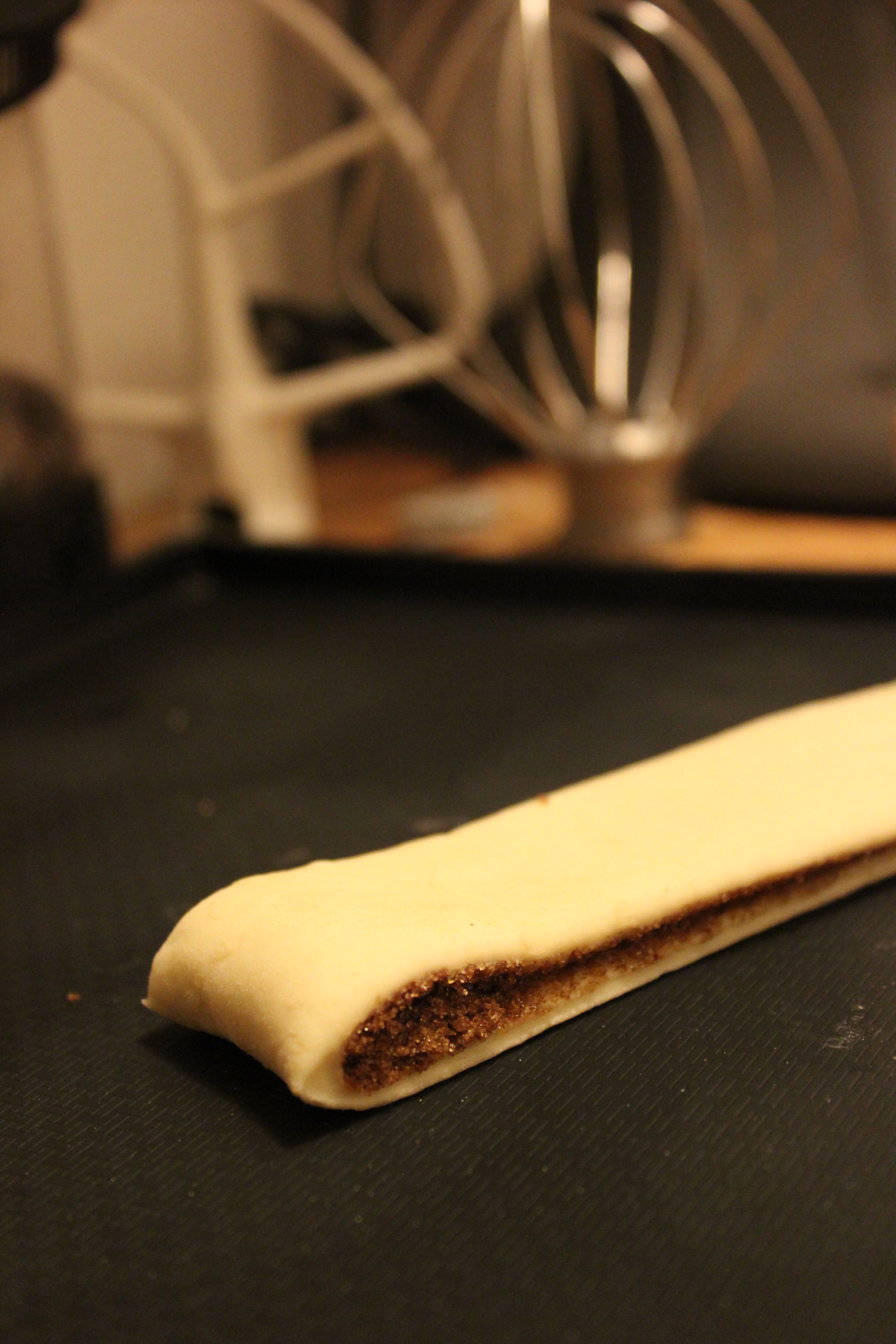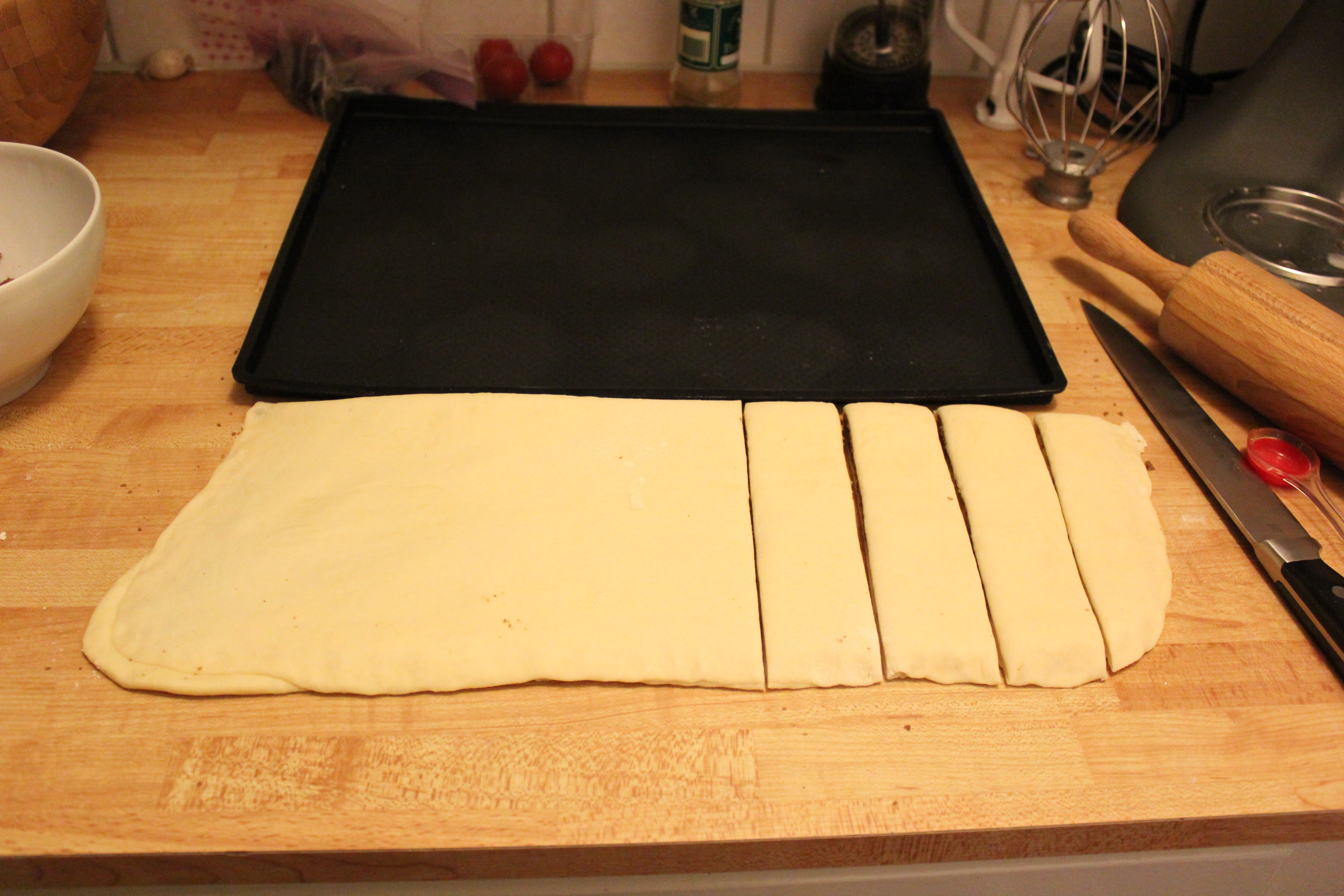 Skerið í 3 cm breiðar ræmur. Leggið ræmurnar á bökunarpappír með 6 cm millibilli. Snúið uppá hverja ræmu 2-3 sinnum.