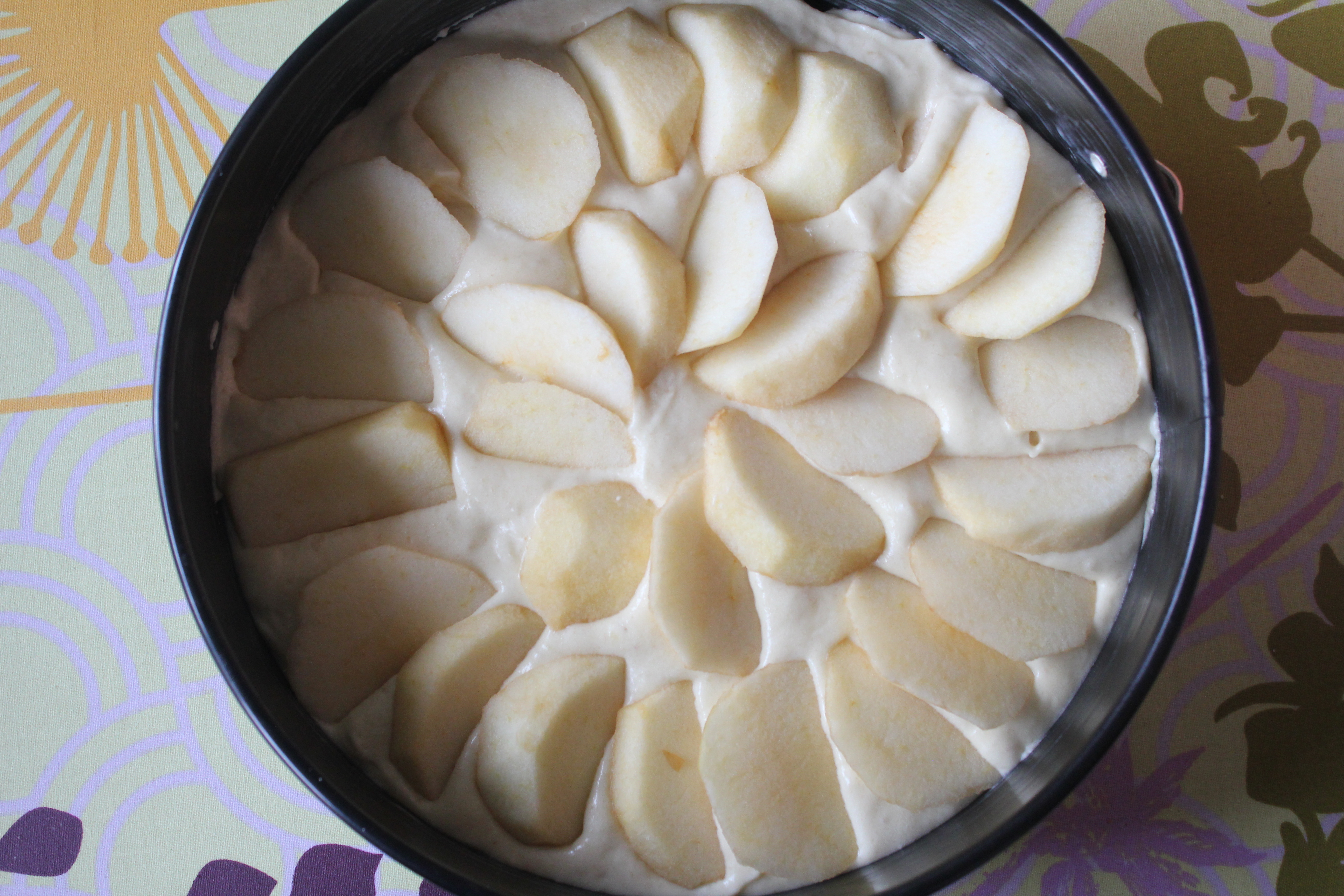 Leggið helminginn af eplunum í botninn á forminu. Hellið deiginu ofan á og leggið afganginn af eplunum ofan á deigið.