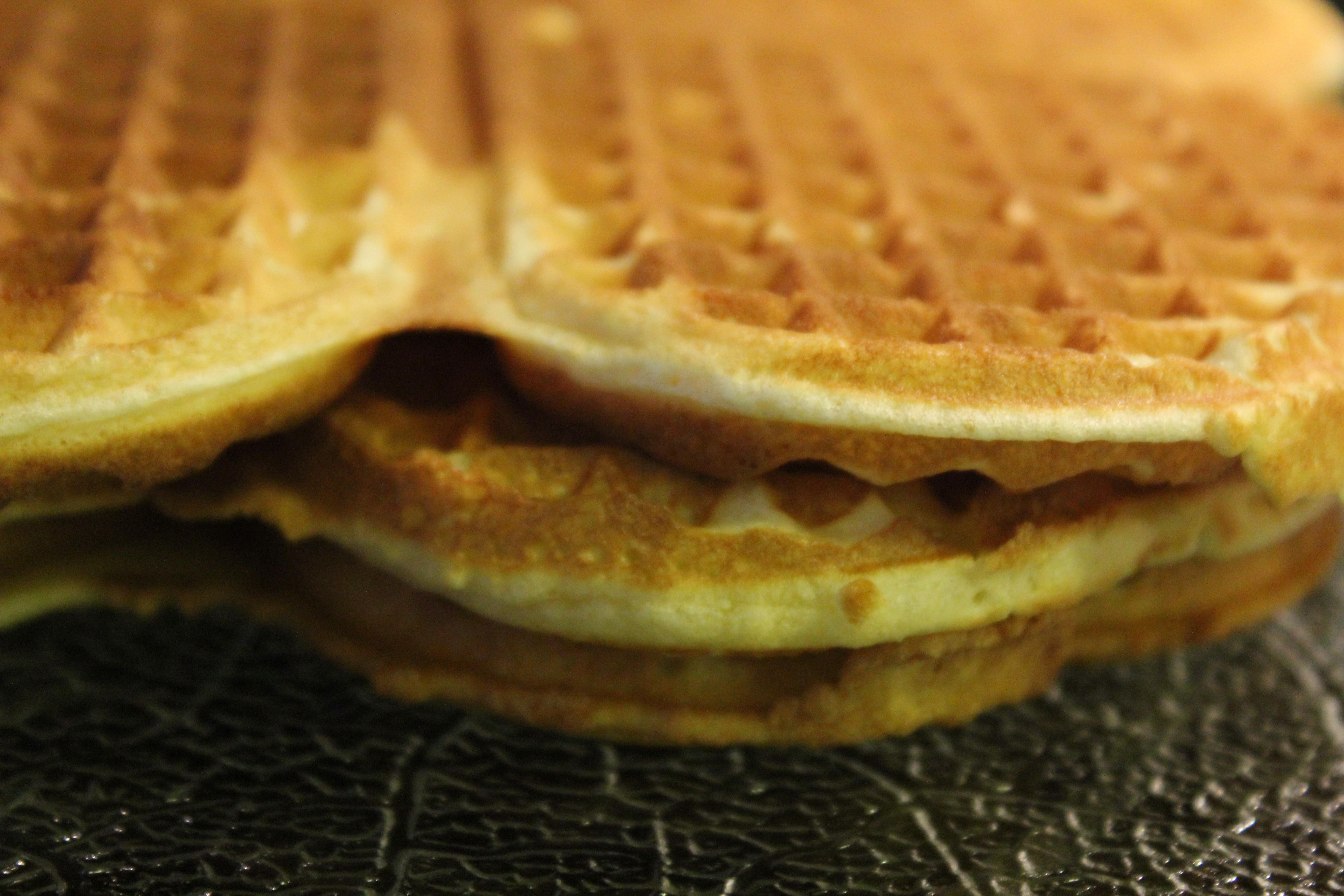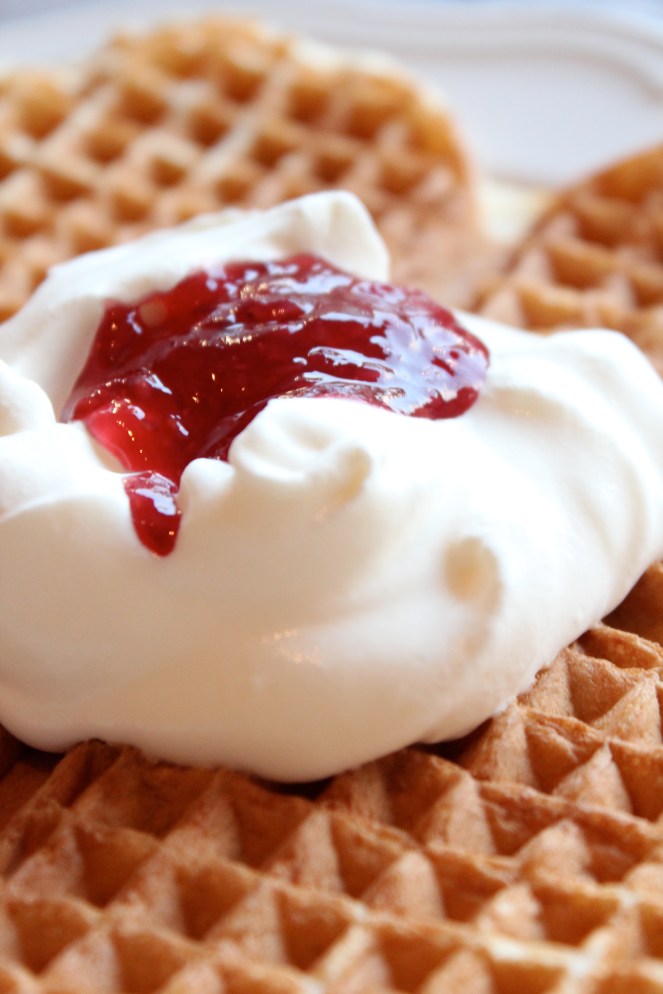 (og ef þið eruð að furða ykkur á sírópsflöskunni þarna á miðri mynd, þá kem ég er úr einhverri stórundarlegri fjölskyldu þar sem það er til siðs að nota venjulegt síróp út á vöfflur 😉 )