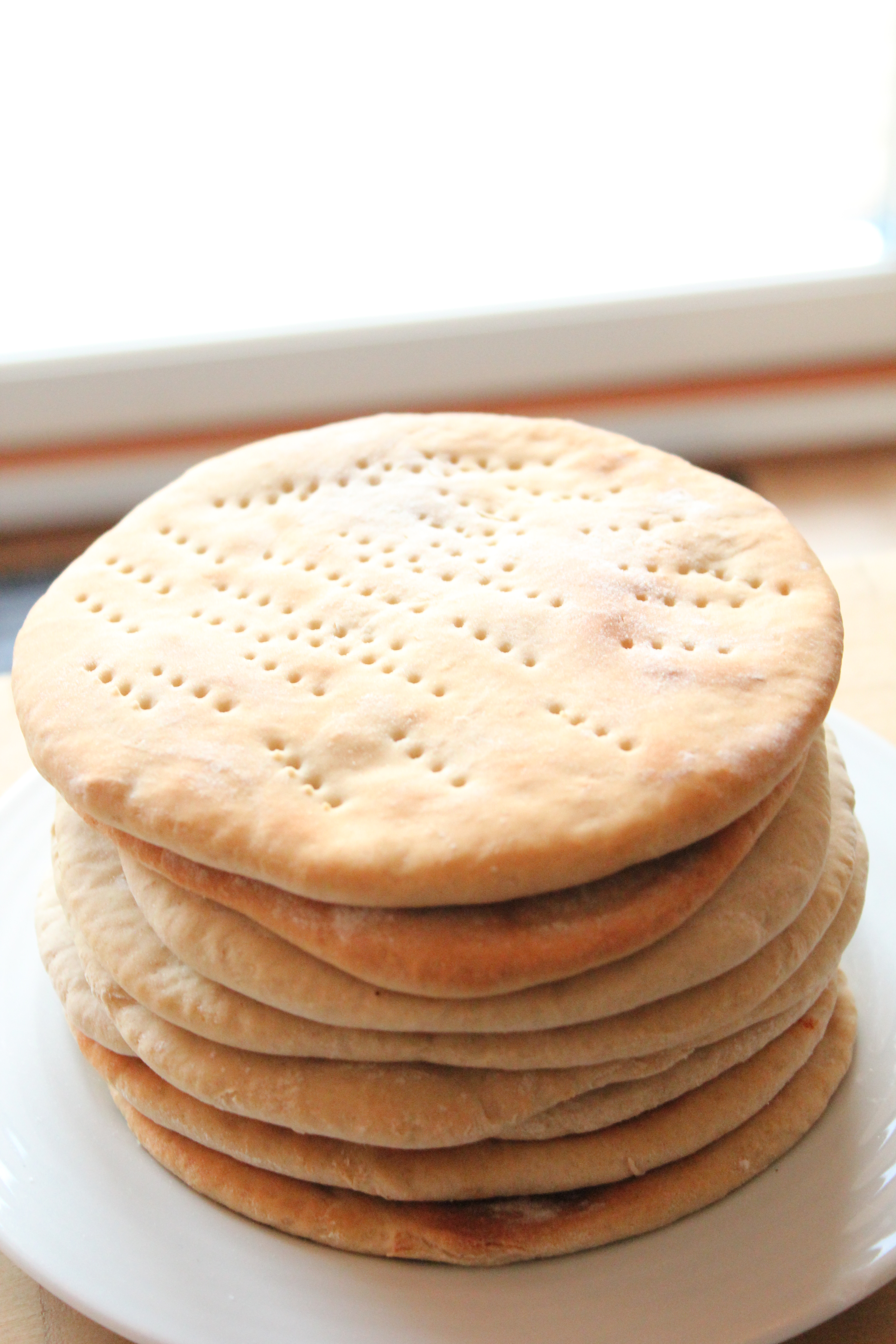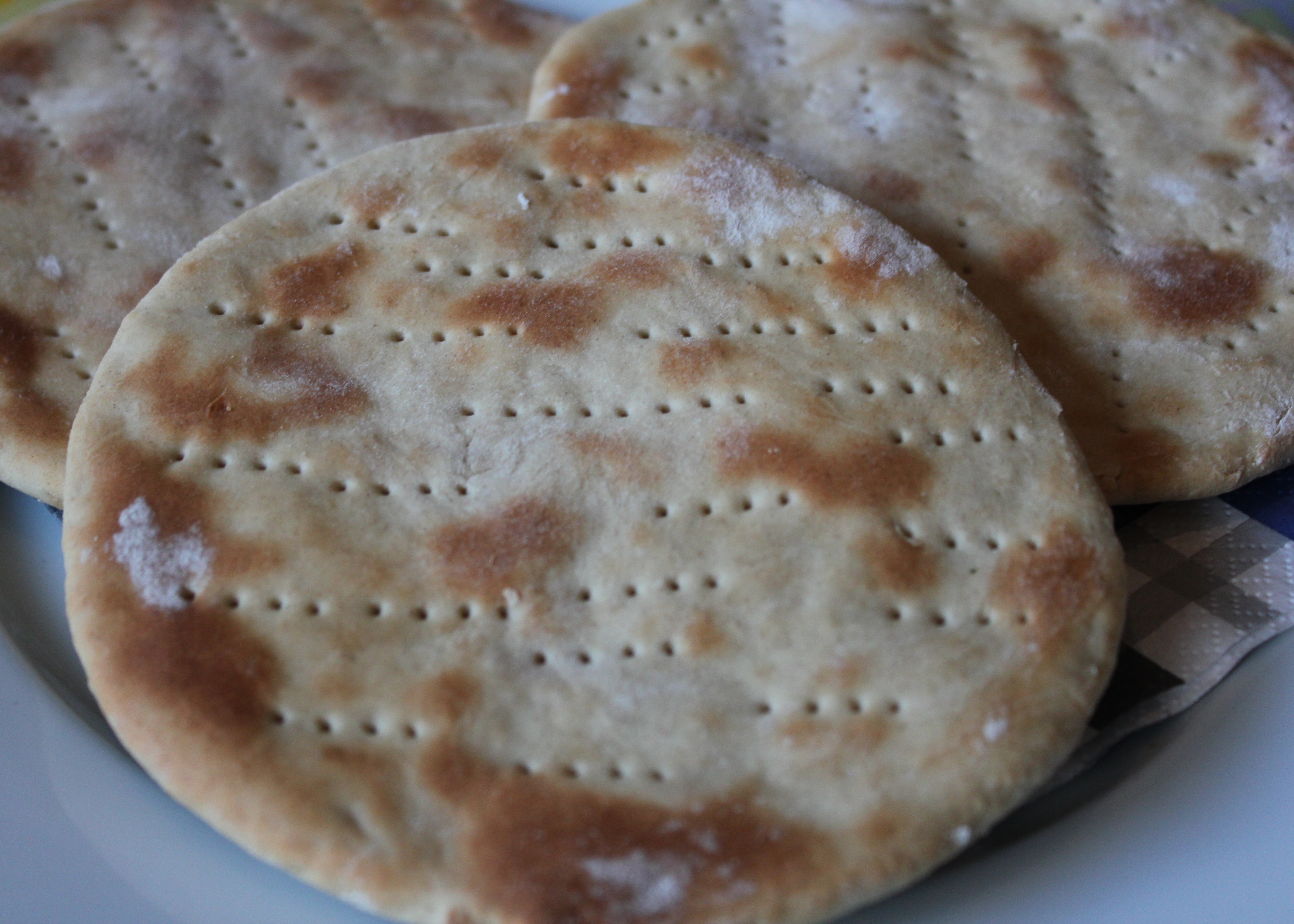 Stillið ofninn á 250 – 275 gr. Skiptið deiginu í u.þ.b. 20 jafnstóra bita. Gerið „bolta“ úr hverjum bita og keflið svo út í hringlaga form, ca. 16 cm í þvermál. Stingið hvern hring með gaffli (passið að stinga alveg í gegnum deigið, ekki bara yfirborðið) og leggið svo á bökunarpappír á bökunarplötu. Látið hefa sig í nokkrar mínútur.