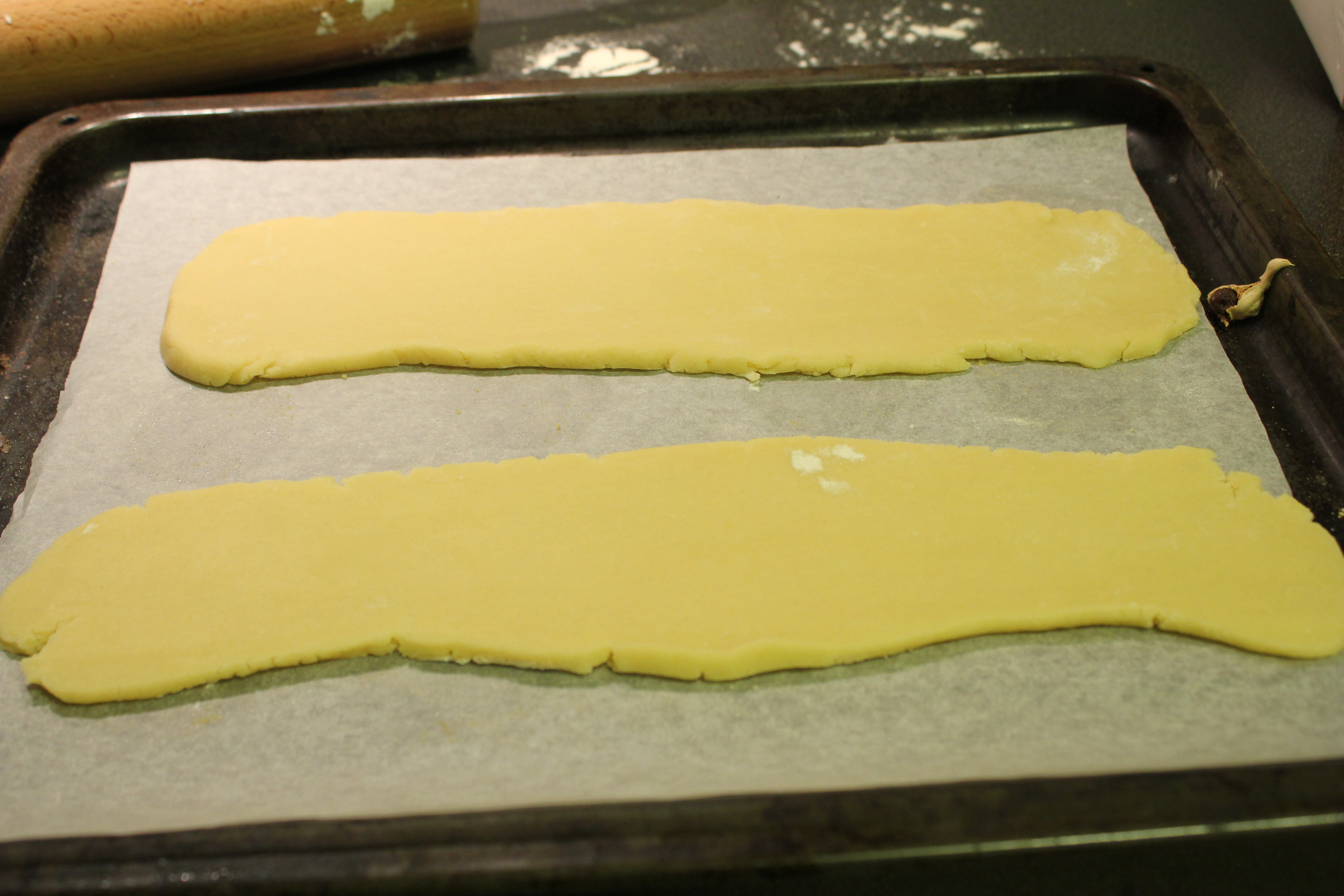 Seinni uppskrift dagsins kemur líka úr smákökubók Hembakat. Þegar maður skoðar sænskar smákökuuppskriftir þá virðast allskyns tegundir af „snittum“ vera mjög vinsælar hér, og bókin sem ég fékk er full af þeim. Ég ákvað að prófa þessar eplasnittur, ég meina smjördeig og eplamauk? Hvað getur eiginlega klikkað? Tja, ekki svo margt nema eftir á held ég að ég hafi haft lengjurnar of breiðar og þunnar. Það hefði sennilega verið betra að hafa þær mjórri og þá hefði rákin líka orðið dýpri og meira eplamauk getað leynst þar. En okkur finnst snitturnar samt mjög góðar eins og þær eru (svo það sé nú alveg á hreinu 🙂 )