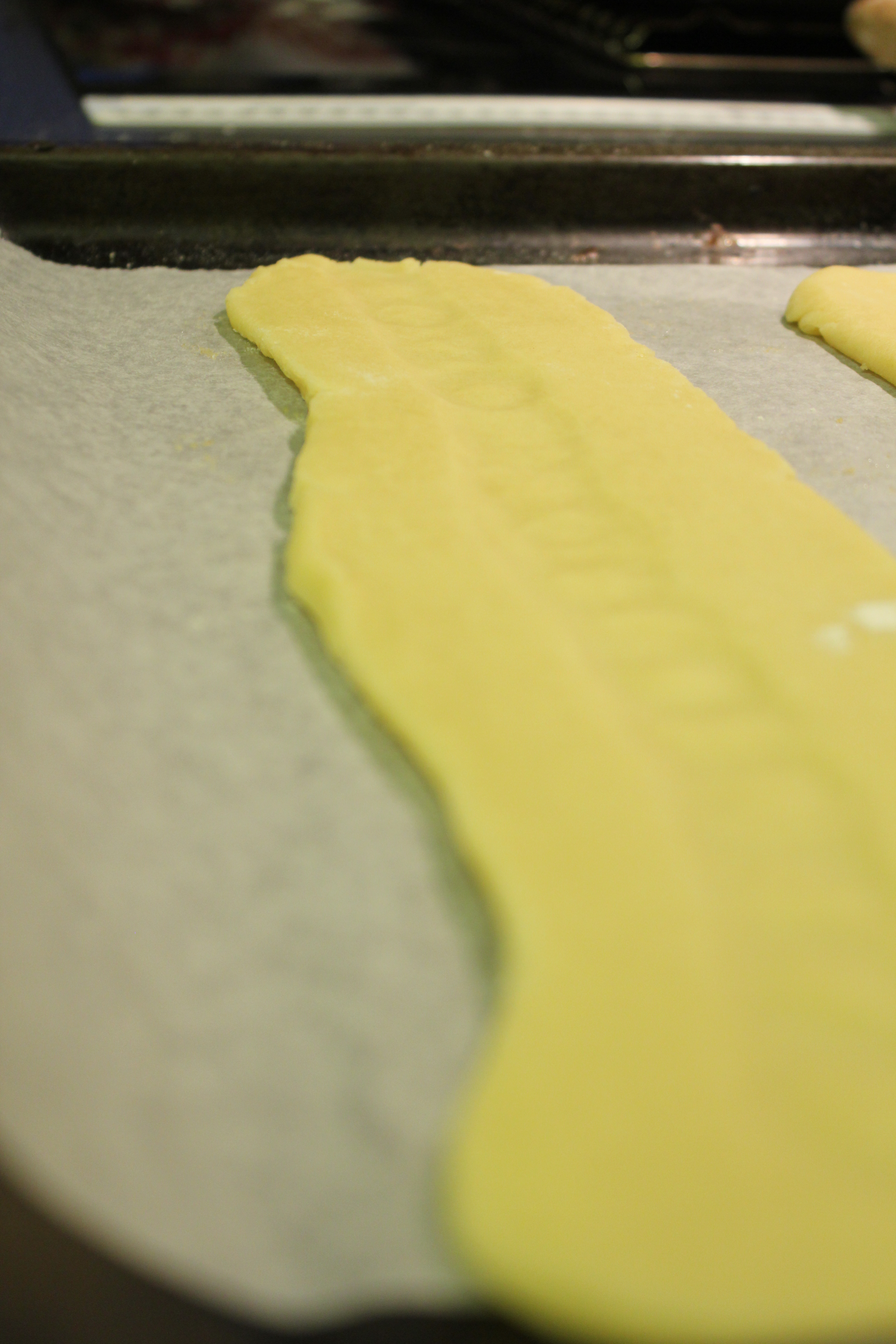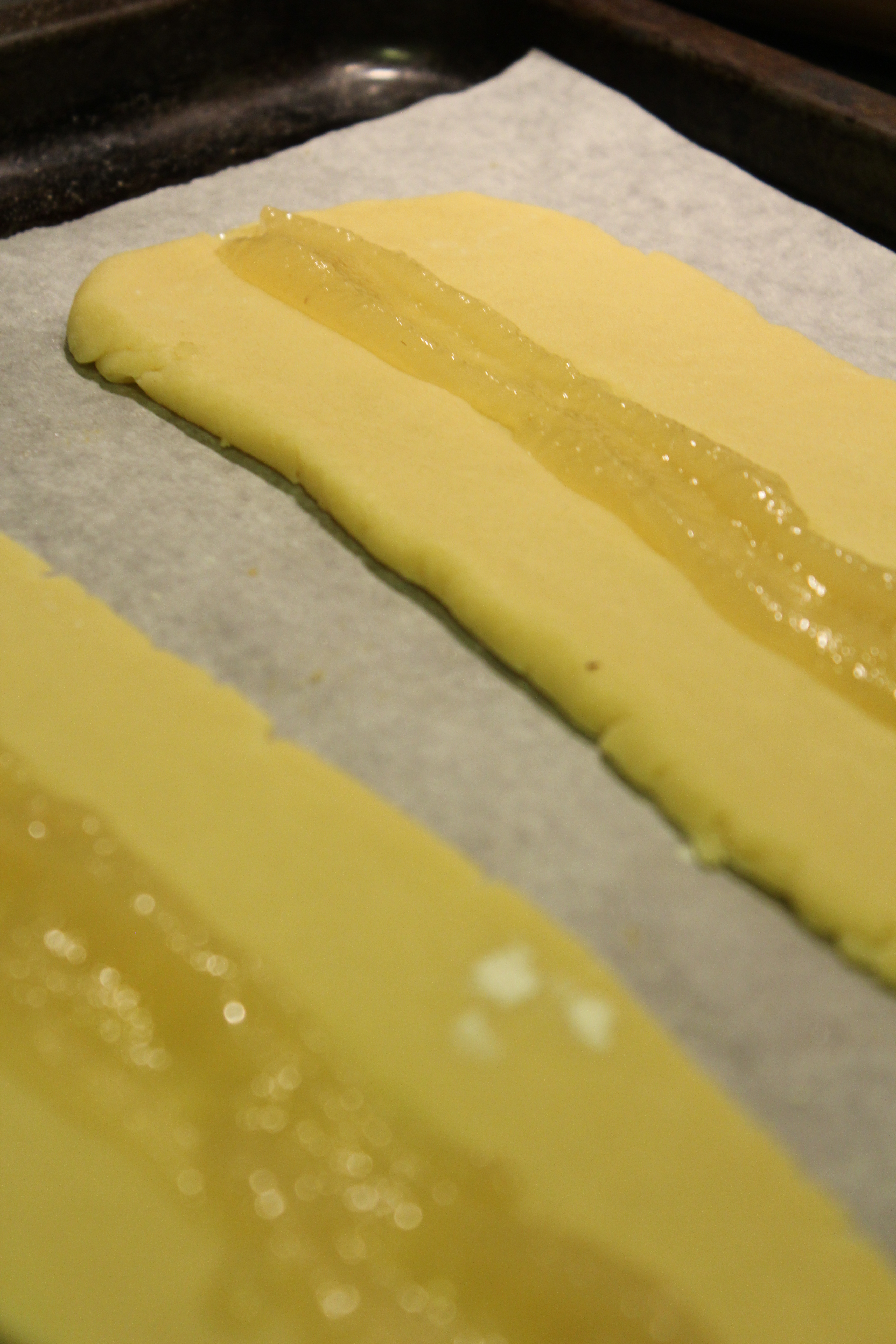 Stillið ofninn á 200°c. Skiptið deiginu í 2 jafnstóra helminga. Keflið hvorn helming út í 30 cm. lengju. Leggið báðar lengjurnar á ofnplötu (klædda með bökunarpappír). Ekki hafa lengjurnar of breiðar. Búið til dæld eftir hvorri lengju (t.d. með því að þrýsta þumlinum niður í hana). Setjið eplamauk í dældina.