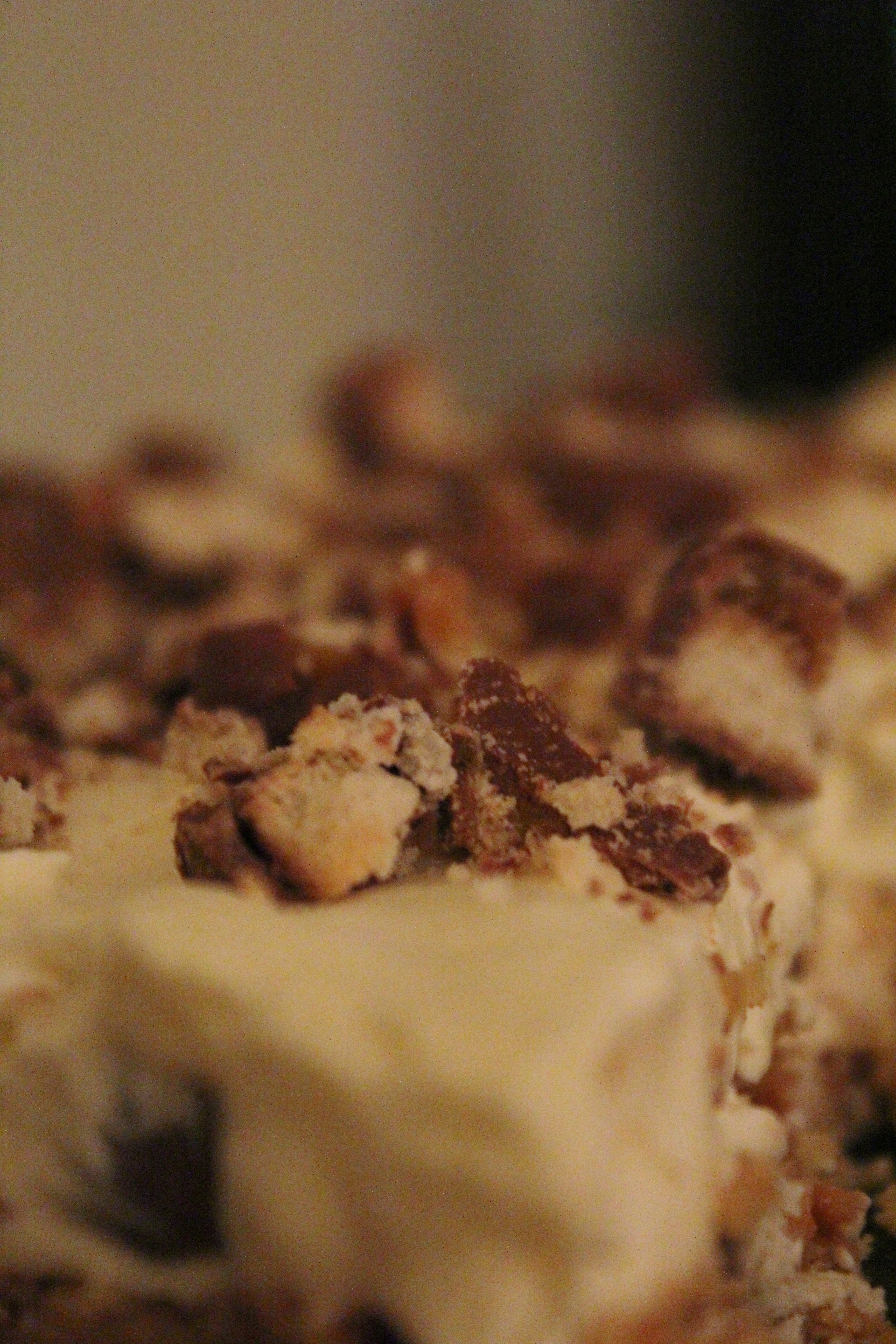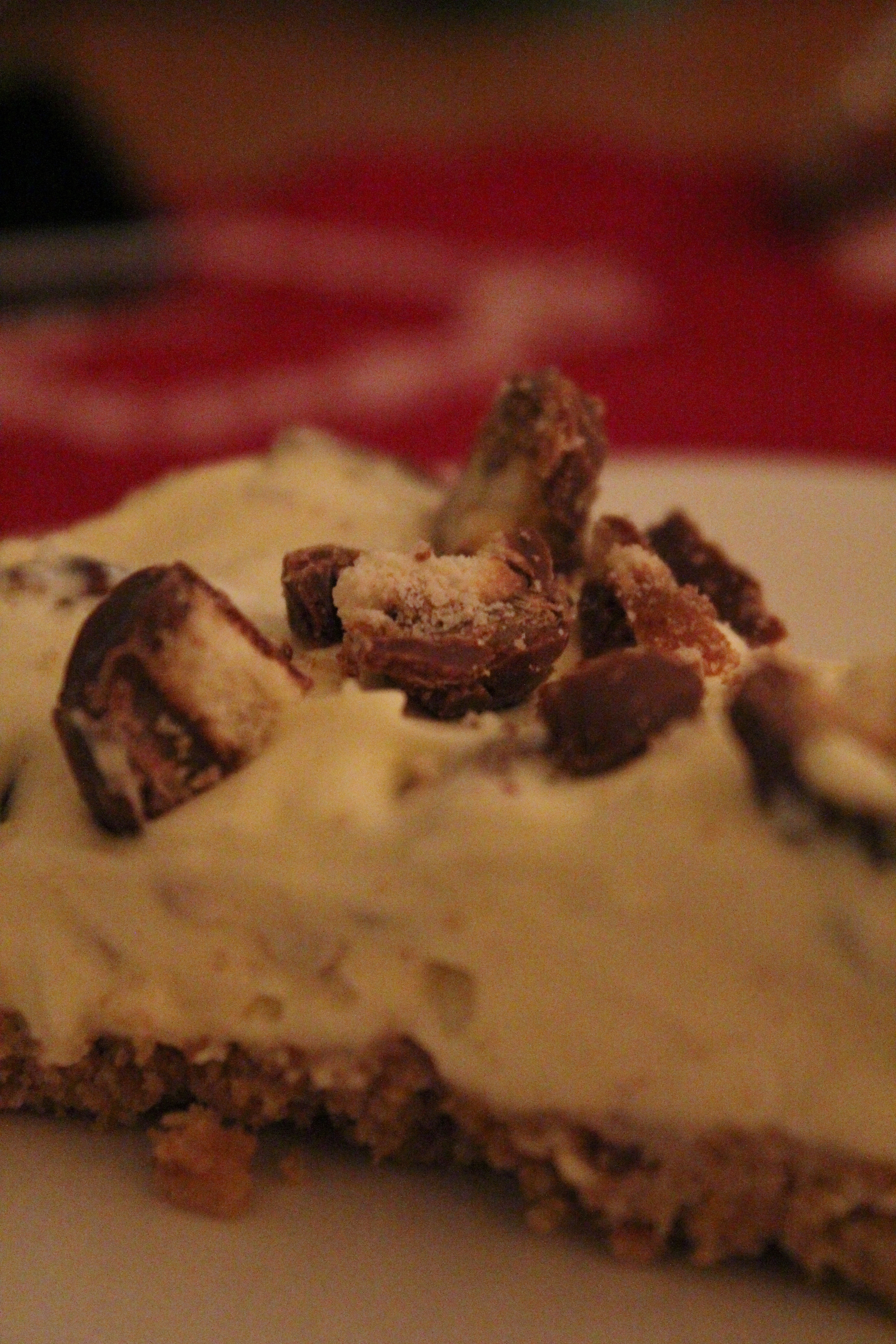 Fyrir valinu varð þessi twix-ostaka. Kakan er fryst og er með eggjagulum (sem mér sýnist vera standard í sænskum frystum ostakökum) og hefur þ.a.l. á sér smá ís-yfirbragð. Hún var æðislega góð en ég held samt að það myndi ekkert saka að minnka aðeins sykurmagnið í henni, ég prófa það örugglega í næstu útfærslu 😉