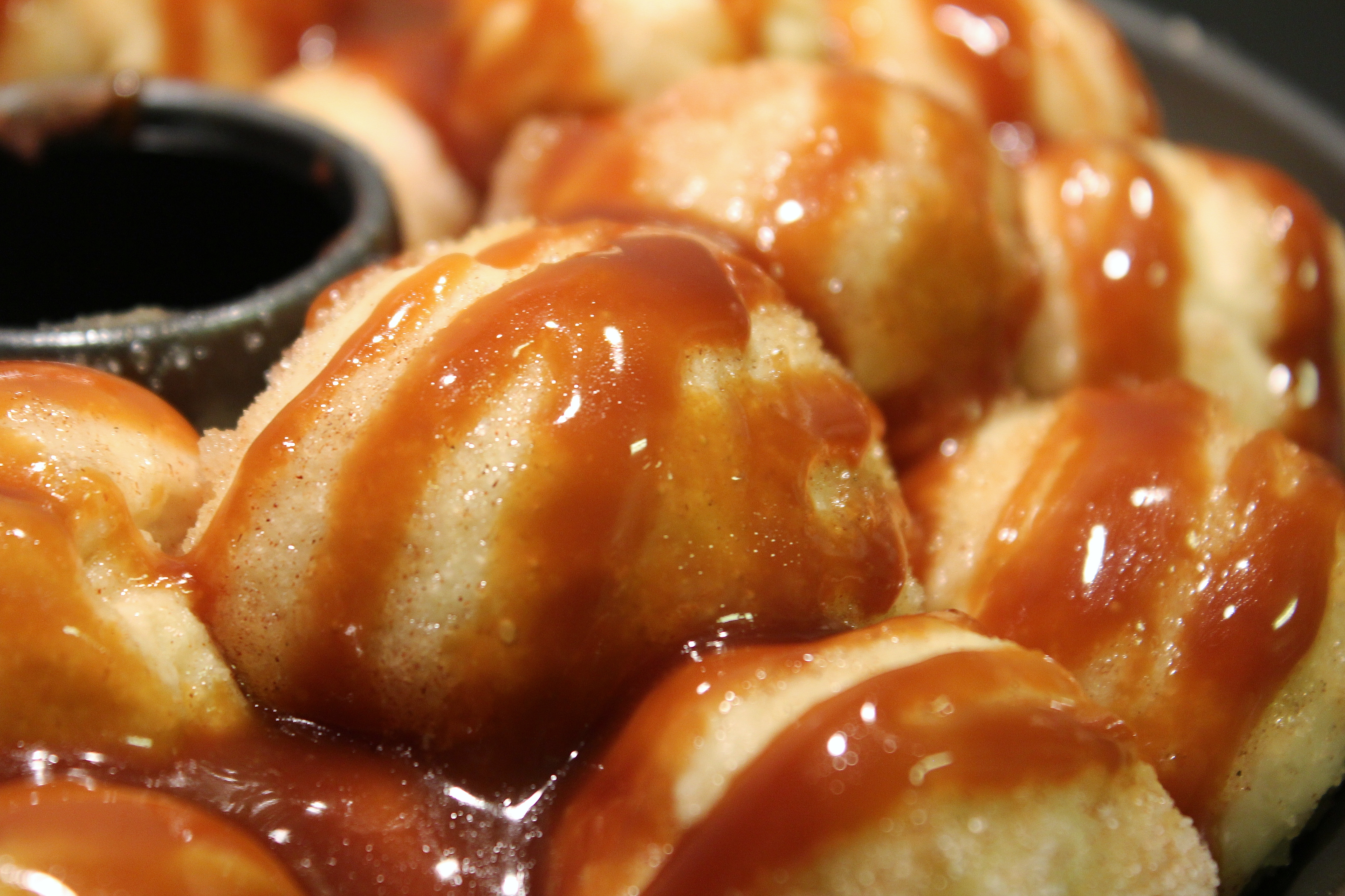 Áður en formið fer inn í ofninn hellið þá helmingnum af karamellunni yfir deigboltana. Bakið í 30 – 35 mínútur. Takið formið úr ofninum, og látið kólna í u.þ.b. 5 mín. Hvolfið þá úr forminu yfir kökudisk. Hitið karamelluna í örstutta stund og hellið henni svo yfir kökuna. Berið fram og njótið 🙂