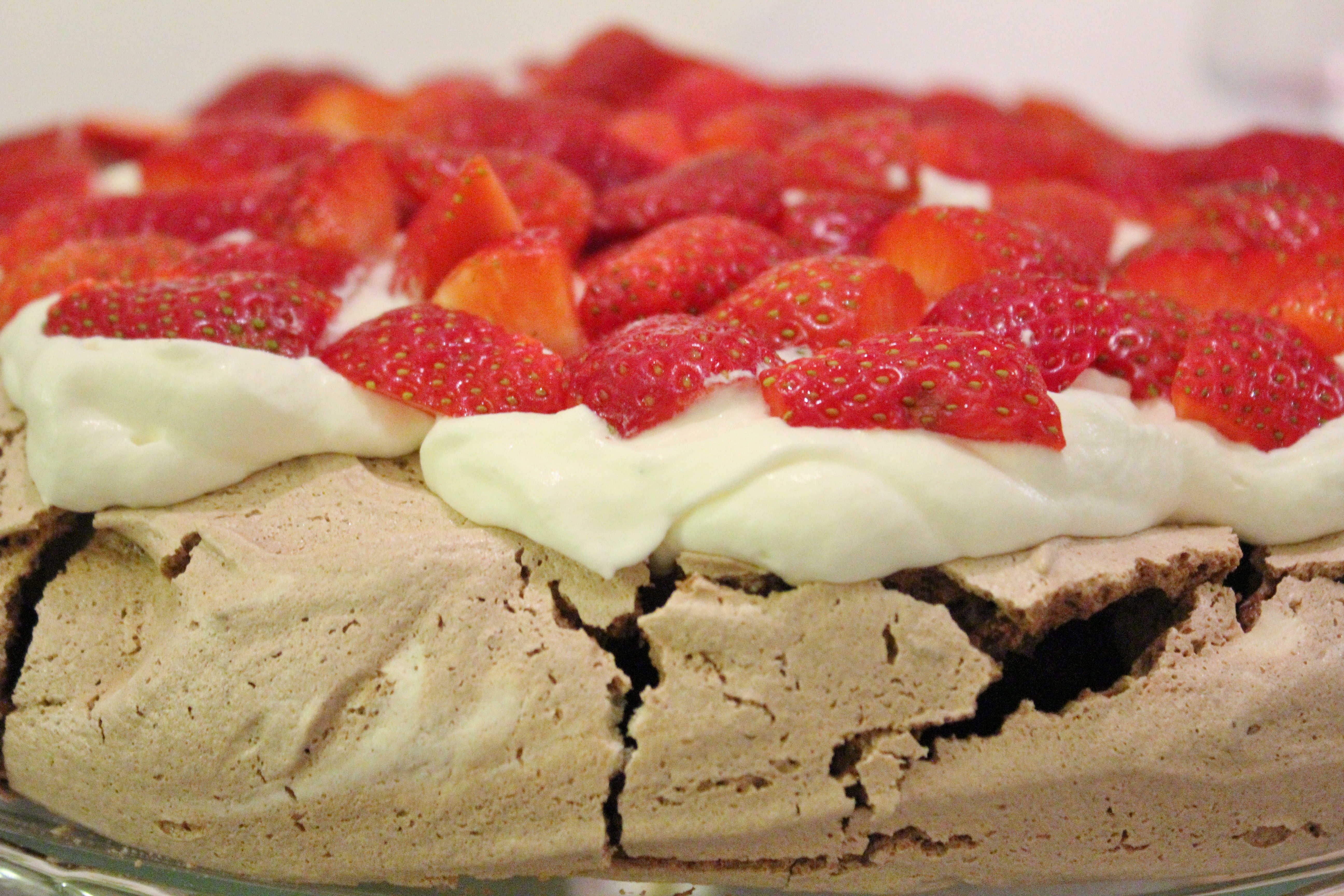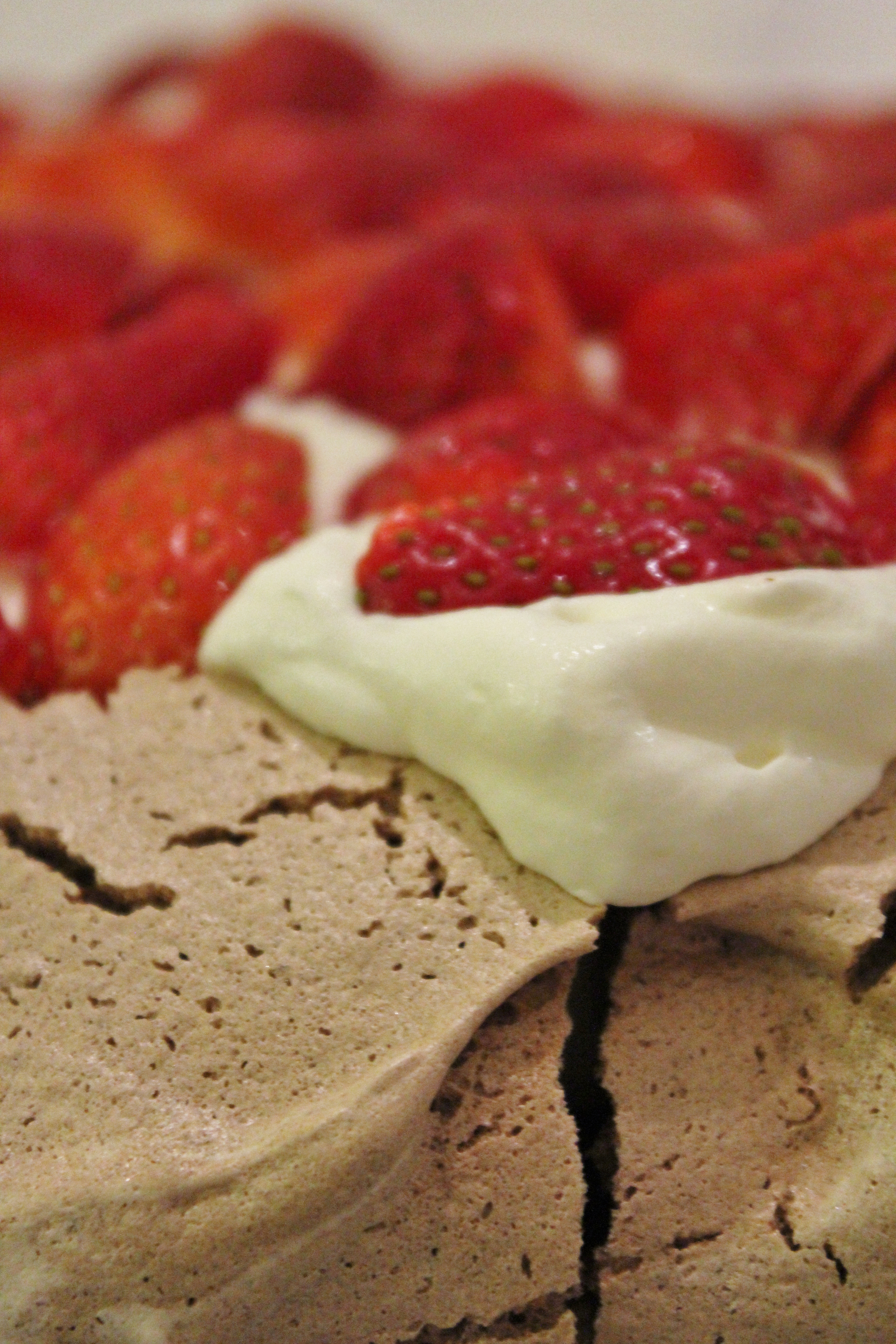 Ég hef aldrei bakað pavlovu áður, ef ég á að vera alveg hreinskilin þá er ég hálf hrædd við marengs eftir að ég bakað einu sinni nokkra botna úr afganseggjahvítum og þeir urðu allir ólseigir og leiðinlegir. Mig langaði samt að prófa, var búin að heyra góða hluti um þessa súkkulaðipavlovu úr smiðjum eldhúsgyðjunnar Nigellu og við urðum svo sannarlega ekki svikin. Ég hefði reyndar betur farið alveg eftir uppskriftinni og beðið með að setja rjómann og berin á, hún var farin að síga hressilega þegar við fengum okkur dessertinn 🙂