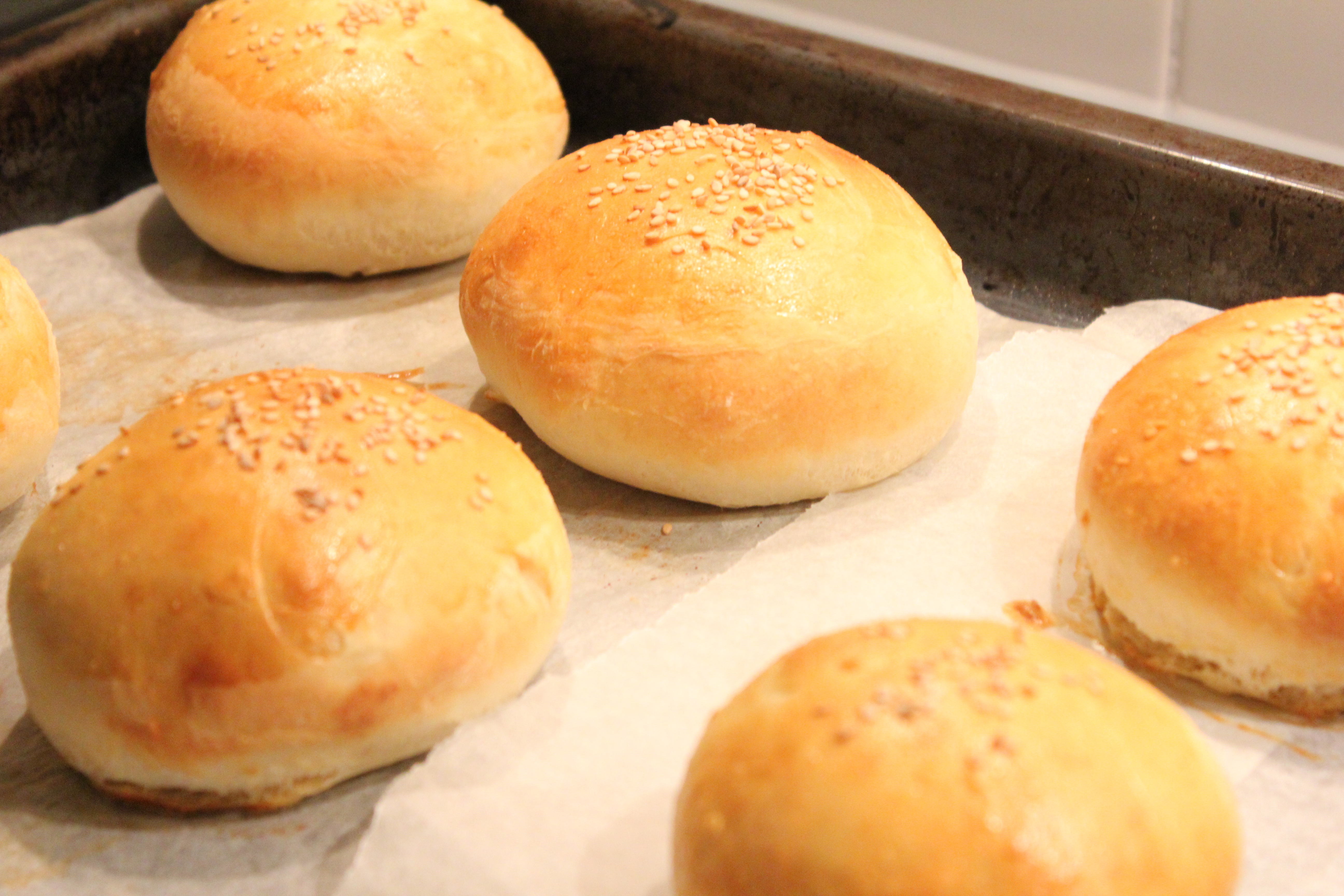 Blandið þurrefnunum saman. Blandið þurrgerinu saman við. (Ef þið notið pressuger, myljið það þá út í mjólkina). Setjið mjólkina og smjörið út á þurrefnin. Blandið saman. Hnoðið í vél í 10 mínútur eða 15 mínútur í höndunum. Látið hefast í 40 mín. Mótið 6 bollur úr deiginu og setjið á ofnskúffu (klædda með bökunarpappír). Þrýstið aðeins ofan á bollurnar til að fletja þær aðeins. Látið hefast í 30 mínútur. Áður en brauðin eru bökuð eru þau pensluð með egginu og sesamfræjum stráð yfir. Bakað í ca. 10 mínútur eða þar til þau eru orðin gullinbrún að lit.