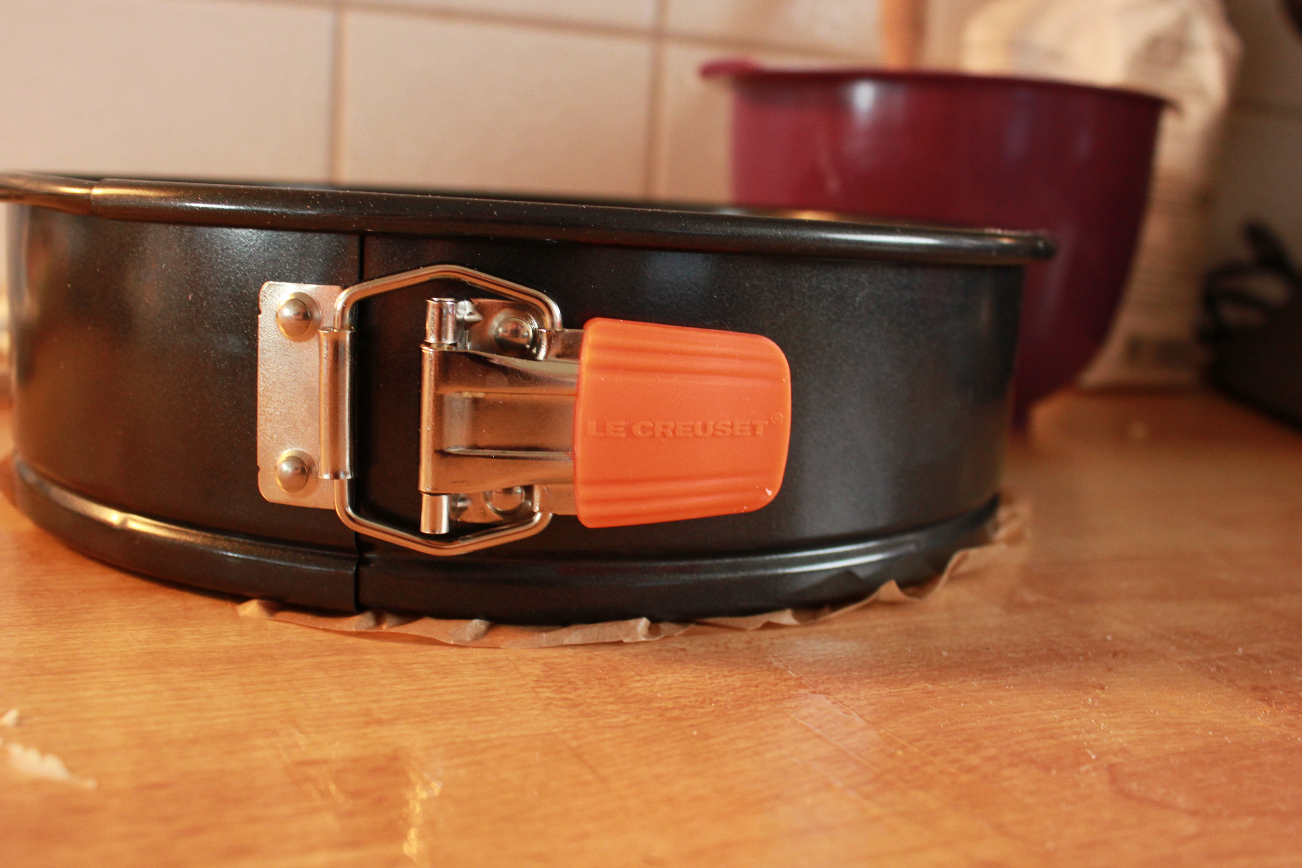 Hitið ofninn í 175°. Leggið bökunarpappír yfir botninn á smelluformi og smellið síðan forminu saman. Smyrjið hliðarnar á forminu með smjöri.