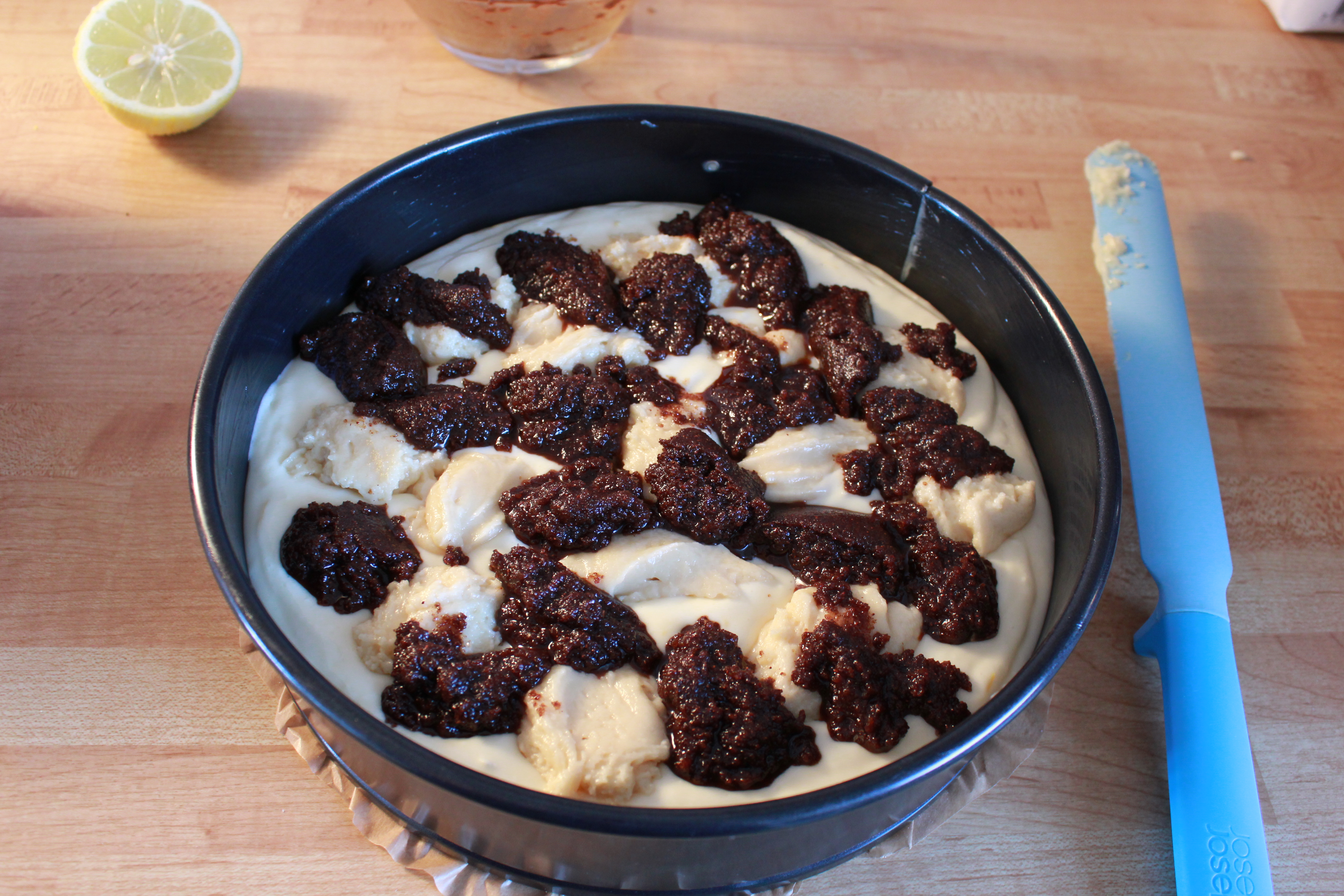 Takið helminginn af botn deginu og smyrjið því á botninn á smelluforminu. Því næst er rjómaost deginu helt í formið. Takið hinn helmingin af botn deginu og dreifið “slettum” af því yfir kökuna með matskeið. Takið kanill fyllinguna og dreyfið henni einnig með “slettum” yfir kökuna. Takið hníf og dreifið vel úr slettunum.