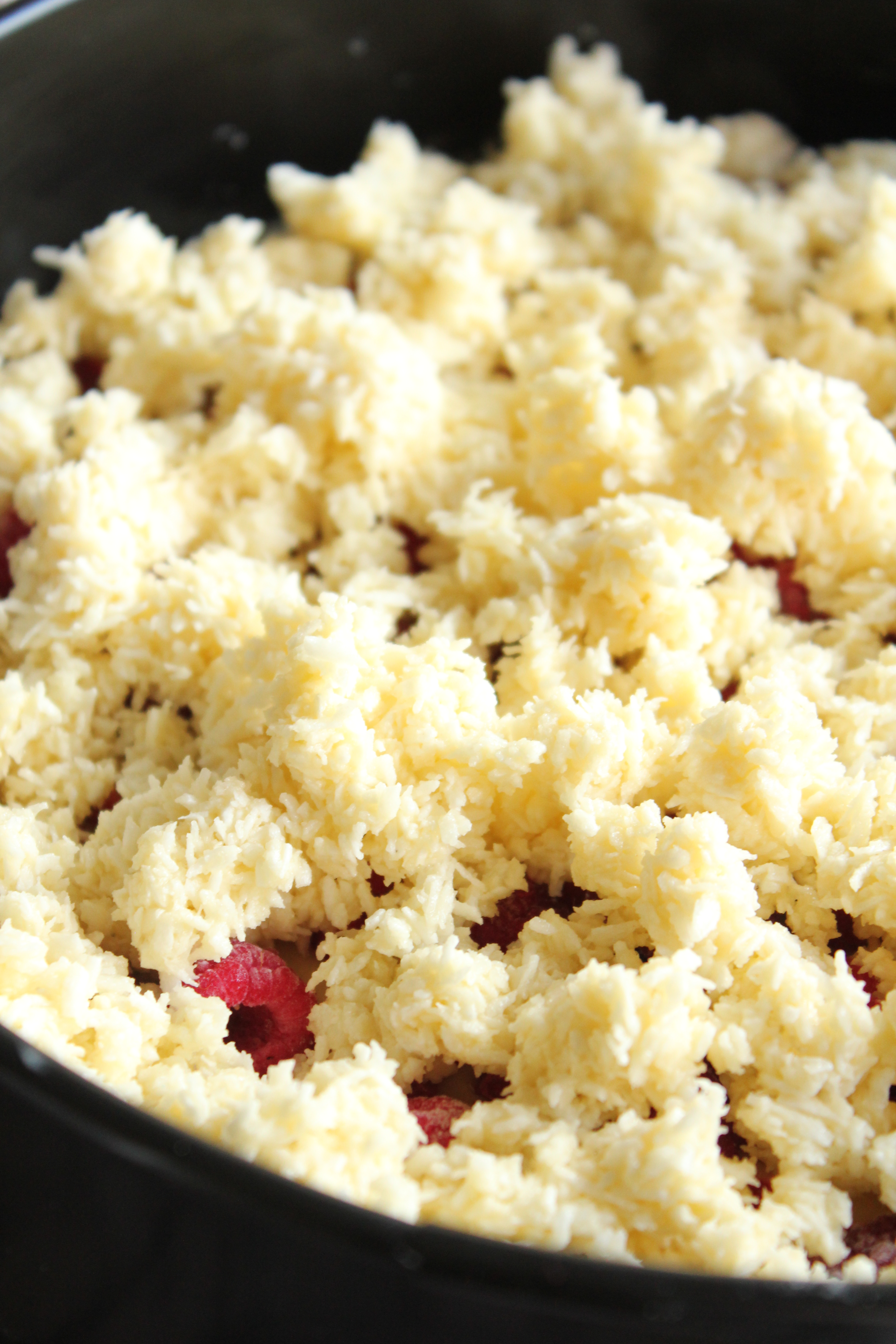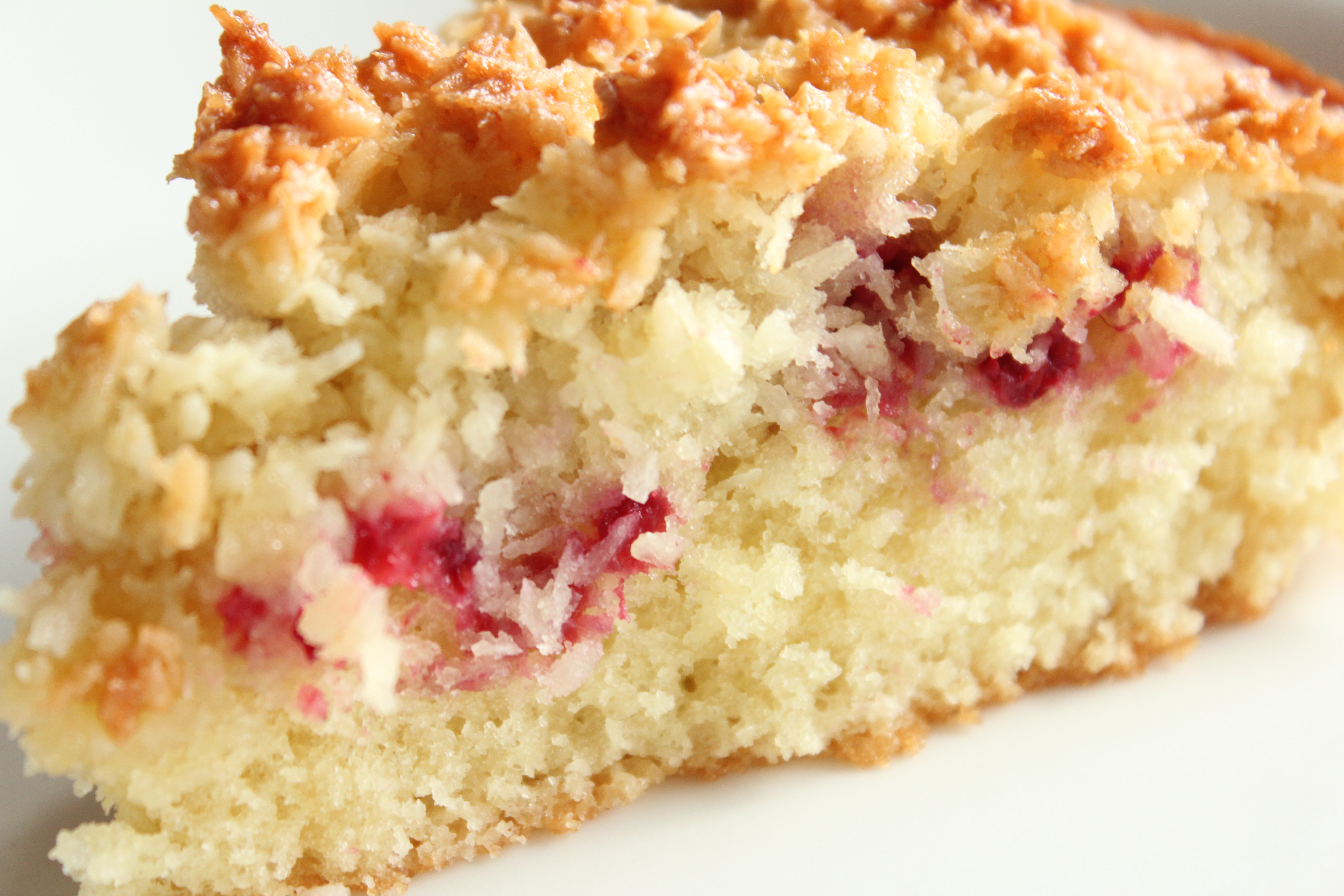 Sumar kökur veit ég bara að mér muni finnast góðar um leið og ég sé uppskriftina. Þessi kaka er gott dæmi um það. Það var orðið talsvert langt síðan ég hafði bakað upp úr hembakast svo ég ákvað síðasta sunnudag að finna eitthvað girnilegt til að prófa. Og ég meina, hvernig getur svona uppskrift klikkað? Svambotn, örlítið súr hindber og kókosteppi ofan á? Alveg ekta sunnudags-kaffikaka skal ég segja ykkur (svona fyrir mig og eiginmanninn allavega, dregnirnr fúlsuðu fullkomlega við þessum „ávöxtum“ sem voru í henni!).