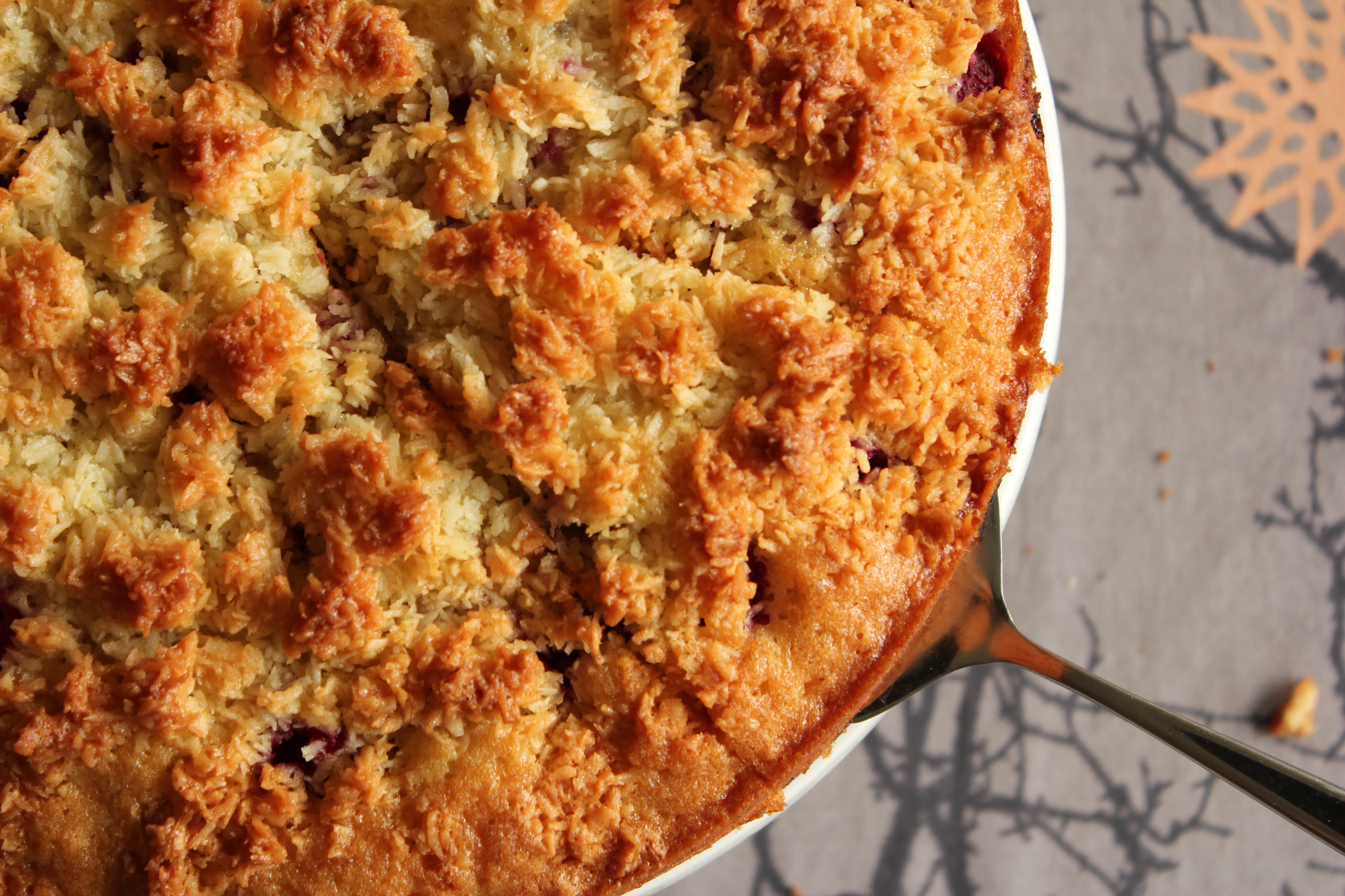 Kókosmylsna 50 gr smjör (við stofuhita) 3 msk strásykur 1 tsk vanillusykur 1 egg 3 dl kókosmjöl 3 msk hveiti ½ tsk lyftiduft Fylling 3 dl fryst hindber Aðferð Stillið ofninn á 175°c. Bræðið smjörið og látið það kólna aðeins. Botn: Þeytið egg og sykur þar til létt og ljóst. Hrærið smjörið út í. Blandið hveiti og lyftidufti saman í annarri skál. Siktið hveitiblönduna út í eggjablönduna. Kókosmylsna: Þeytið vel saman smjör, sykur og vanillusykur. Blandið saman, í annarri skál, hveiti, kókos og lyftidufti. Blandið saman við smjör og sykurblönduna. Hellið deiginum fyrir botninn í smurt hringlaga smelluform, ca. 24 cm. í þvermál. Stráið hindberjunum yfir botninn. Klípið kókosmylsnuna að lokum yfir. Bakið í neðri hluta ofnsins í 45 – 50 mínútur. Gott er að setja álpappír yfir kökuna ef hún fer að brúnast of mikið undir lok bökunartímans. Athugið með prjóni hvort að kakan sé tilbúin áður en þið takið hana út. Látið kólna. Berið fram með t.d. þeyttum rjóma.