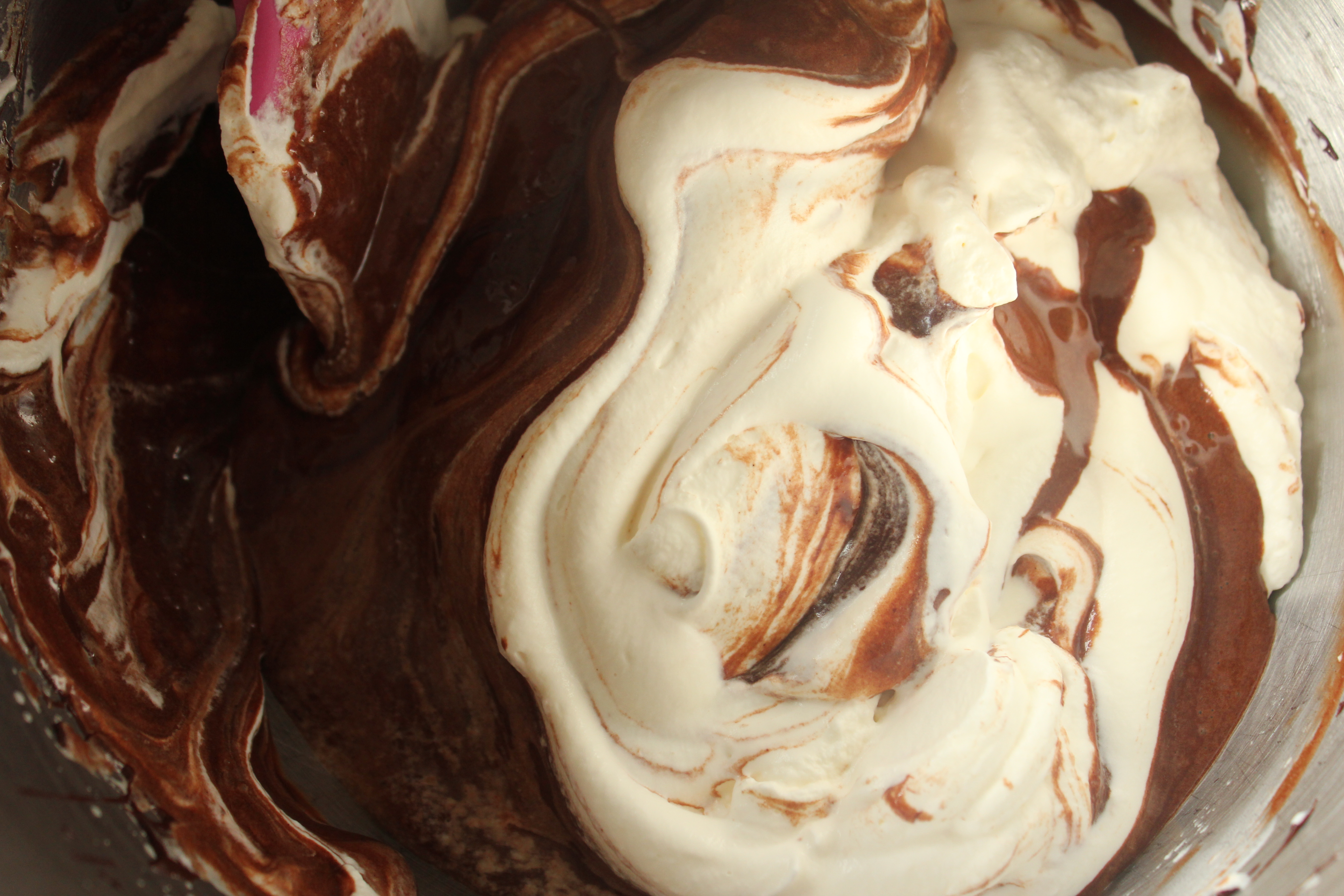 Þeytið rjóminn vel, blandið svo rjómanum saman við súkkulaðiblönduna en farið varlega, þannig að það fari ekki allt loft úr blöndunni.