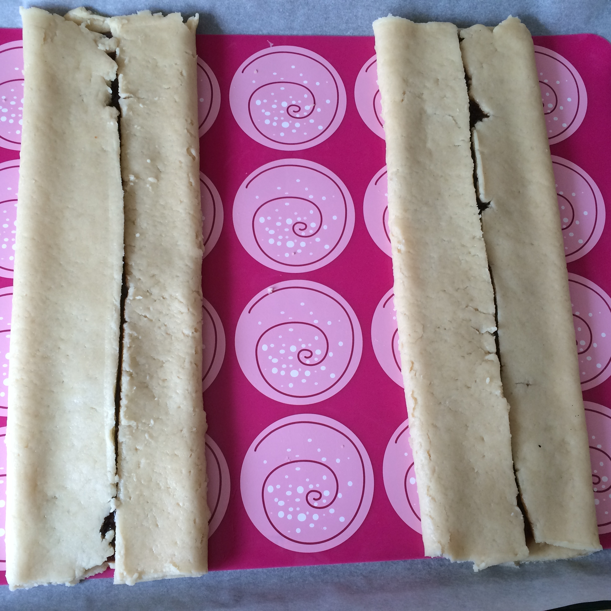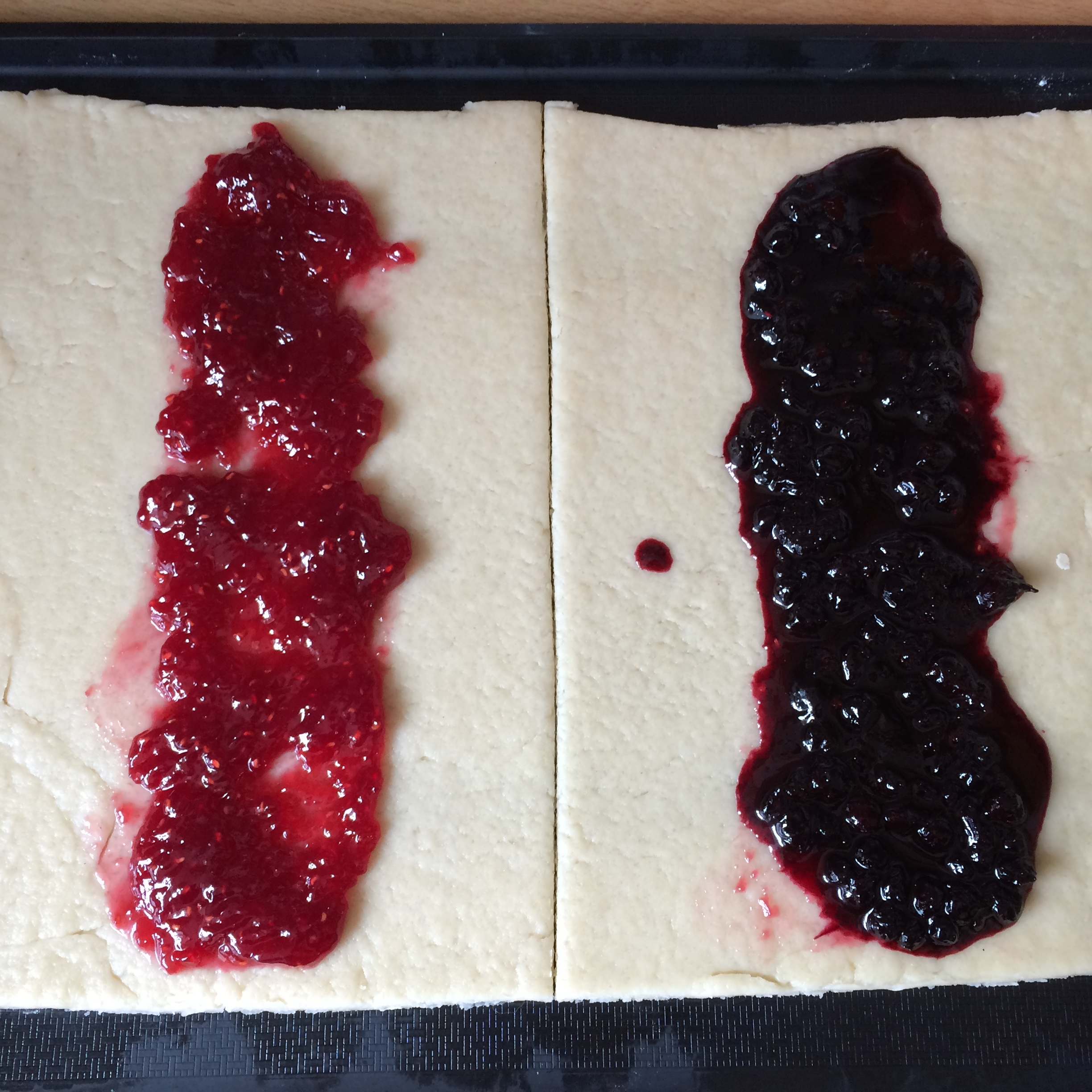 Smyrjið rabarbara sultunni í miðjuna á deiginu og flettið síðan sitthvorri hliðinni yfir sultuna. Ég skildi eftir smá gat en mamma sagði mér að amma var vön að láta degið mætast en svo gliðnaði það í bakstri.