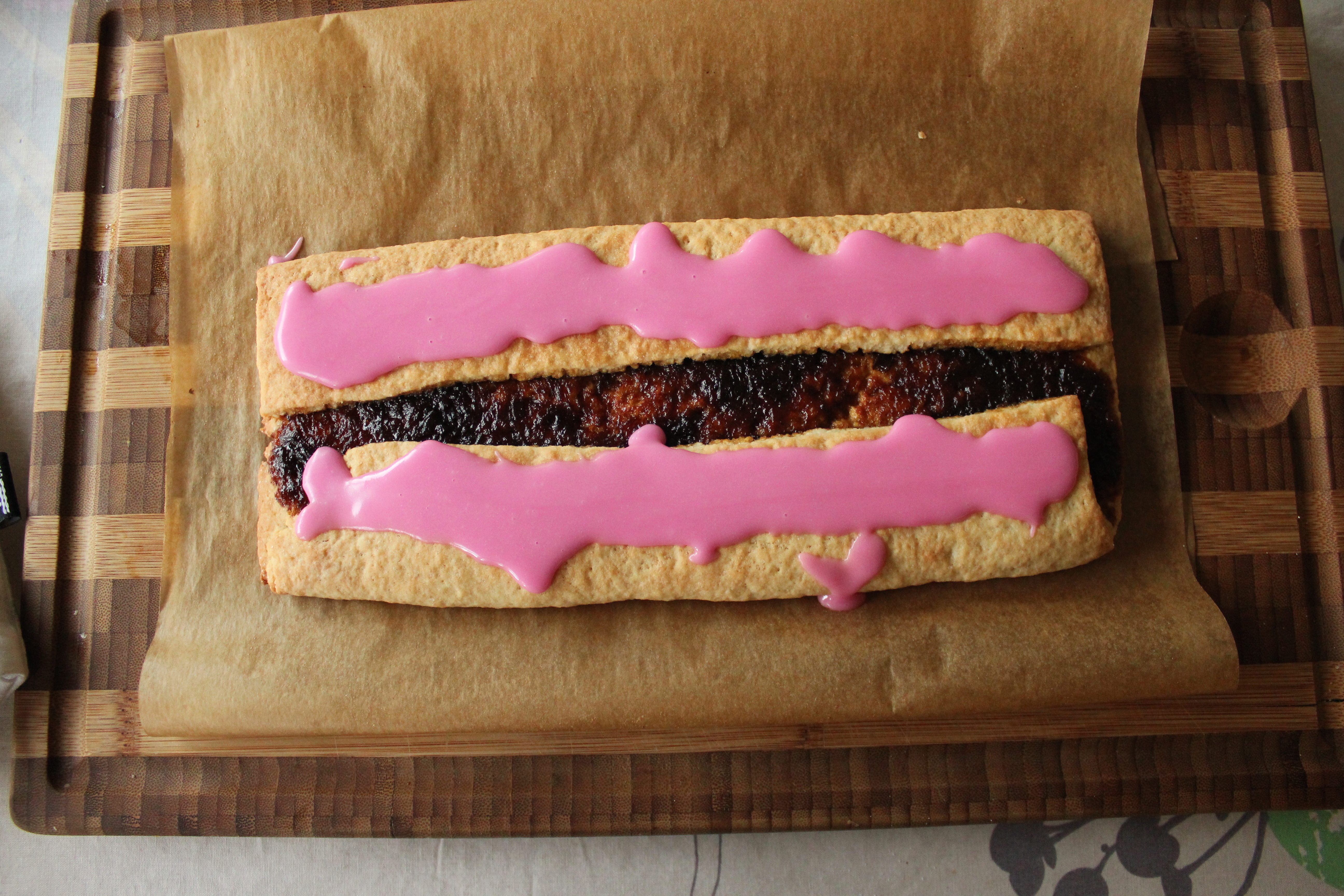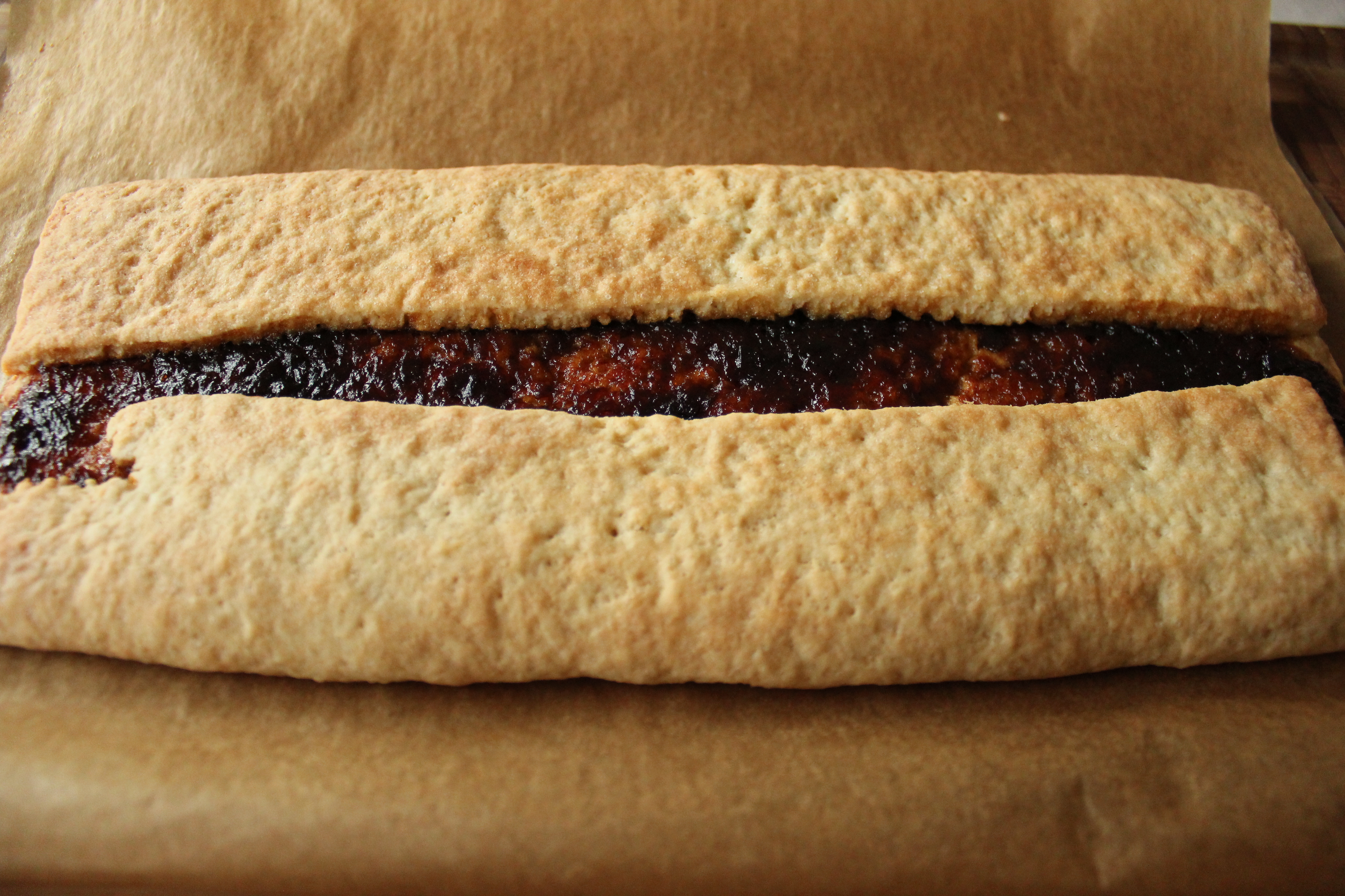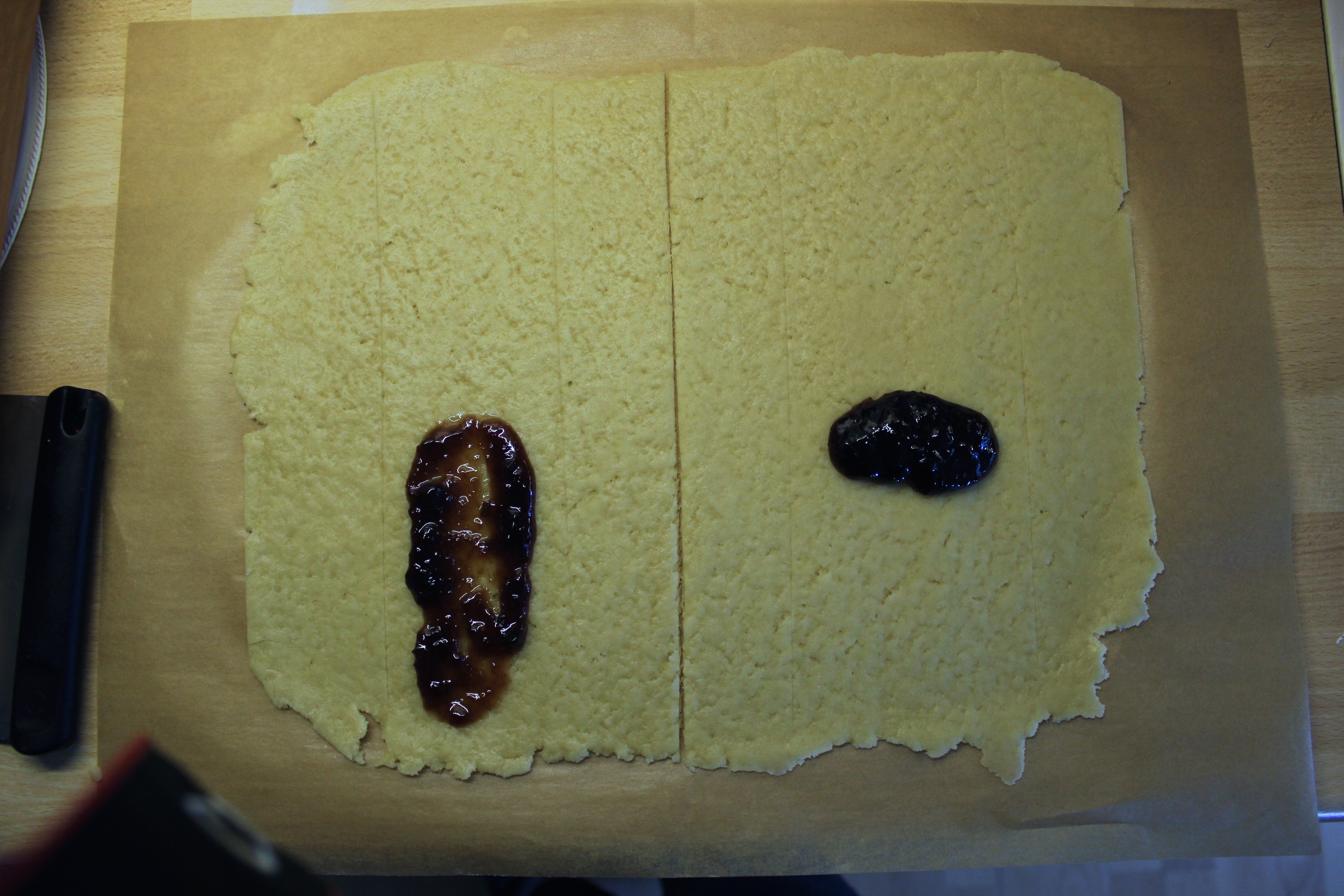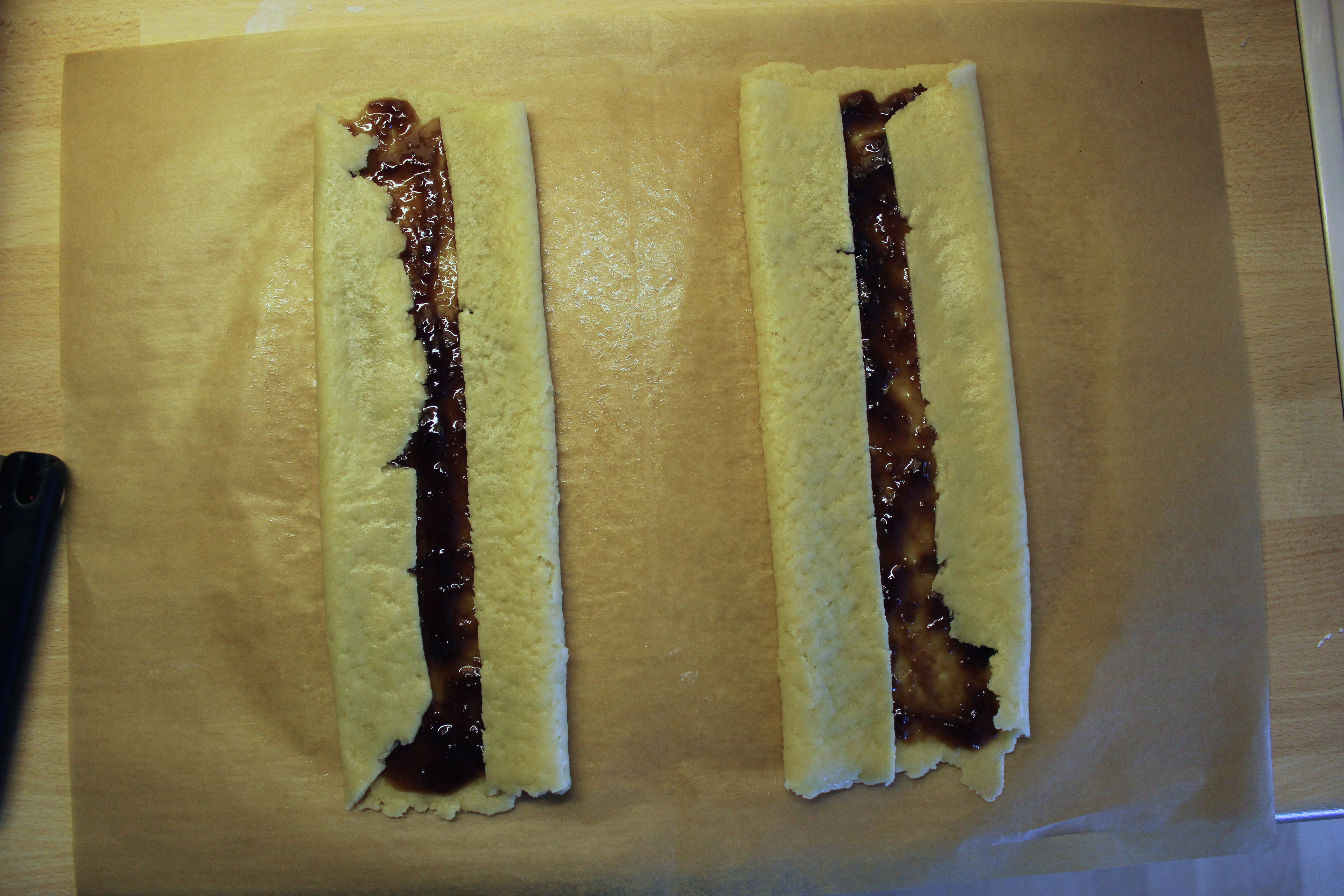 Smyrjið rabarbara sultunni í miðjuna á deiginu og flettið síðan sitthvorri hliðinni yfir sultuna. Ég skildi eftir smá gat en mamma sagði mér að amma var vön að láta degið mætast en svo gliðnaði það í bakstri.