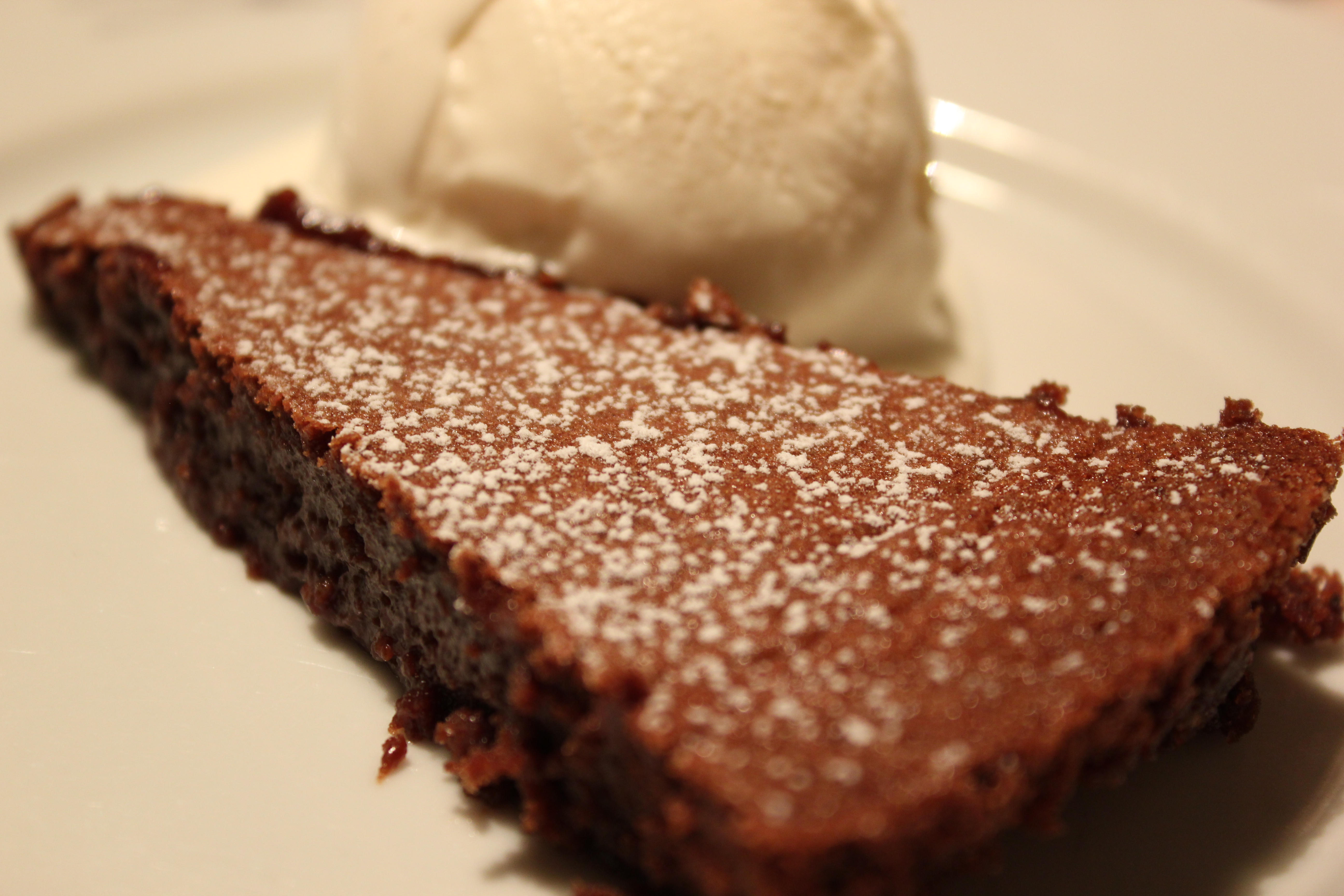 Skreytið með því að sáldra flórsykri yfir. Við borðuðum kökuna með vanilluís en það er örugglega líka mjög gott að borða hana með hindberjum.