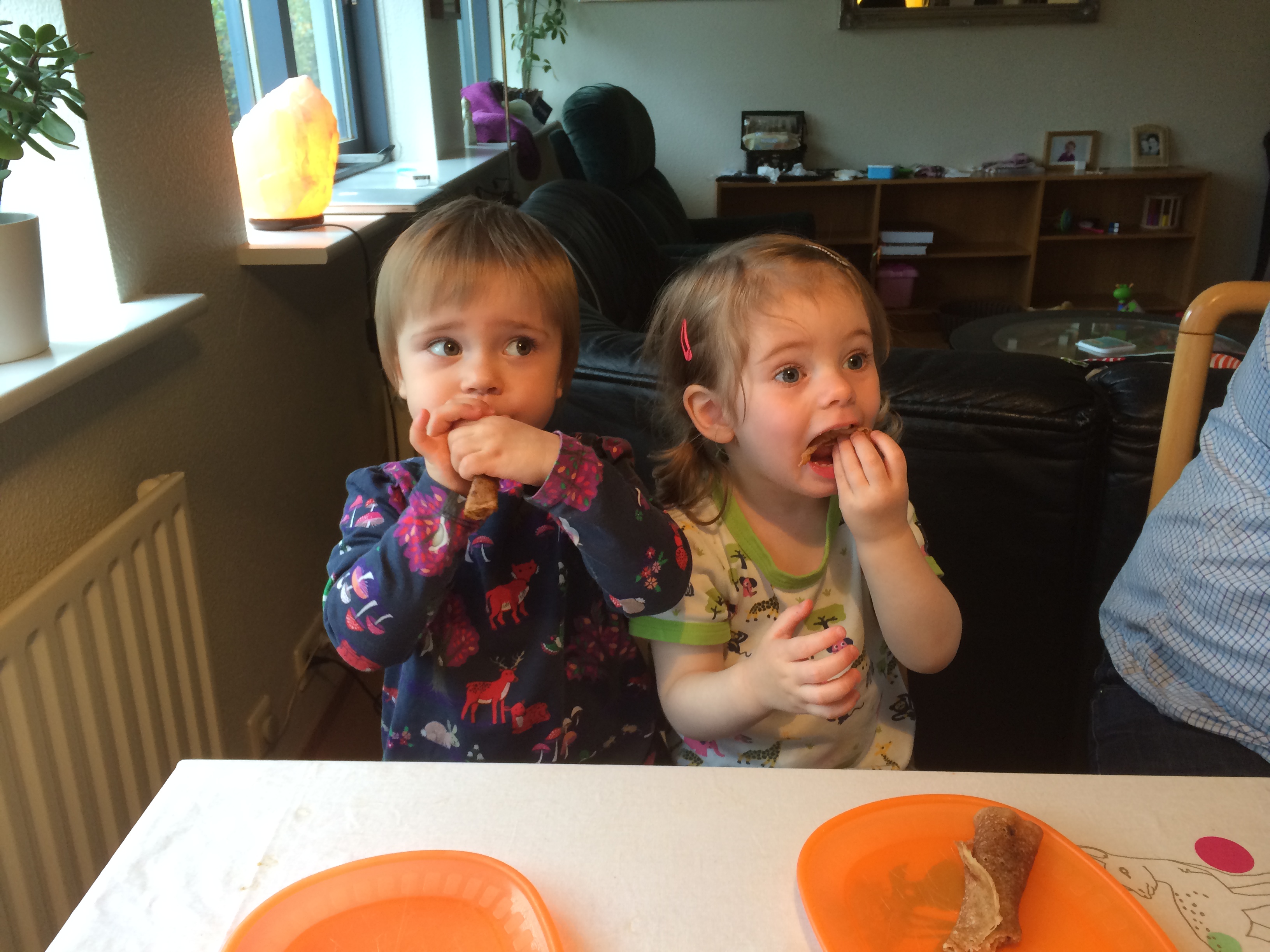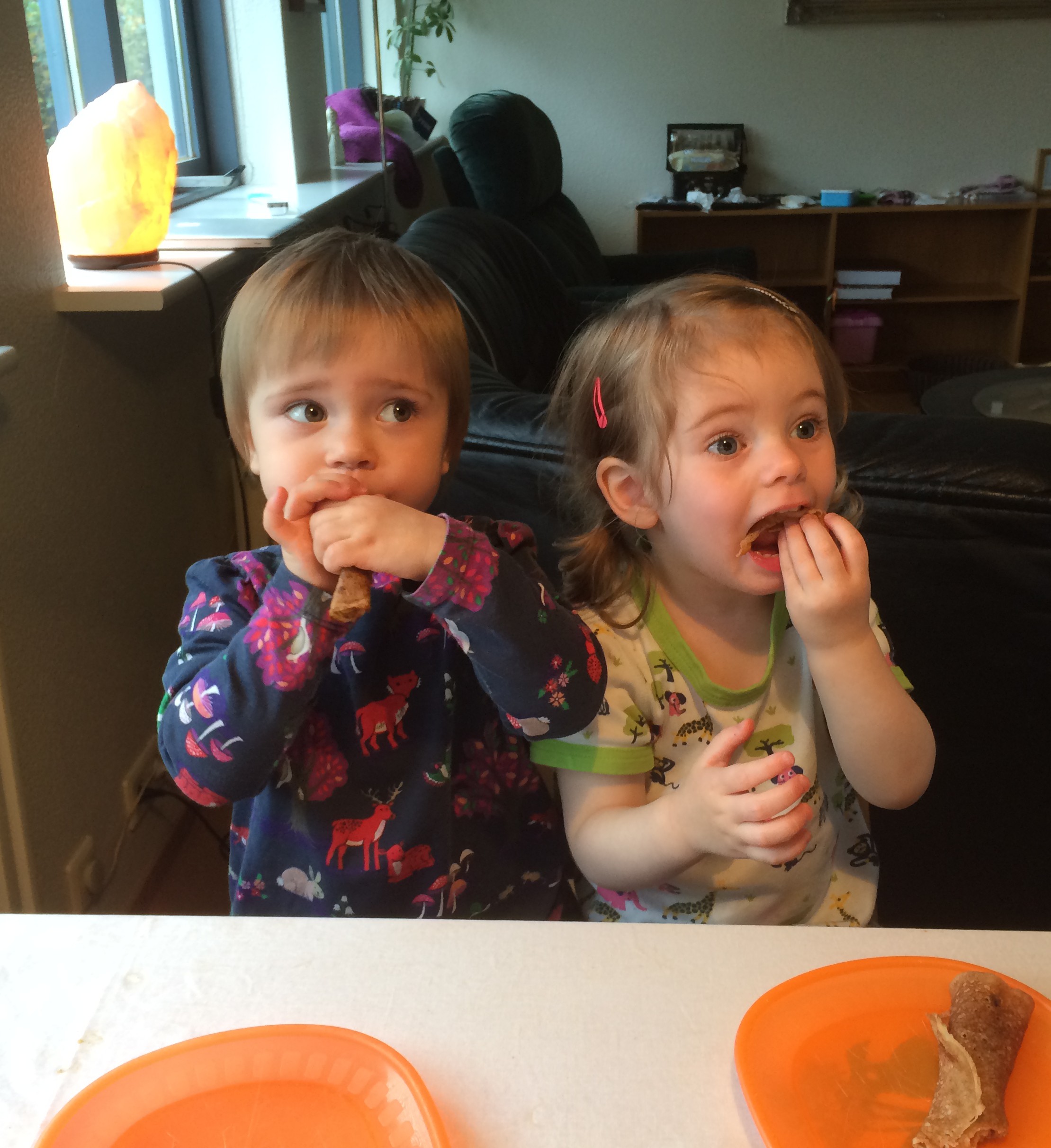 Góð vinkona mín og börnin hennar komu í heimsókn til okkar í nokkra daga 🙂 Þegar var komið að því að halda heim á leið fannst mér kjörið að skella í pönnukökur svo þau færu héðan södd og sæl. Pönnukökur eru jú alltaf vinsælar hjá ungum sem öldnum og ófáar runnu ljúft niður hjá tveggja ára vinkonum 🙂