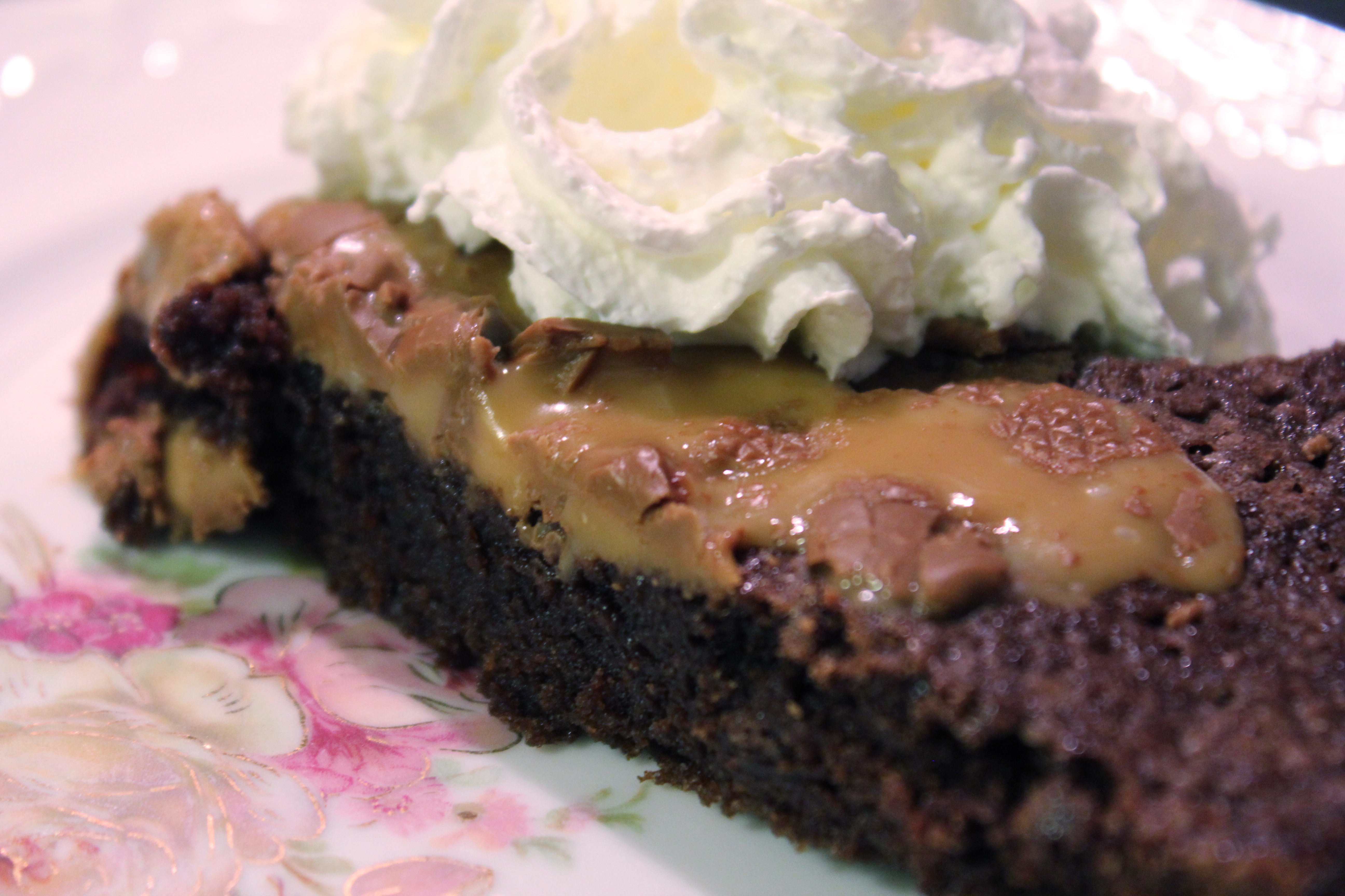 Smyrjið 22 – 24 cm springform. Hellið deiginu í formið og bakið í 20 – 30 mínútur. Takið kökuna út 3 mínútum áður en hún er fullbökuð og dreifið afganginum af karamellunum yfir, setjið aftur inn í ofninn og látið karamellurnar bráðna. Látið kökuna kólna aðeins áður en hún er borin fram, hún á að vera eins og hún sé næstum óbökuð í miðjunni – kladdkökur stífna svo þegar þær kólna. Berið fram með þeyttum rjóma.