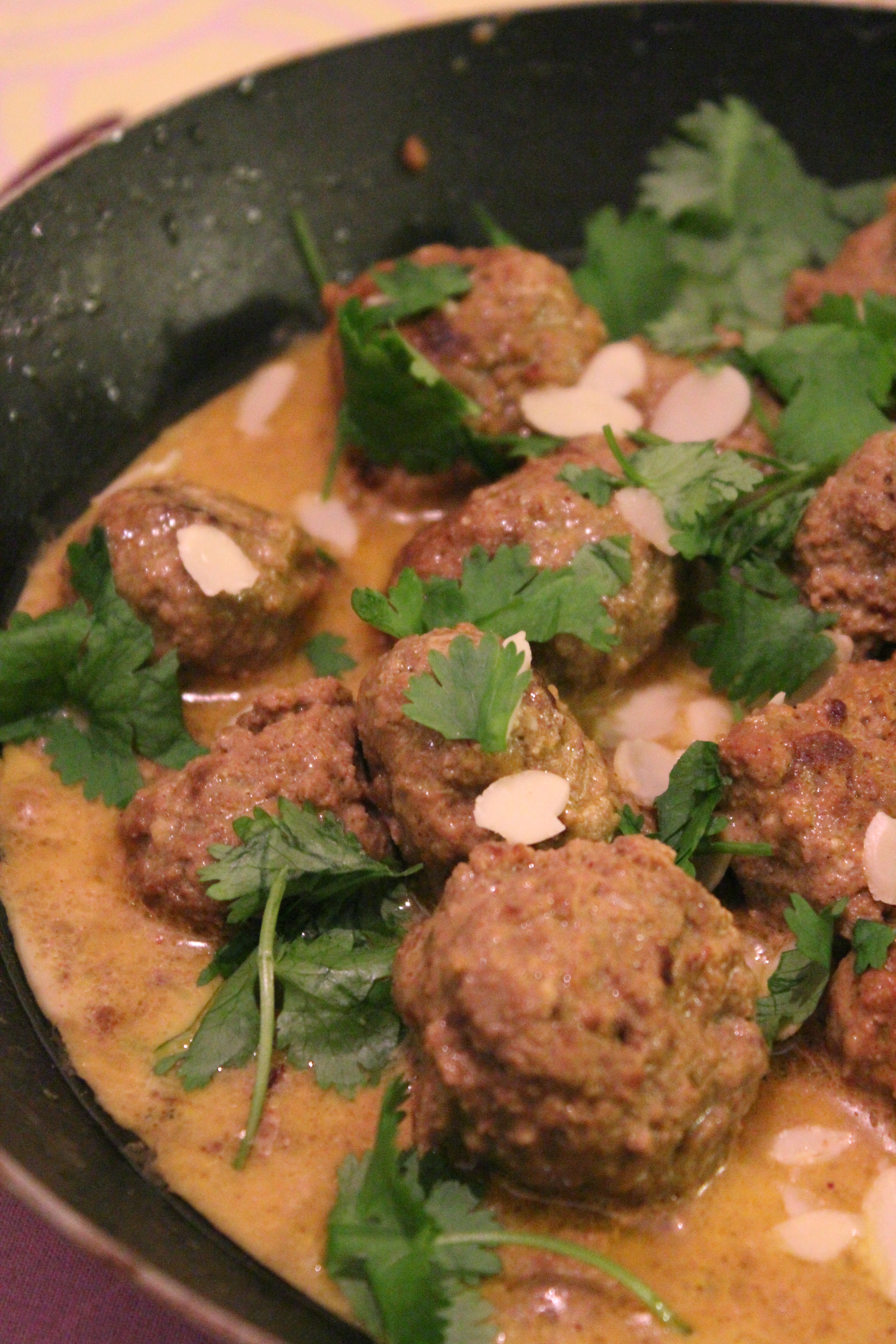 Binni tók sig til og eldaði þessar indversku kjötbollur (sem kallast að vísu „óhelgar kjötbollur“ í bókinni…) upp úr henni handa okkur um síðustu helgi og mér fannst þær alveg ótrúlega góðar og ekki var verra að börnin hámuðu þær í sig líka. Við bárum þær fram með naan-brauð, myntu-raítu og mango-chutney (í bókinni er reyndar uppskrift að heimagerðu mango-chutney sem er þokkalega komið á to-do listann!). Uppskriftinni að naan-brauðinu mun ég deila seinna í vikunni.