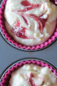 Þeytið saman rjómaosti, smjöri og sykri þangað til vel blandað, ca. 3 mínútur. Bætið eggjunum út í, einu í einu og þeytið vel á milli. Bætið þurrefnunum út í tveimur skömmtum og setjið mjólkina og vanilludropana út í á milli. Blandið vel saman. Setjið í muffinsform og fyllið u.þ.b. 2/3 af forminu. Setjið nokkrar doppur af hindberjasultu á hverja köku og notið svo hníf til að “swirla” sultunni í hverja köku (þ.e. dragið hnífinn í gegnum sultana). Bakið í 25 – 30 mínútur eða þar til prjónn kemur hreinn upp úr kökunni.