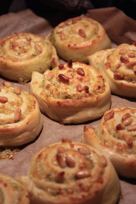 Fletjið deigið út í ferhyrning, ca. ¾ – 1 cm þykkan (eins og þegar maður gerir snúða). Smyrjið pestóinu á deigið og stráið ostinum yfir. Rúllið deiginu upp og skerið svo í sneiðar, ca. 2 cm þykkar.