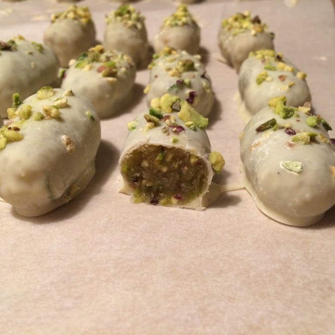 Bræðið súkkulaðið yfir vatnsbaði og þekjið marsipanið, stráið hnetum ofan á og látið súkkulaðið stirðna.
