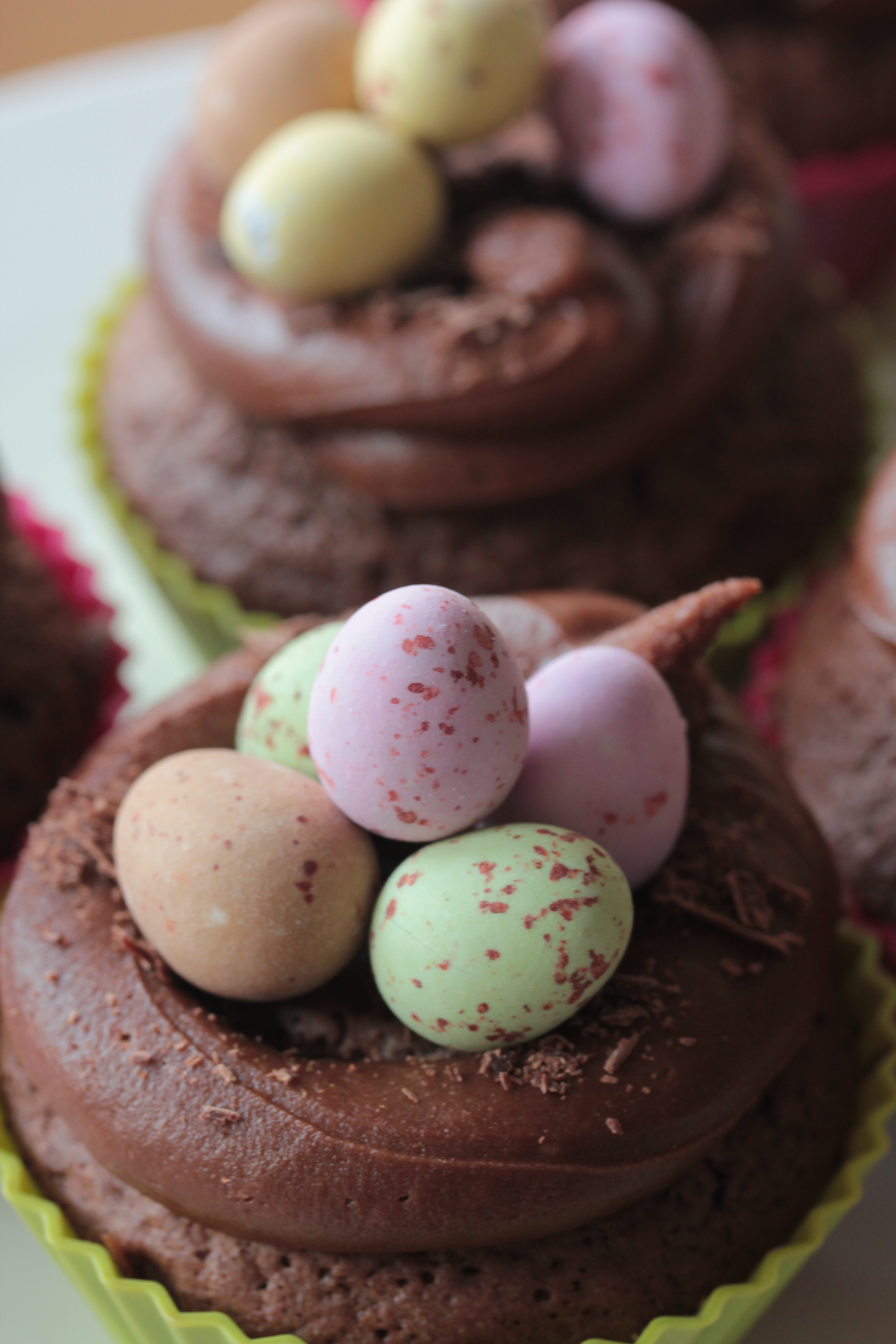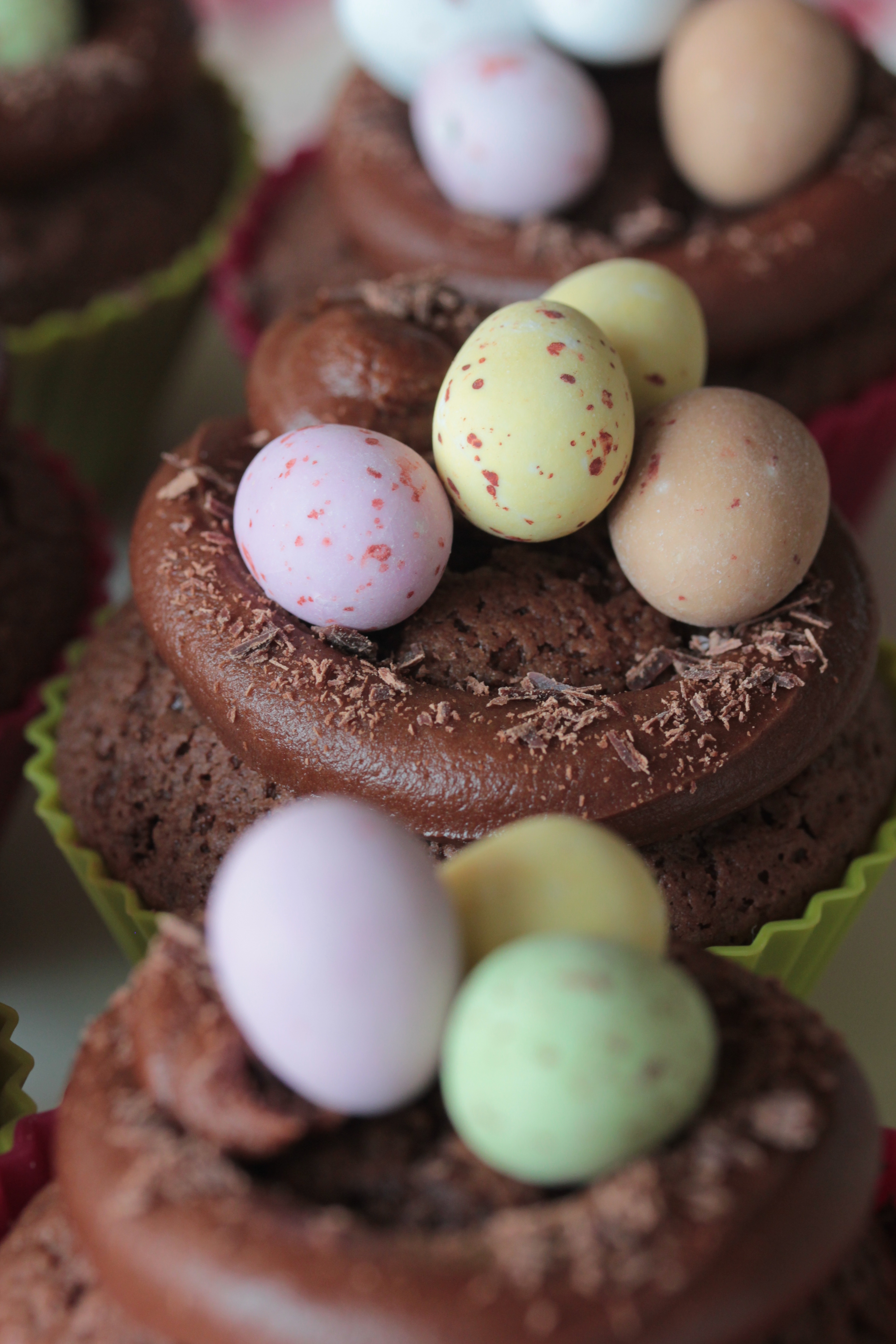 Bræðið smjör og súkkulaði saman í potti. Hrærið vel og bætið svo flórsykrinum út í. Ef kremið er of þykkt, notið þá vatn eða kallt kaffi til að mýkja það aðeins. Sprautið hring (hreiðri) á muffuinsið. Setjið nokkur egg í miðjuna á hreiðrinu og setjið súkkulaðispæni á kantana.