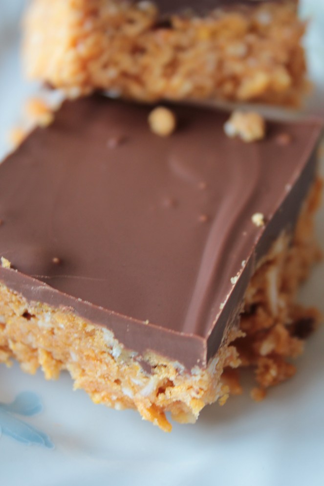 Hvað um það – hér kemur uppskrift að Snickersbitum sem ég hef séð út um allt á sænska internetinu, greinilega mikið vinsælir. Það eru til fjöldamargar útgáfur af þeim en ég ákvað að prófa þessa og verð að viðurkenna að þetta var óþarflega gott. Þetta er auðvitað bara hnetusmjörsútgáfa af rice krispies-bitum eða döðlugott og mjög skemmtileg til tilbreytingar.