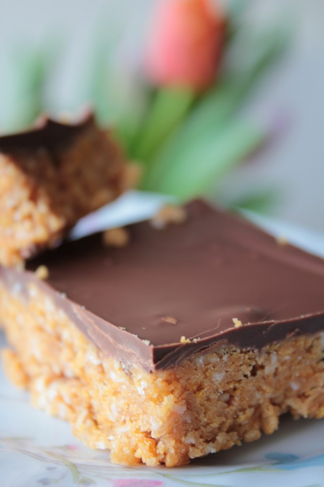 Setjið í formið. Bræðið súkkulaðið og dreifið yfir kökuna. Látið kólna alveg áður en kakan er skorin í bita.